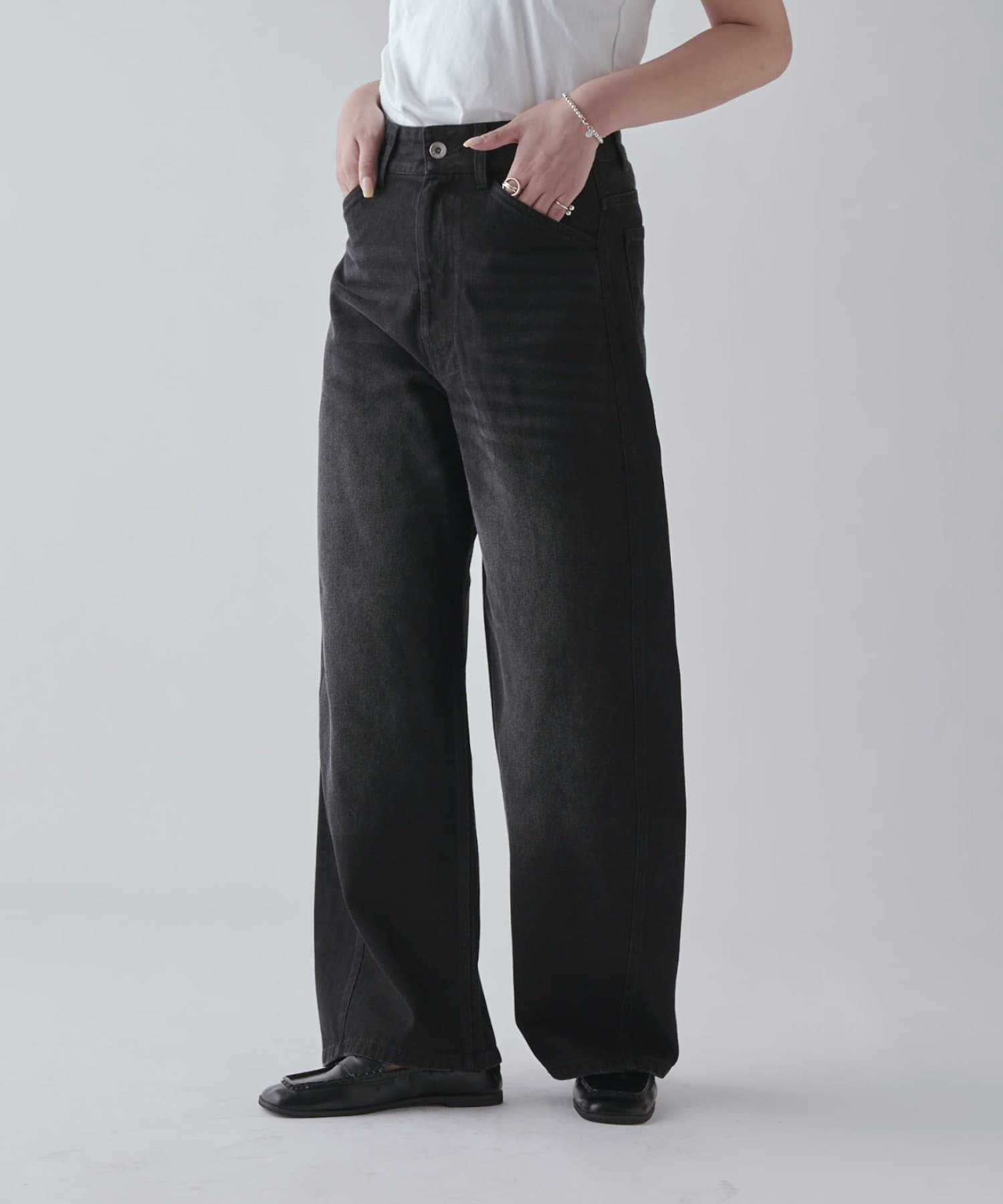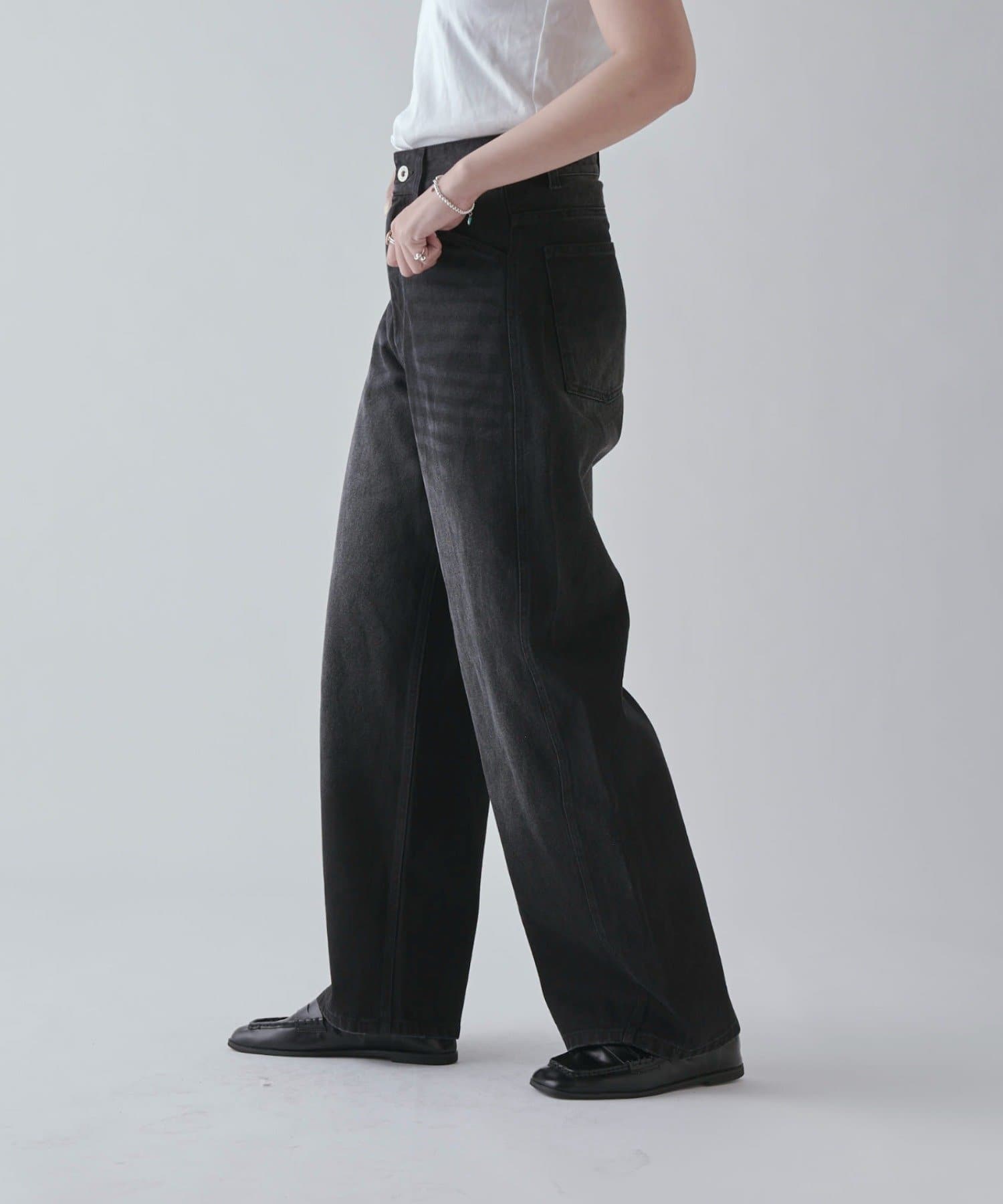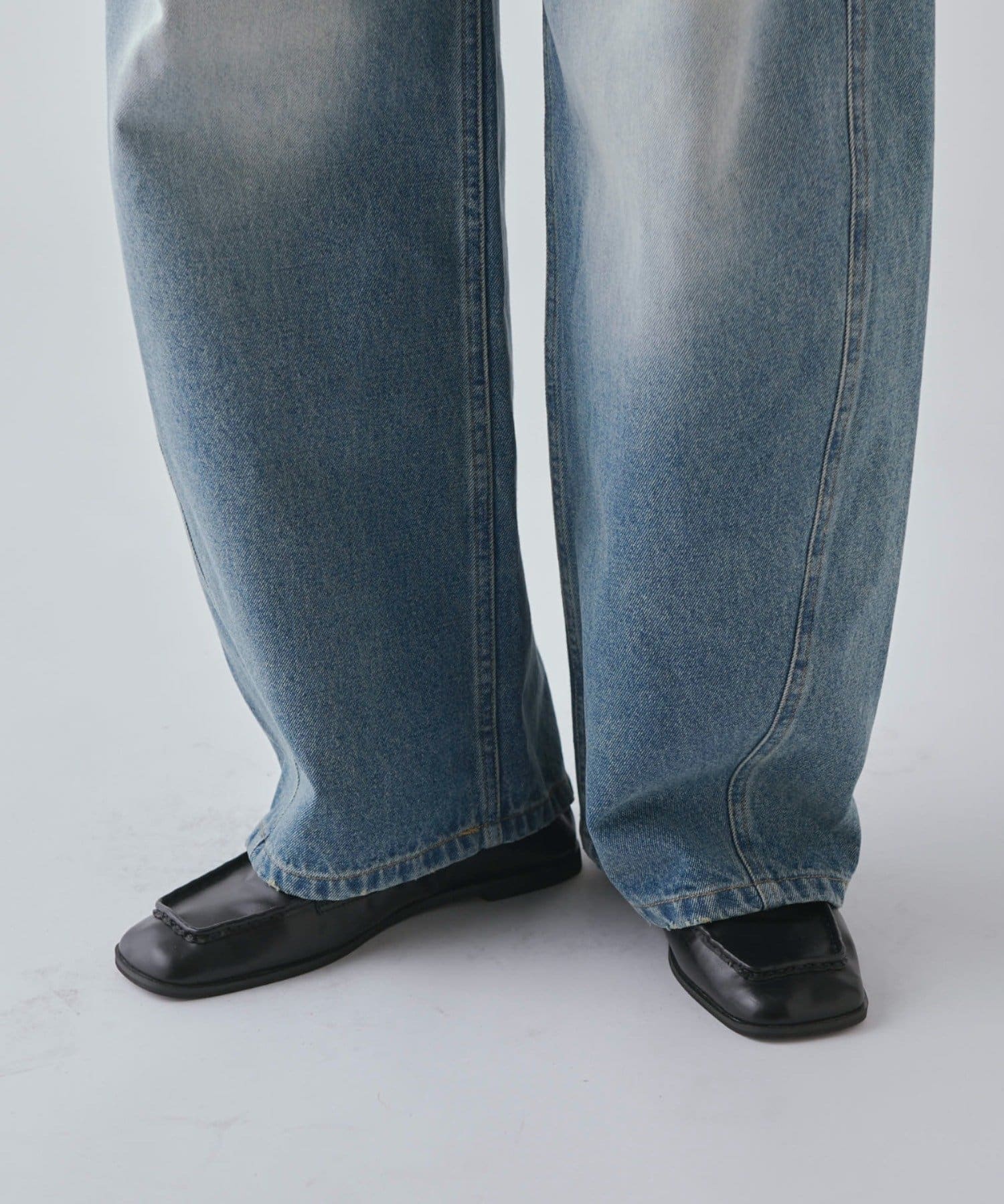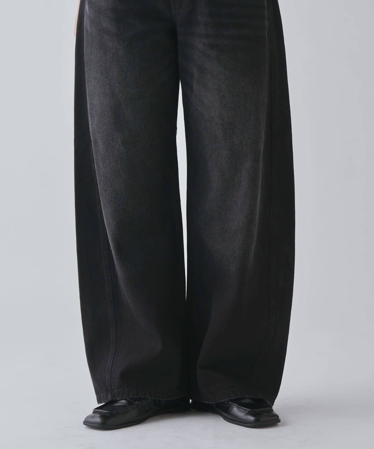 裾にかけてカーブしたレッグラインが特徴的なデニムパンツで、足のラインを気にすることなくお召いただけます。