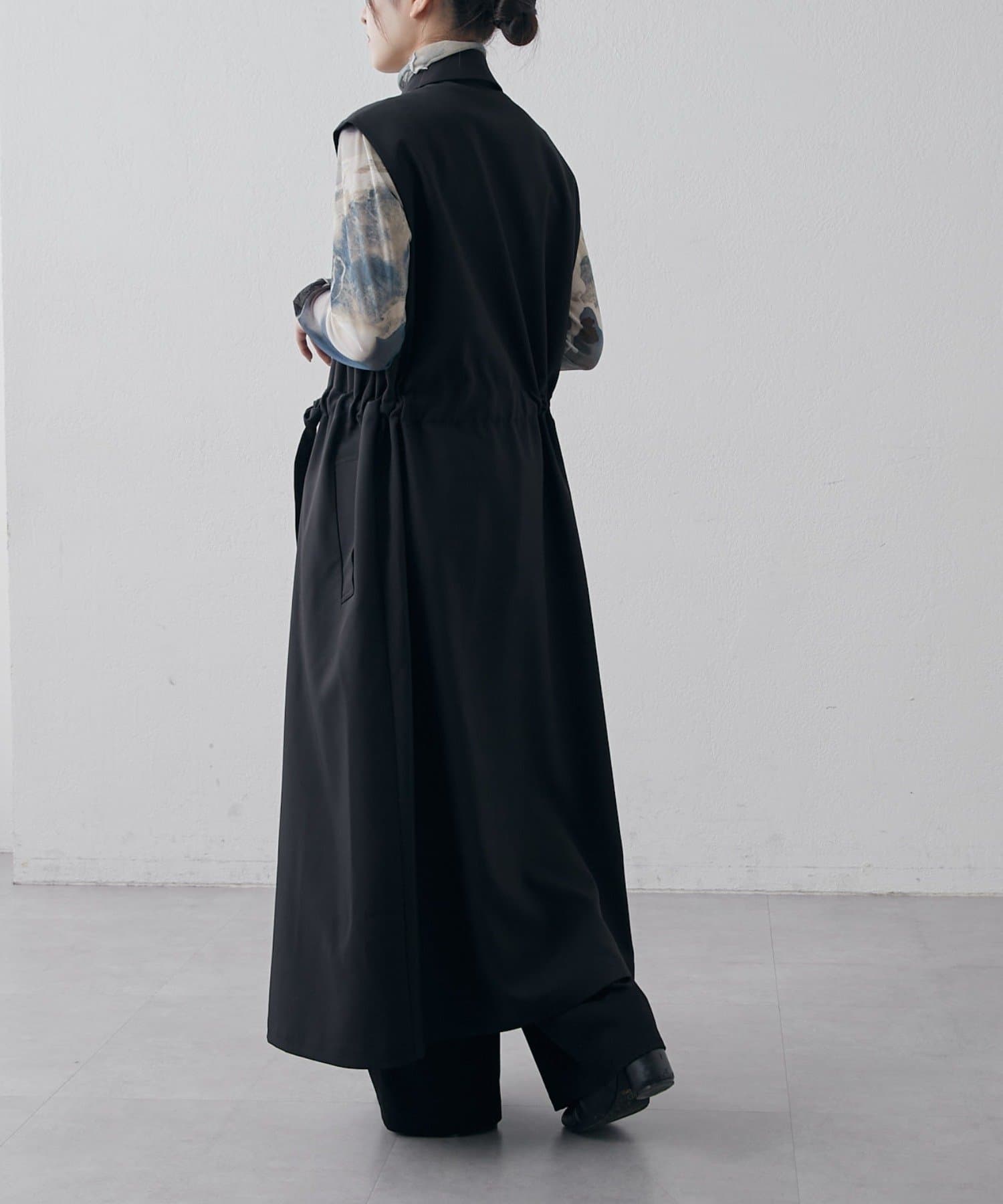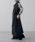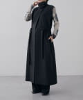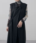 ショート丈のジャケットとロングジレを重ねて着ることで、ロングコートに見えるデザイン。