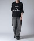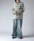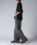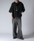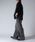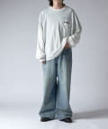通常はゆったりとしたデニムを作る際には、膝下からややテーパードをかけており、ストレートシルエットに収まるように調整しますが、こちらのパンツは股上をより深めに取ることで、他にはないワイドシルエットを表現し、スラックスのワイドパンツのような見た目に仕上げました。