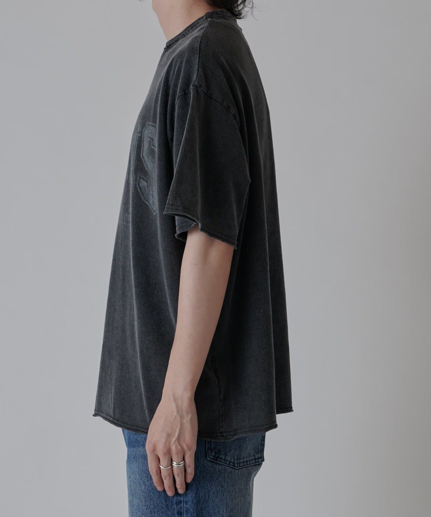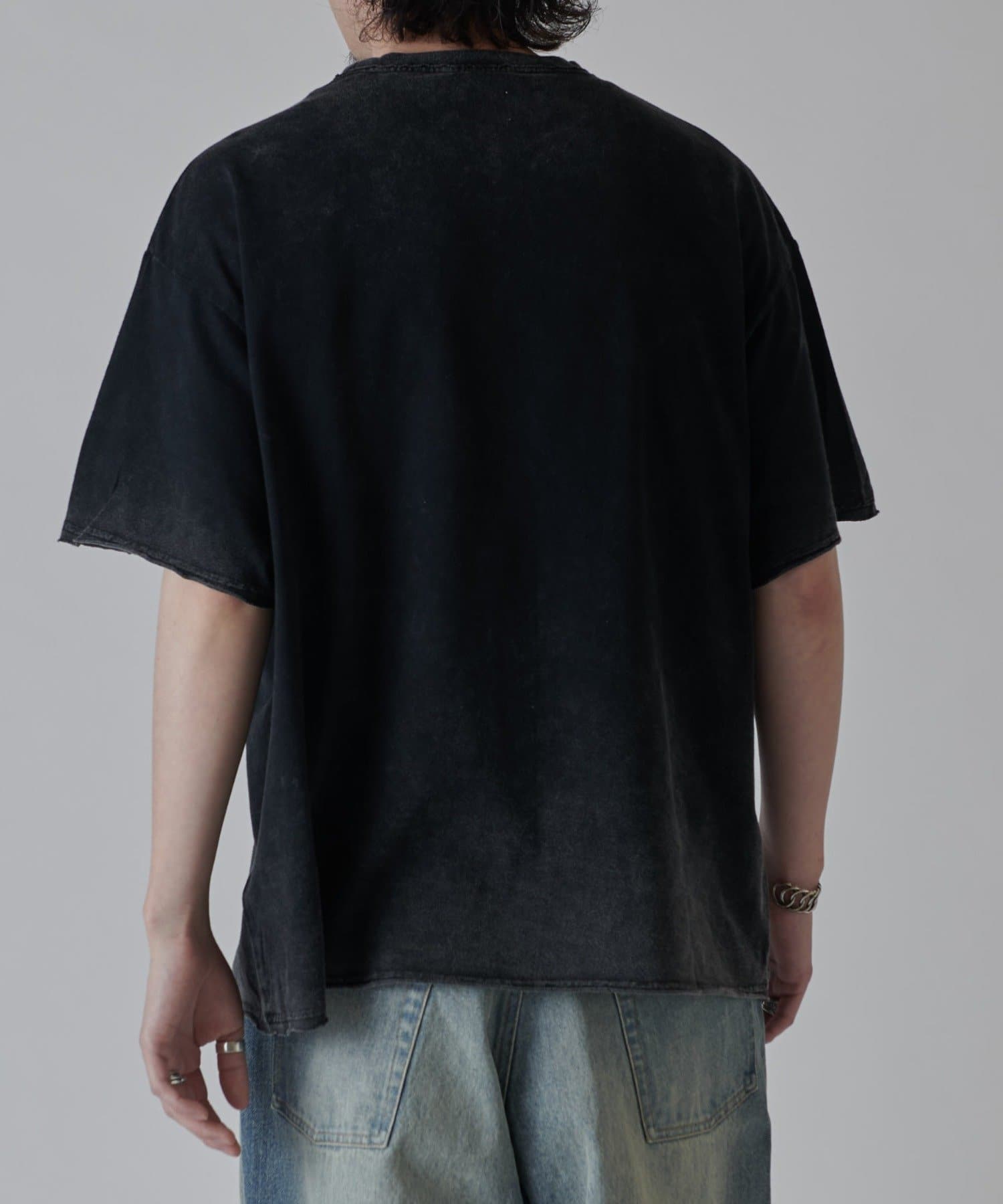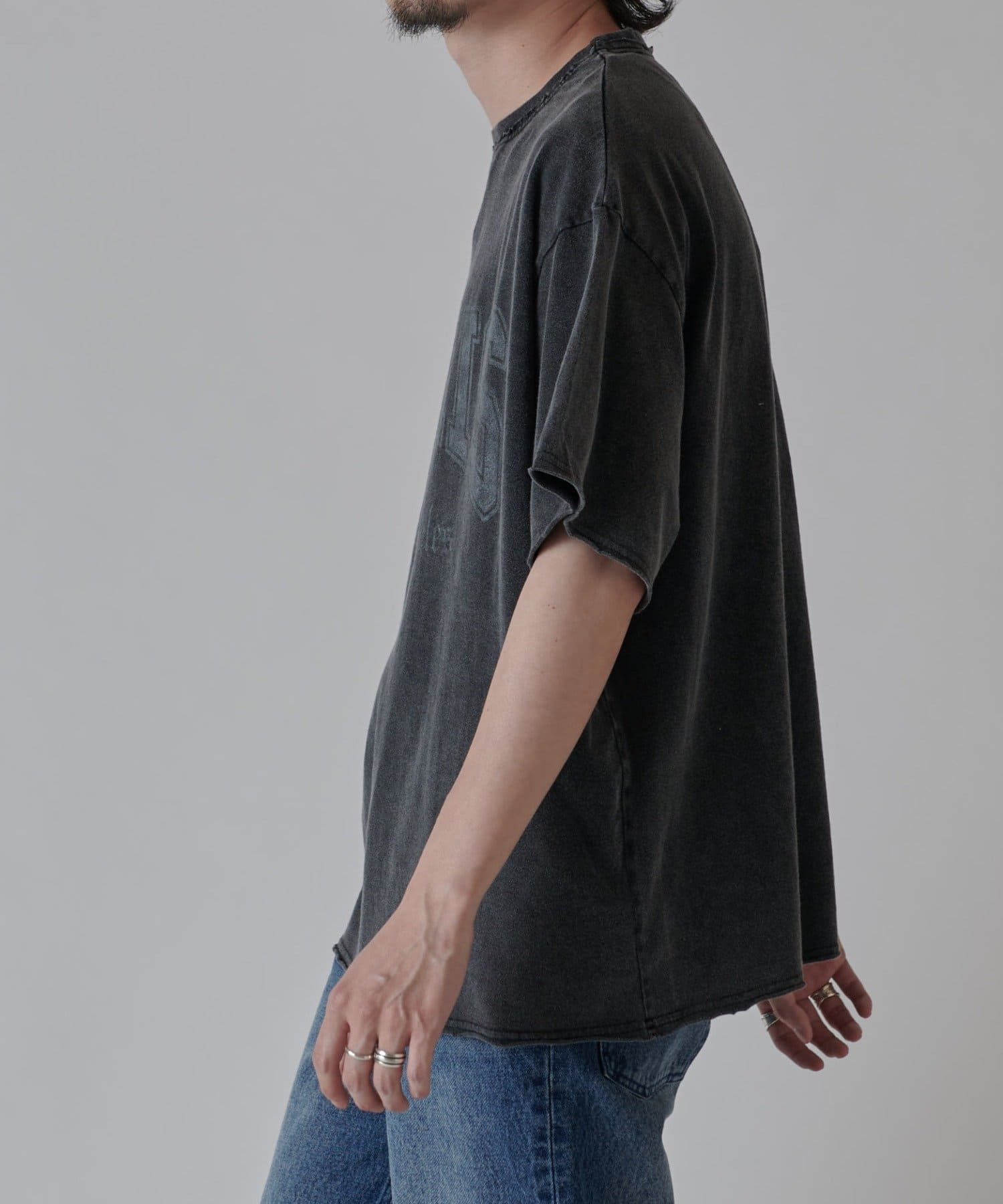 表面のウォッシュ加工に、プリント×ダメージのデザインを施したこちらのTシャツ。サイズは、ややゆったりめのSサイズとオーバーサイズの2XLの2サイズ展開。サイズで差を付けているので、着方も様々なスタイルでお使い頂けます。