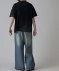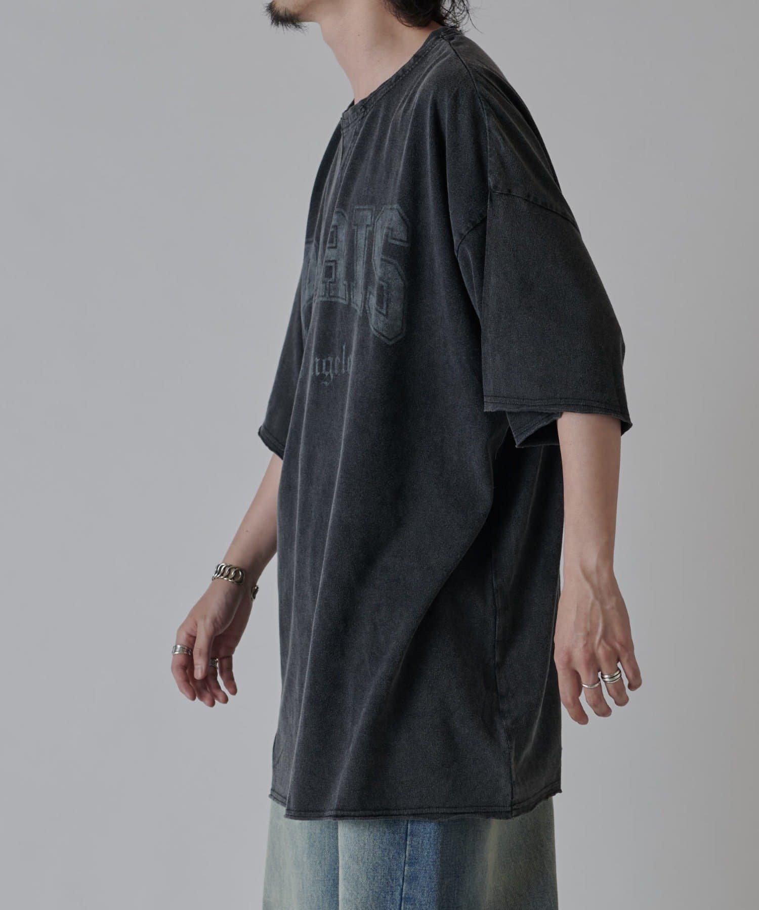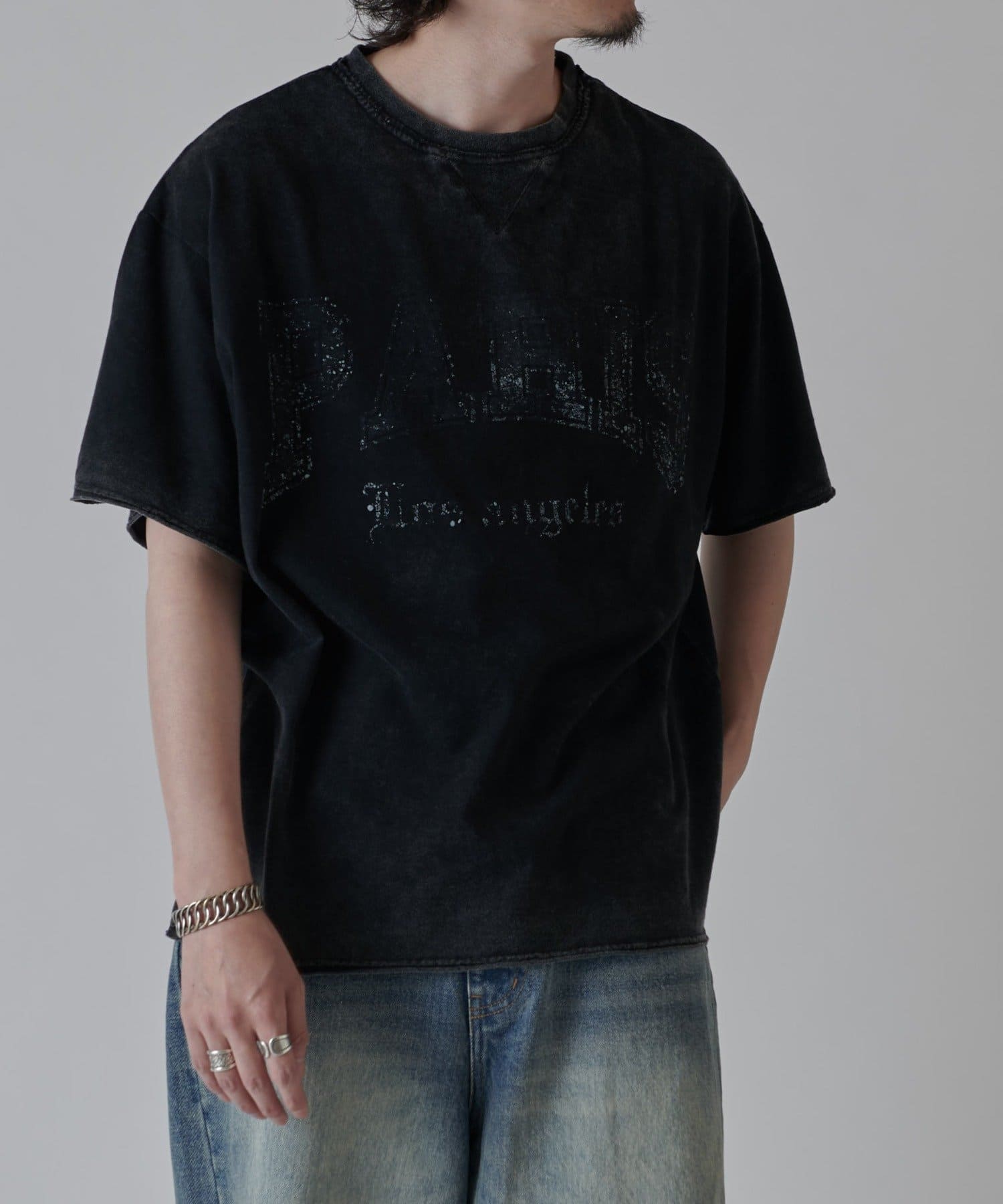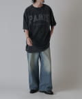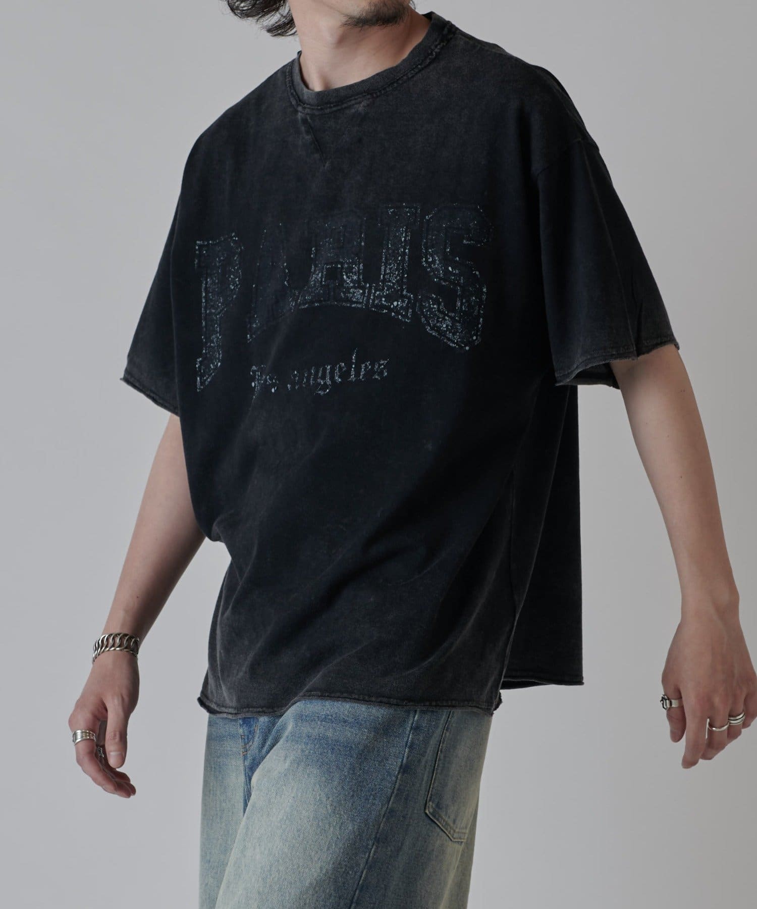 表面のウォッシュ加工に、プリント×ダメージのデザインを施したこちらのTシャツ。サイズは、ややゆったりめのSサイズとオーバーサイズの2XLの2サイズ展開。サイズで差を付けているので、着方も様々なスタイルでお使い頂けます。