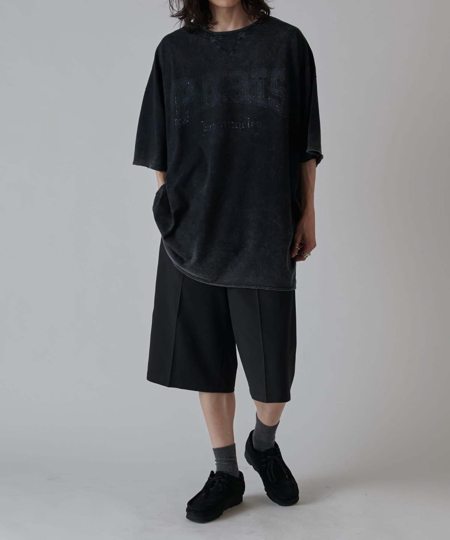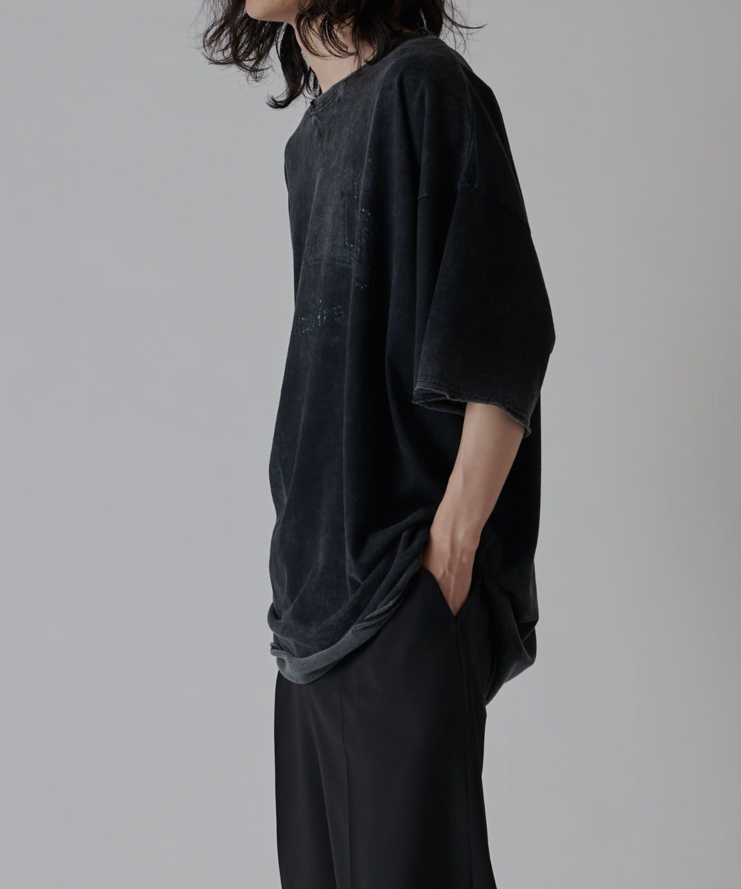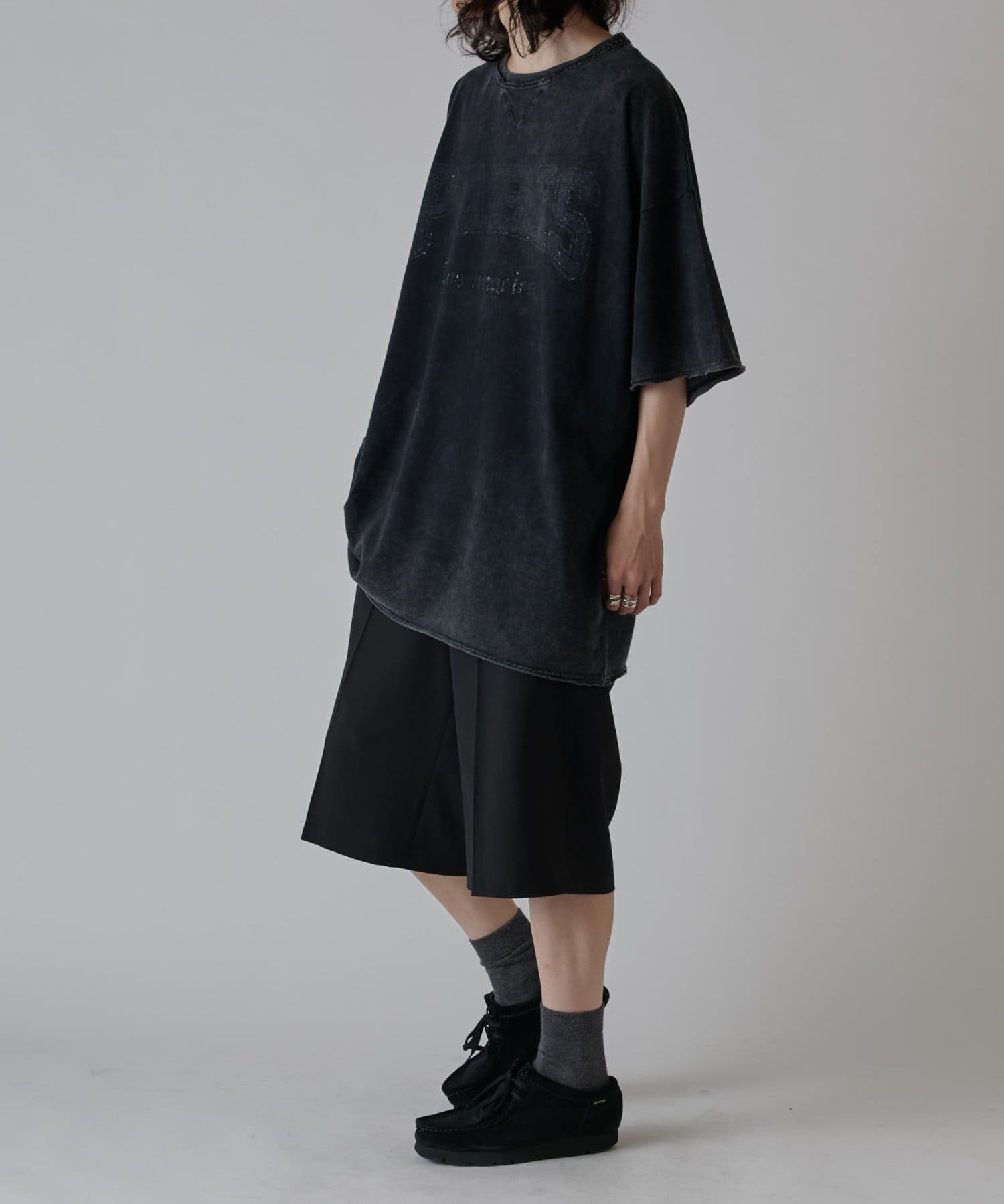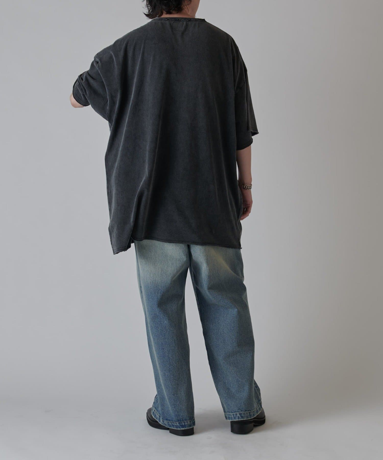 見た目の加工感と、サイズ感がポイントのカットソーなので、ややゆったりのSサイズは、スラックスやフレアパンツにタックインさせたキレイめなスタイルがオススメ。オーバーサイズの2XLはワイドデニムや、カーゴパンツなどのカジュアルなスタイルで合わせて頂くのがオススメ。