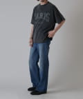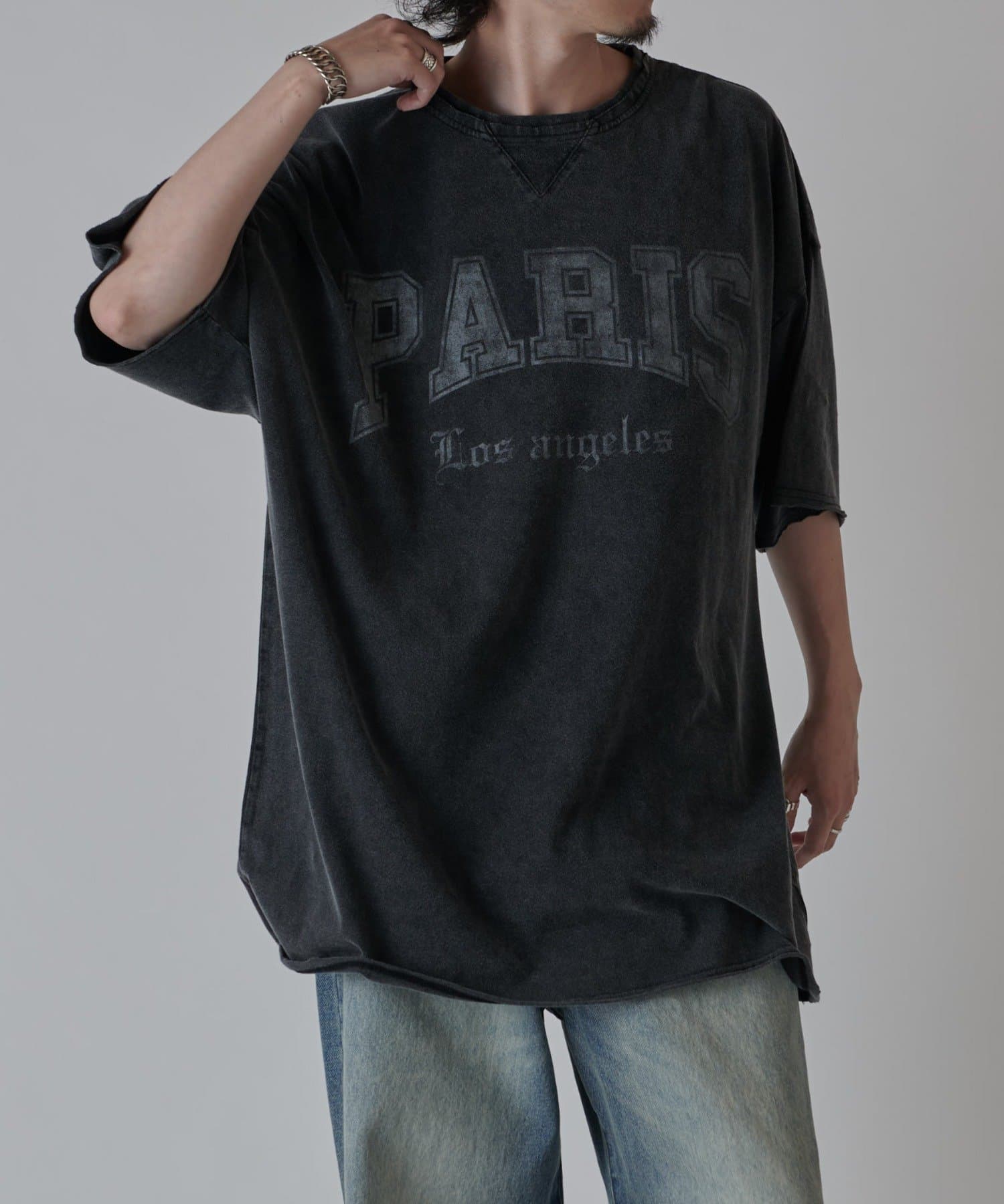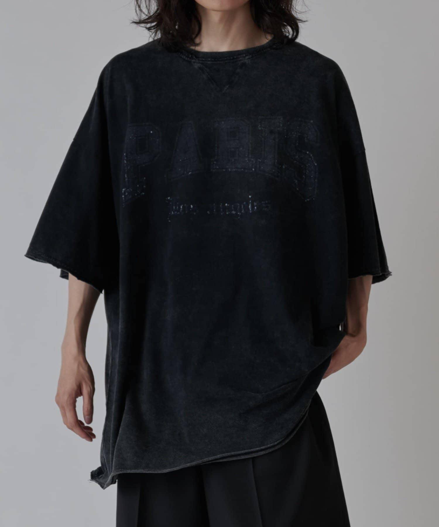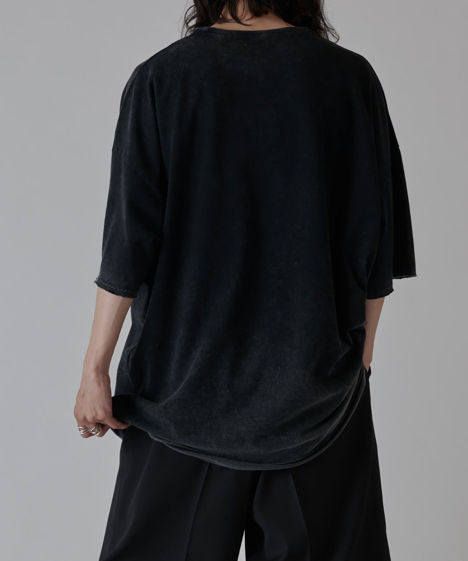 見た目の加工感と、サイズ感がポイントのカットソーなので、ややゆったりのSサイズは、スラックスやフレアパンツにタックインさせたキレイめなスタイルがオススメ。オーバーサイズの2XLはワイドデニムや、カーゴパンツなどのカジュアルなスタイルで合わせて頂くのがオススメ。