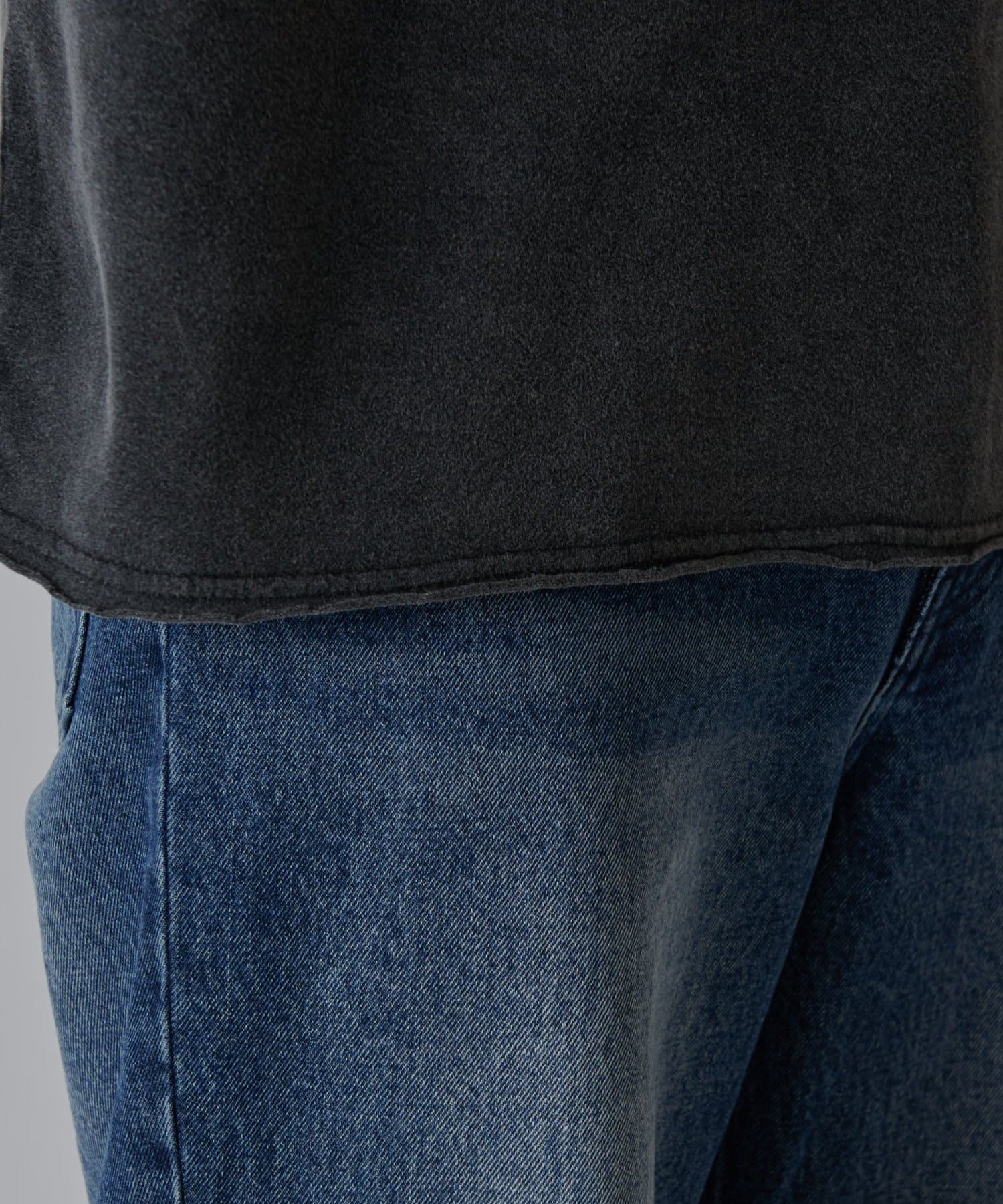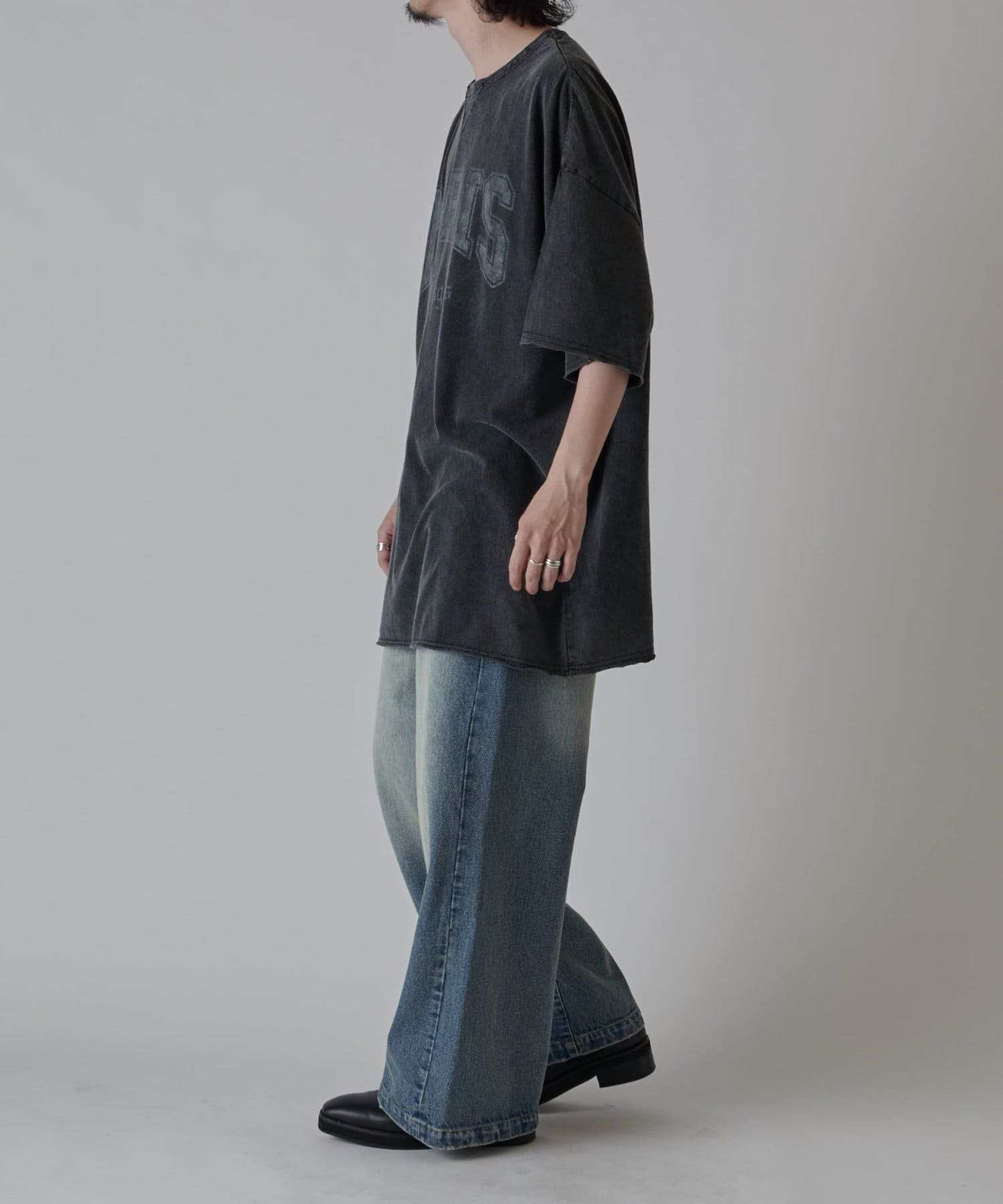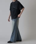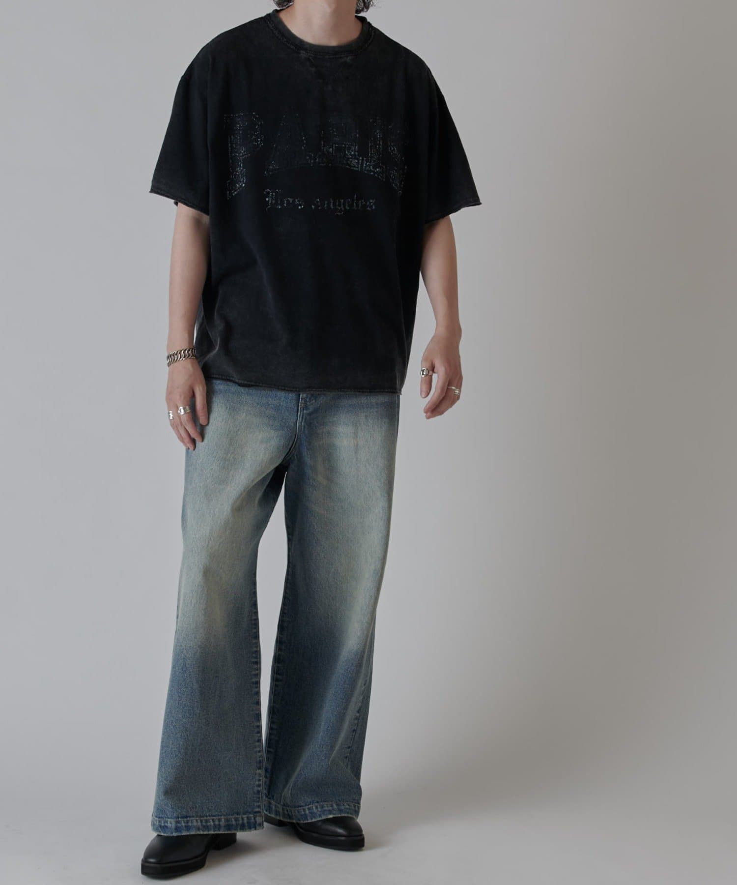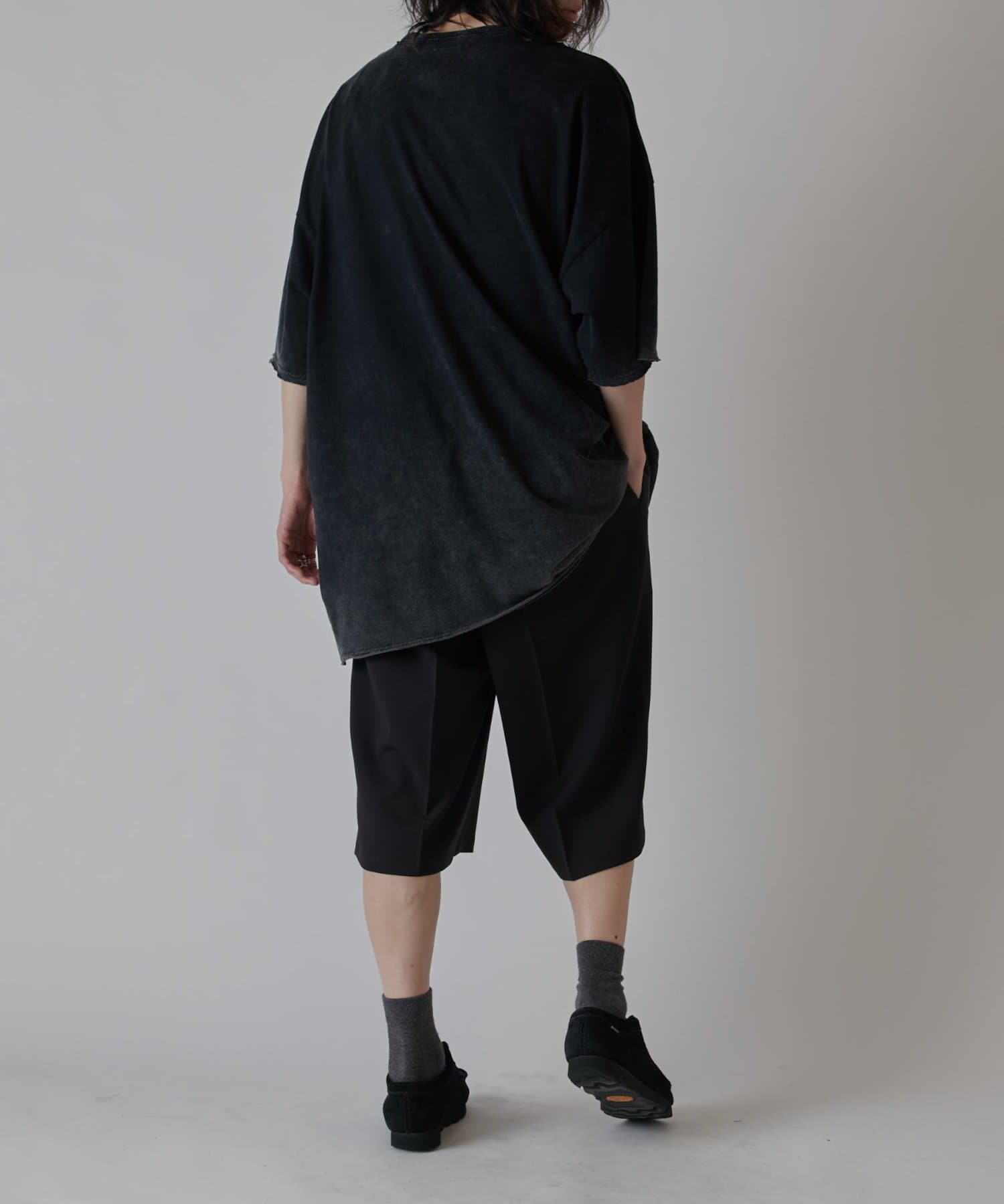 見た目の加工感と、サイズ感がポイントのカットソーなので、ややゆったりのSサイズは、スラックスやフレアパンツにタックインさせたキレイめなスタイルがオススメ。オーバーサイズの2XLはワイドデニムや、カーゴパンツなどのカジュアルなスタイルで合わせて頂くのがオススメ。
