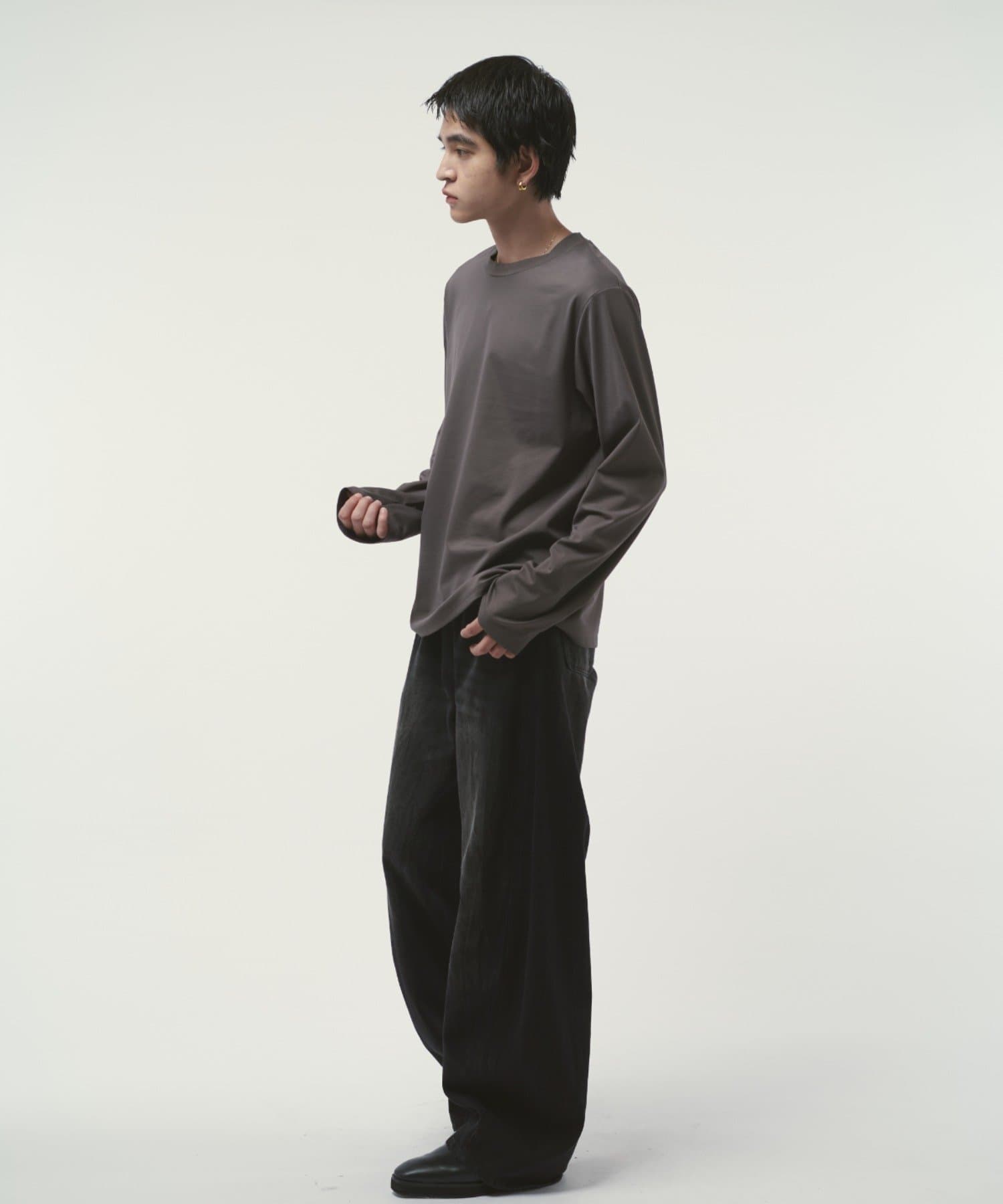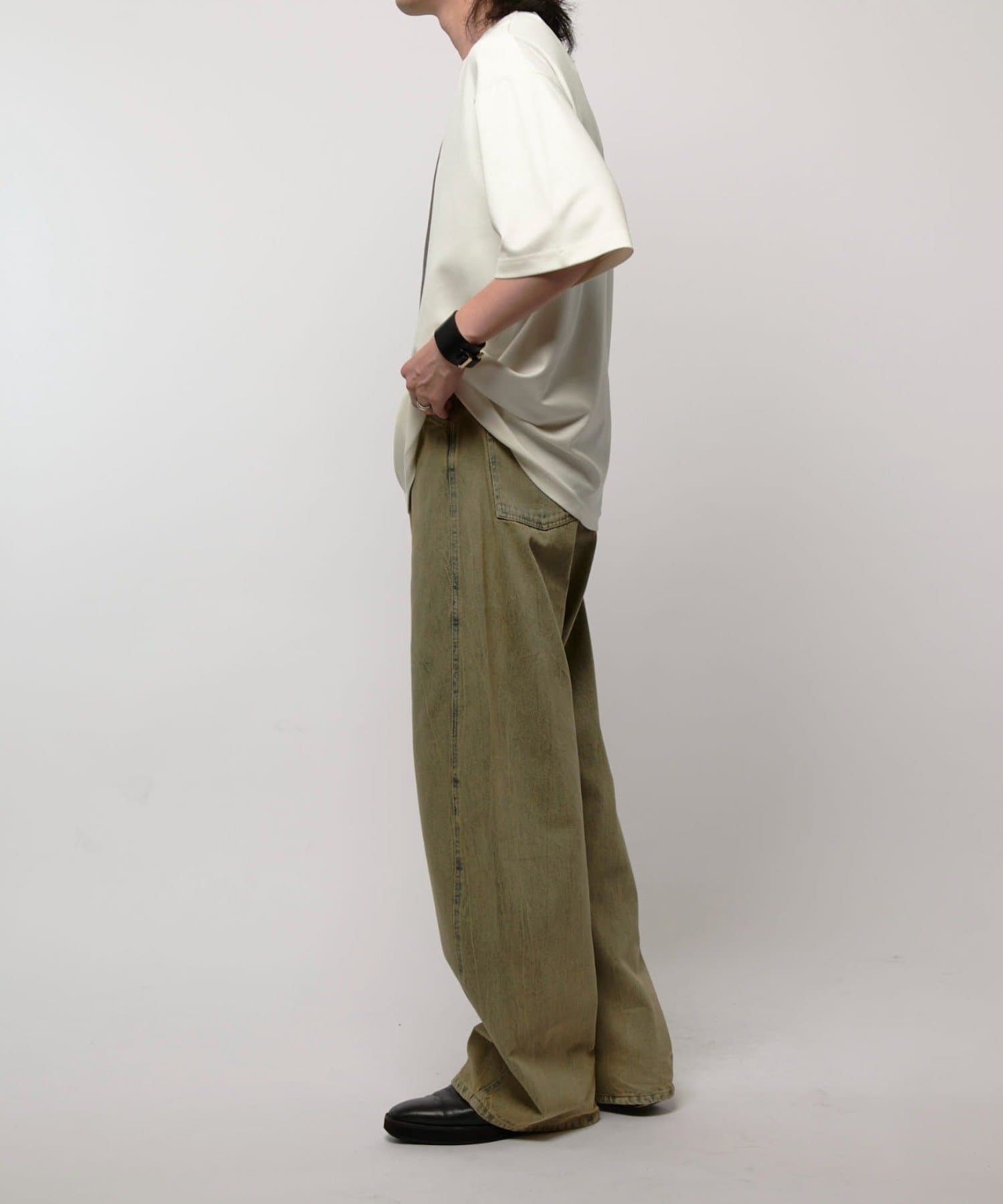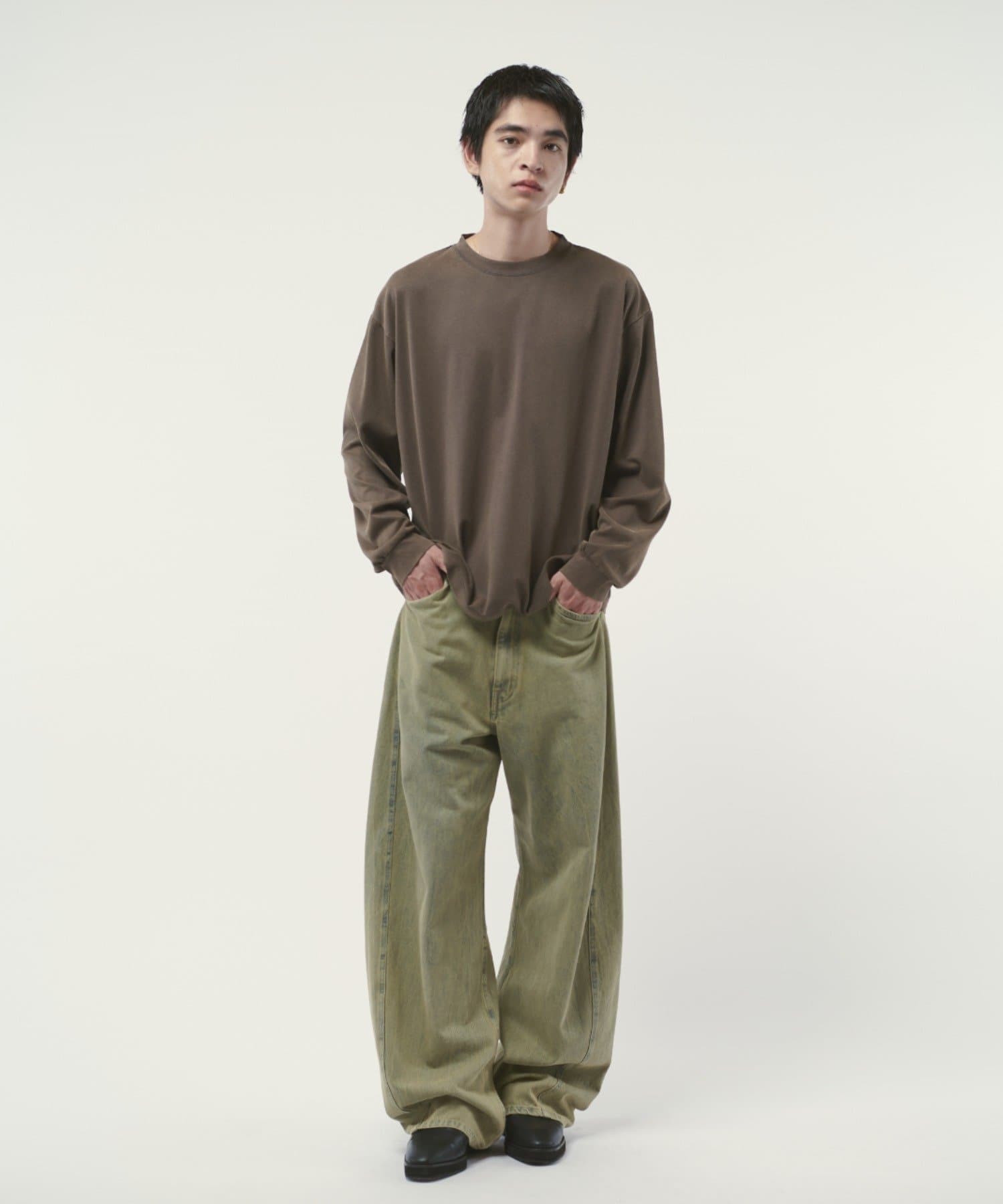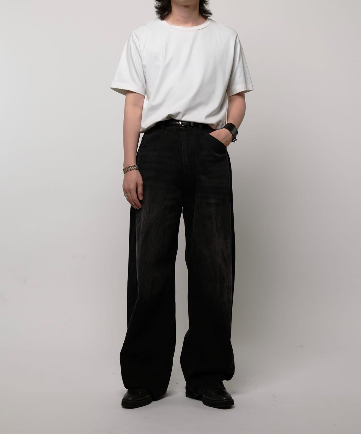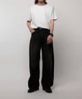 カーブシルエットが特徴的なデニムパンツなので、ベーシックなTシャツや、シャツに組み合わせたキレイめカジュアルなスタイルがオススメです。