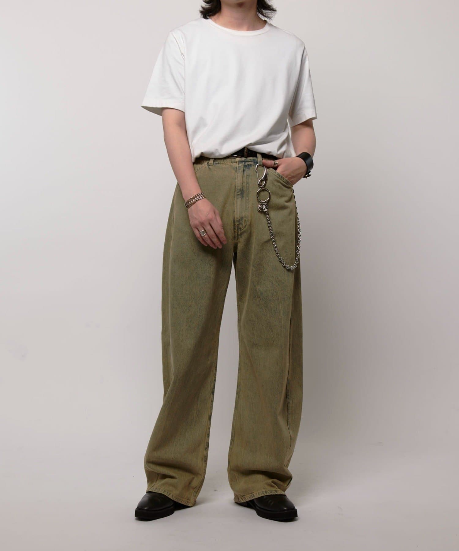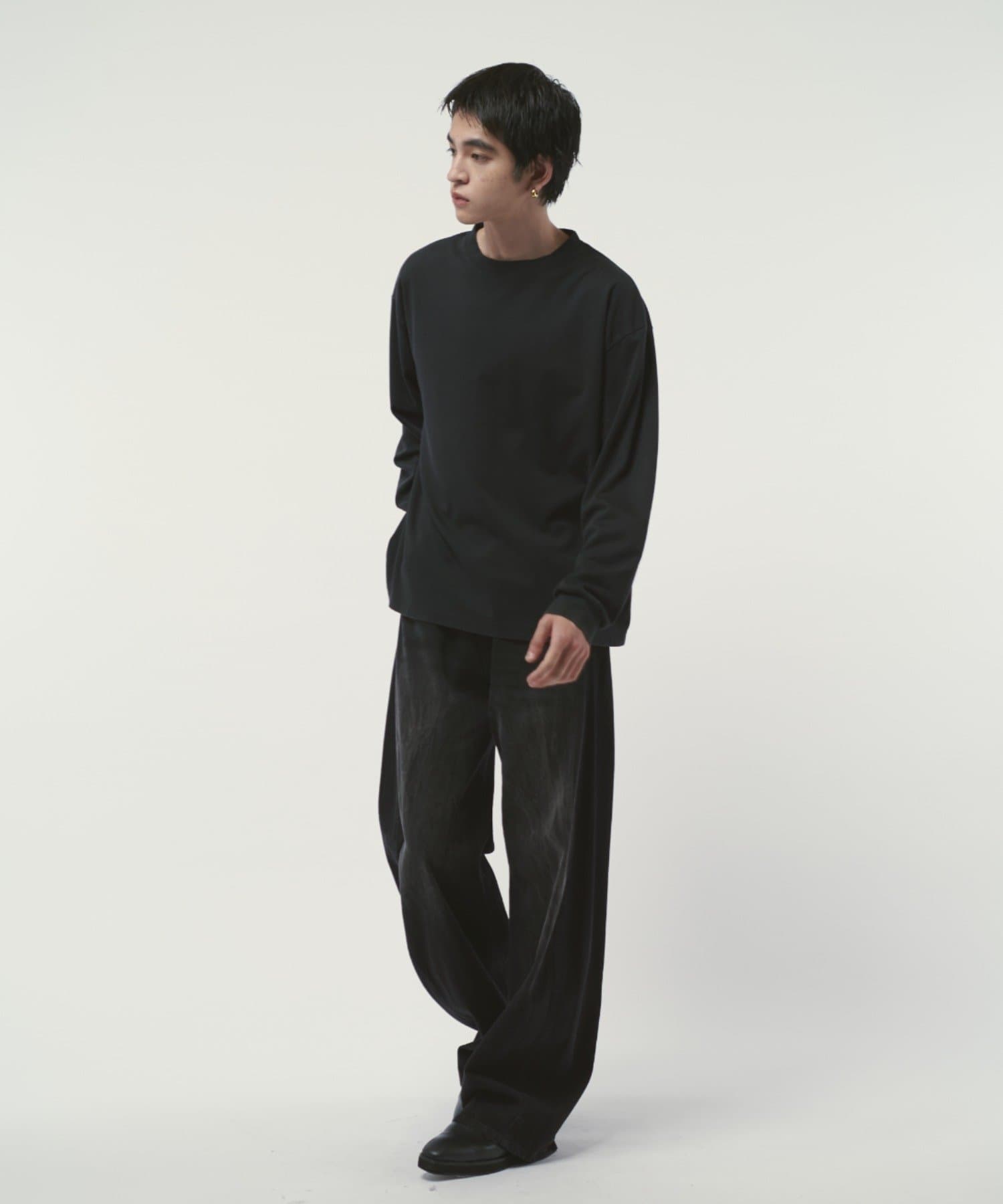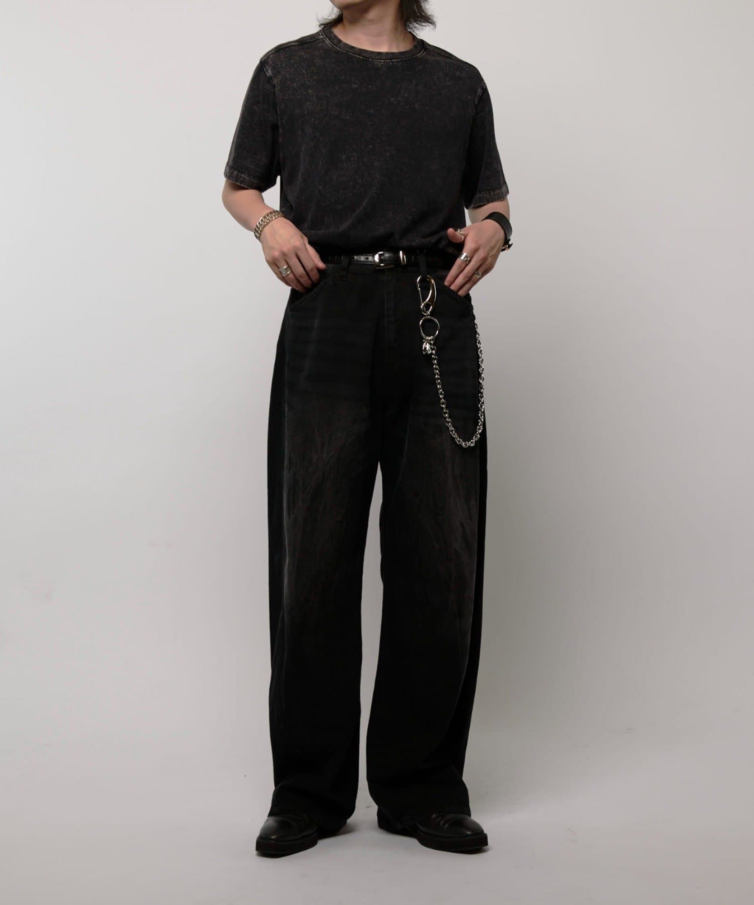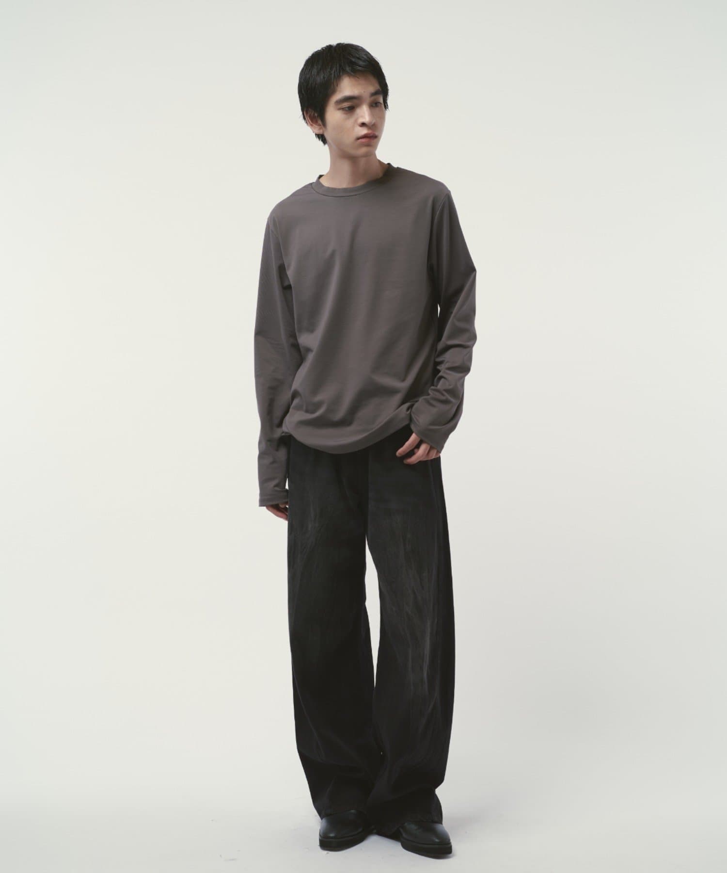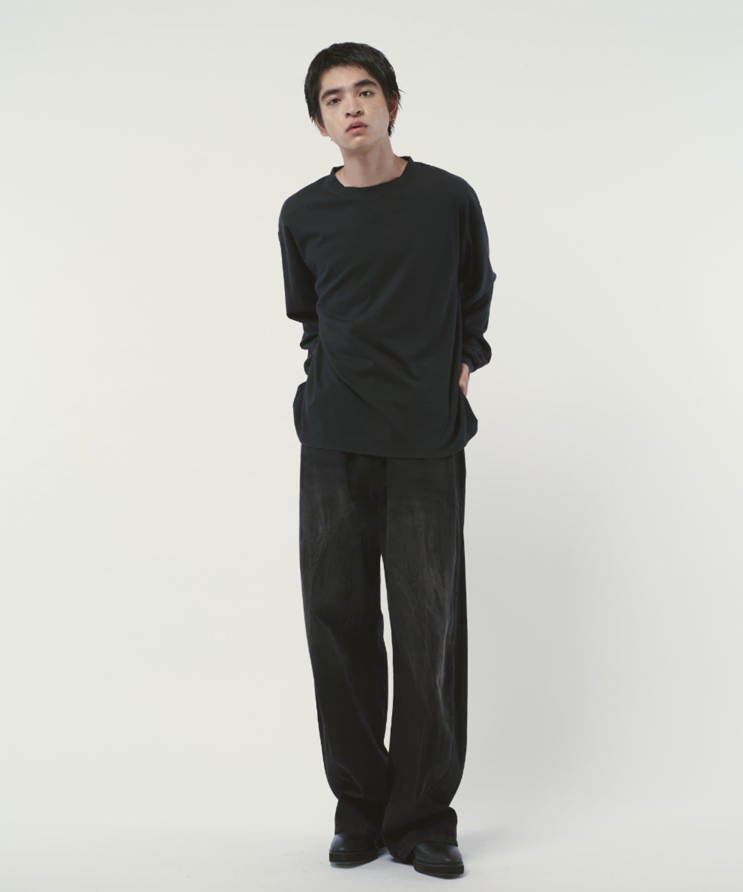 カーブシルエットが特徴的なデニムパンツなので、ベーシックなTシャツや、シャツに組み合わせたキレイめカジュアルなスタイルがオススメです。