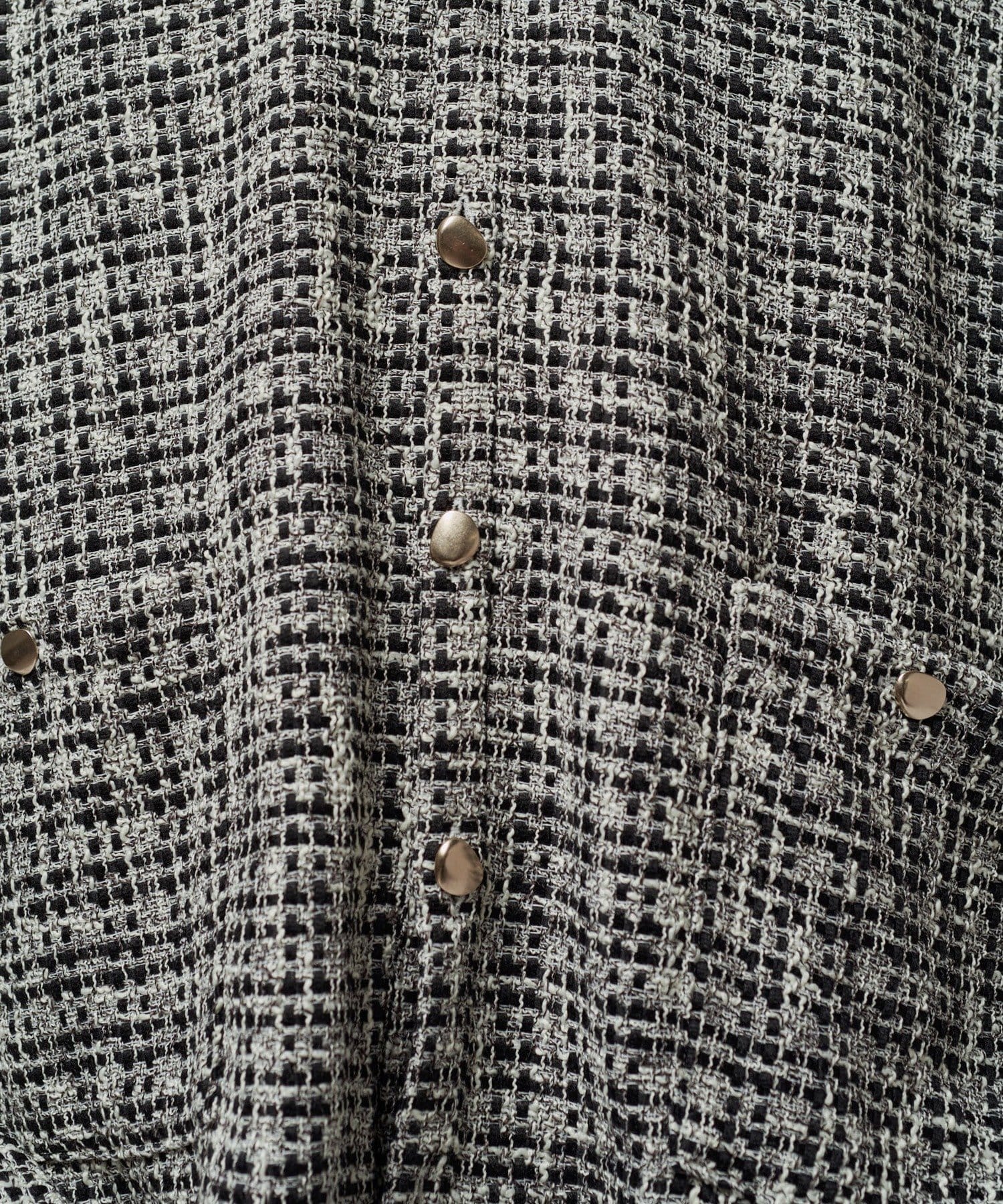 ツイード素材にゴールドのボタンがアクセントのカーディガン。
