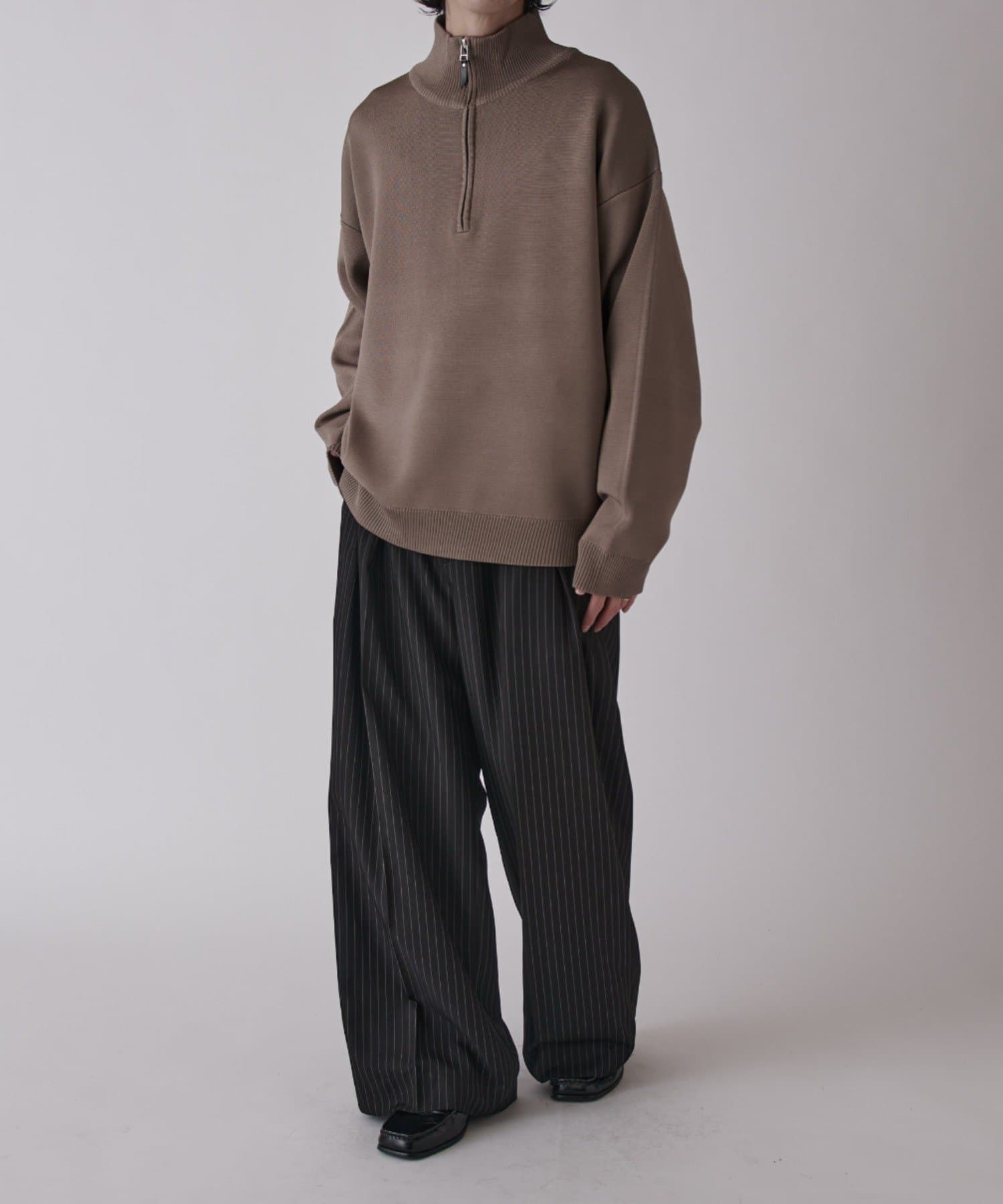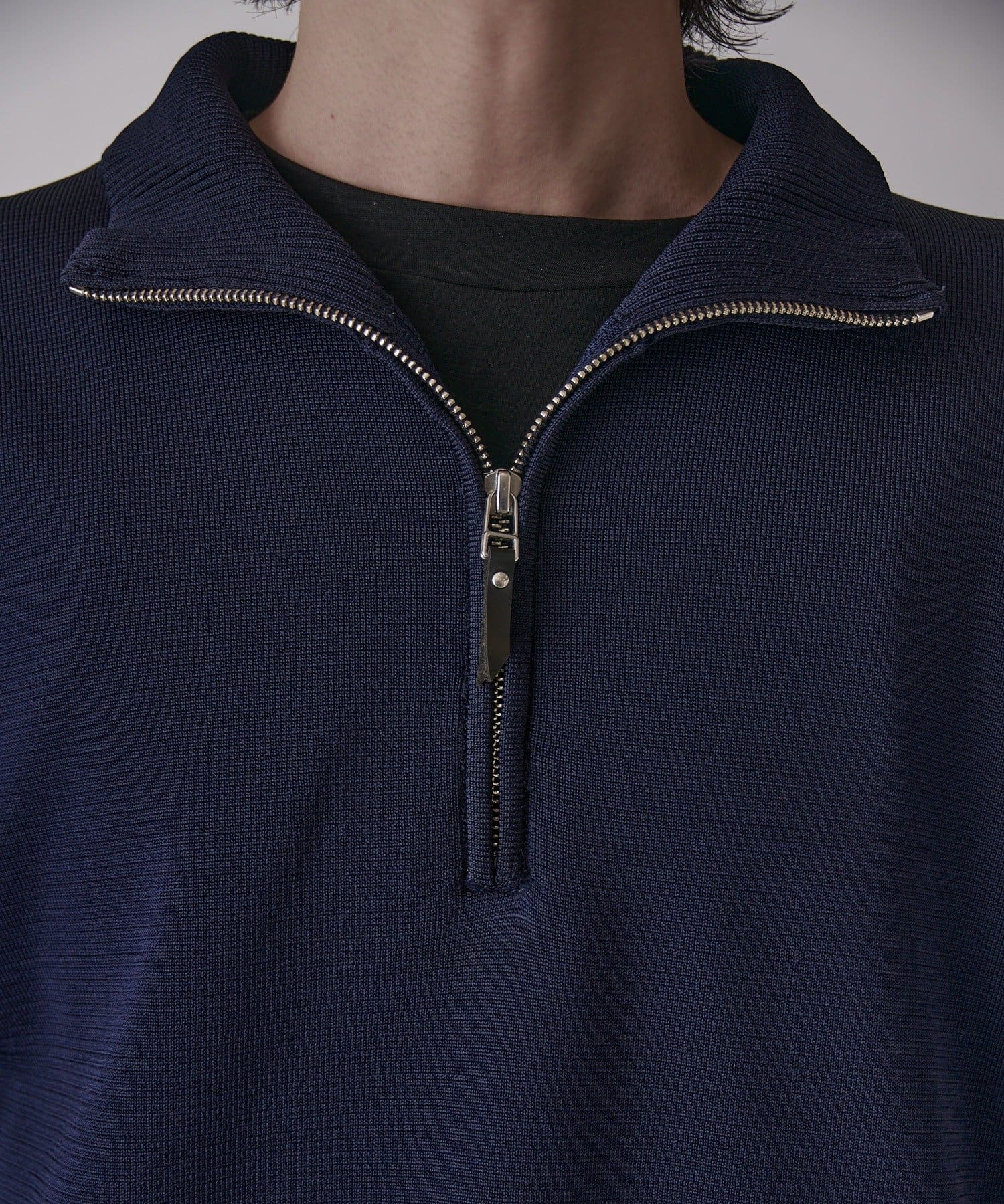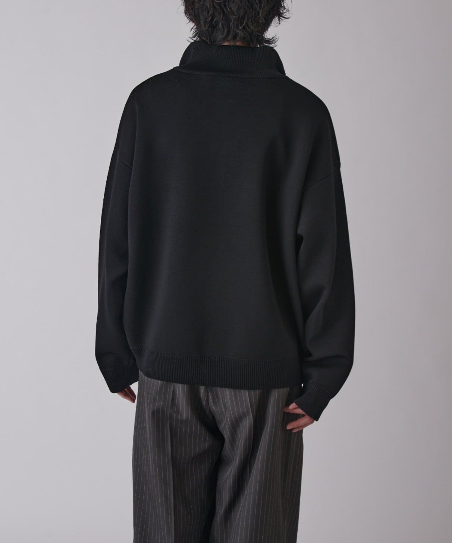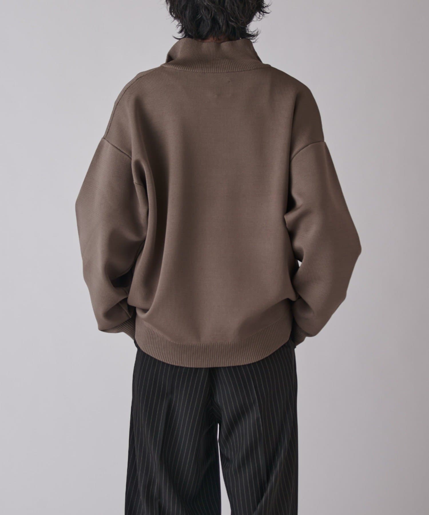 光沢と滑らかな手触りが特徴的な素材を使用したワイドのシルエットのハーフジップデザインがワンポイントのニット。