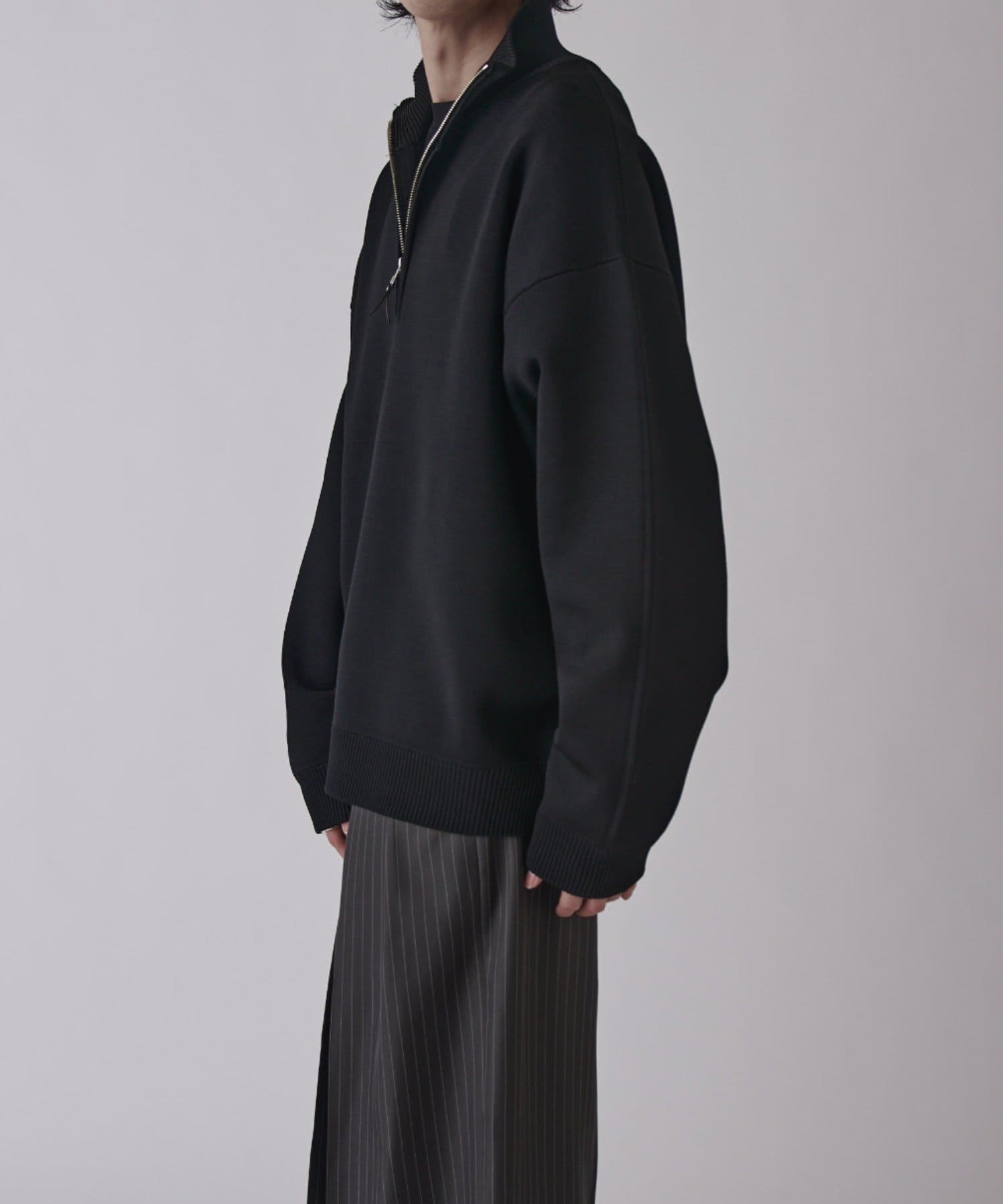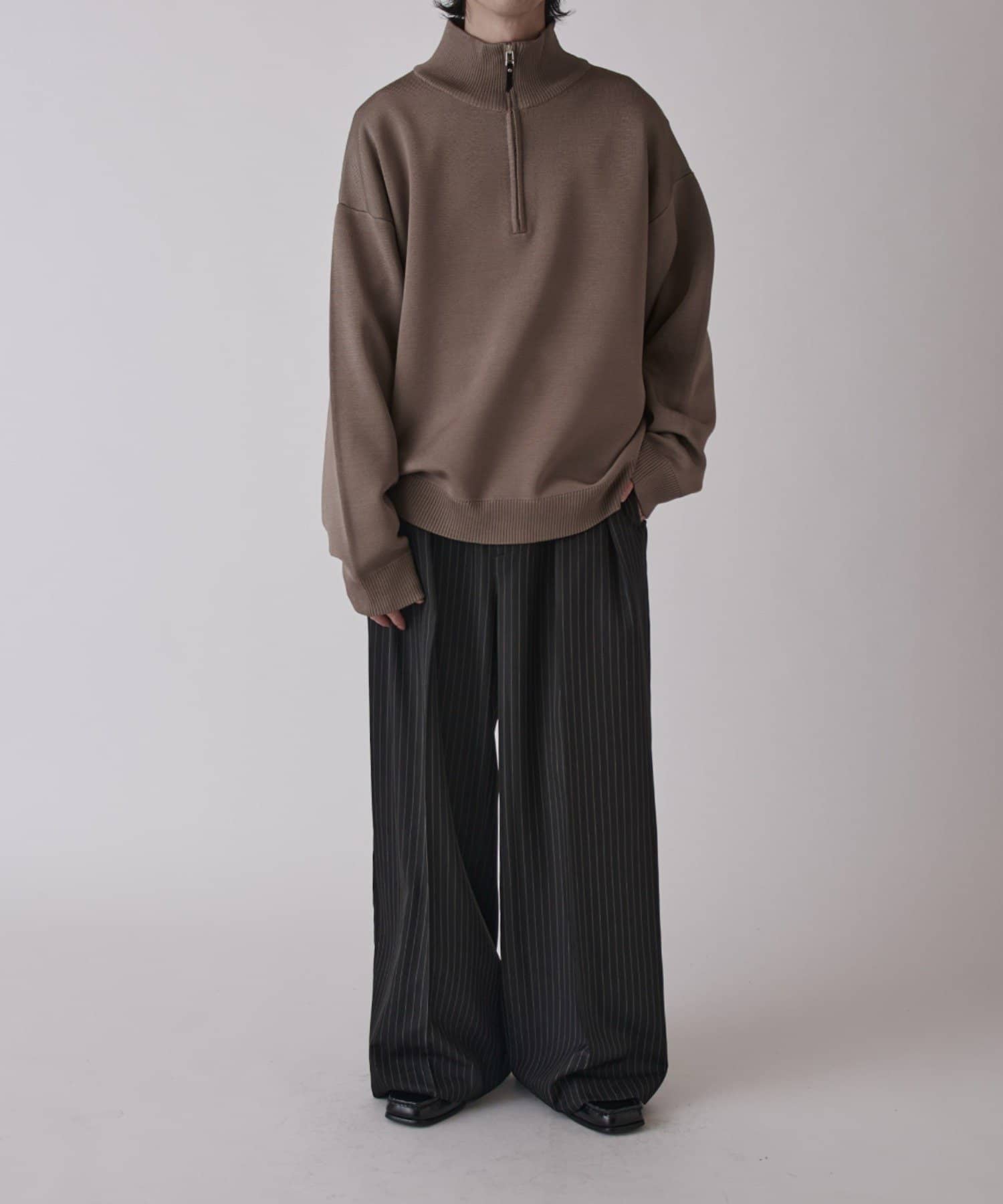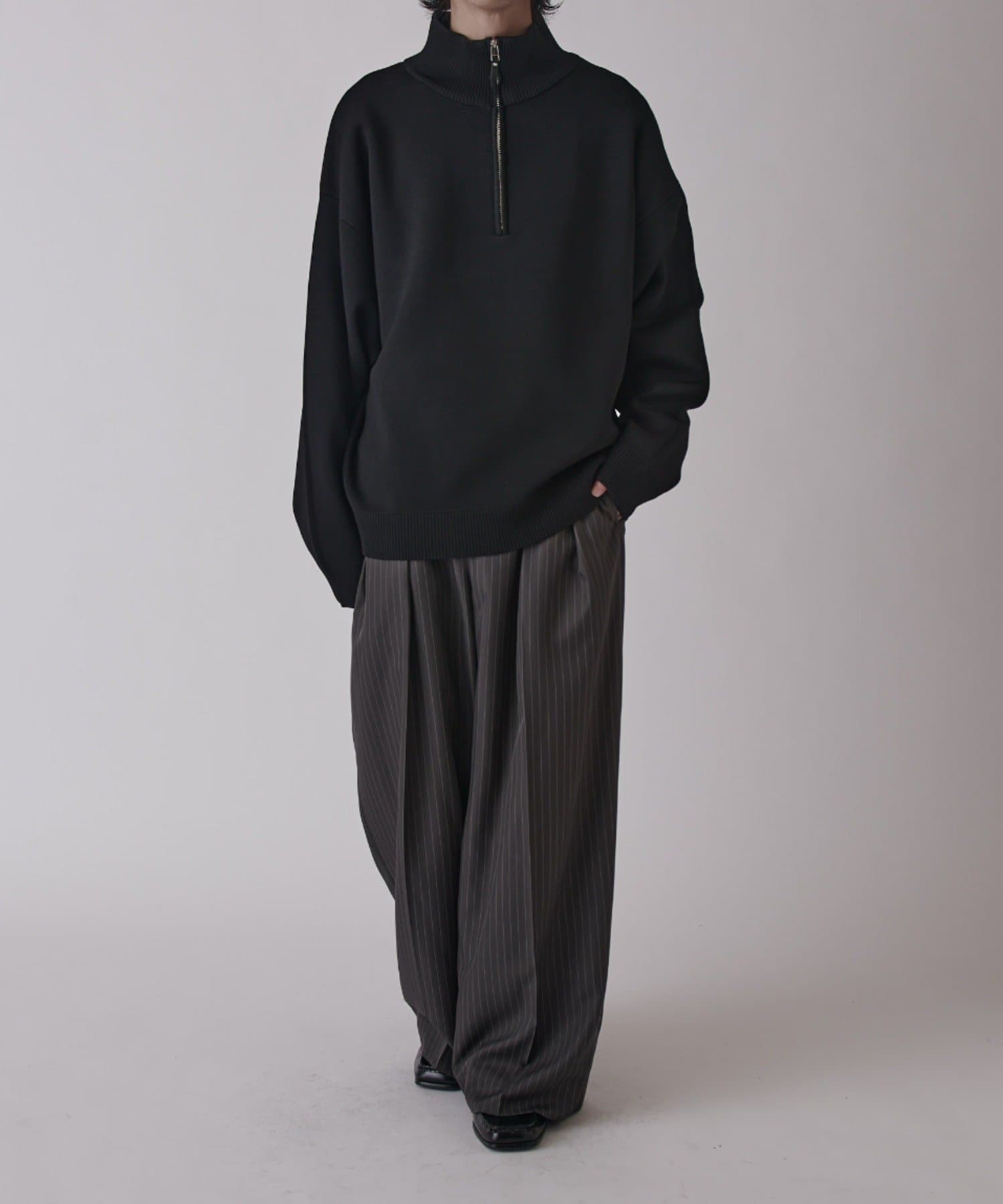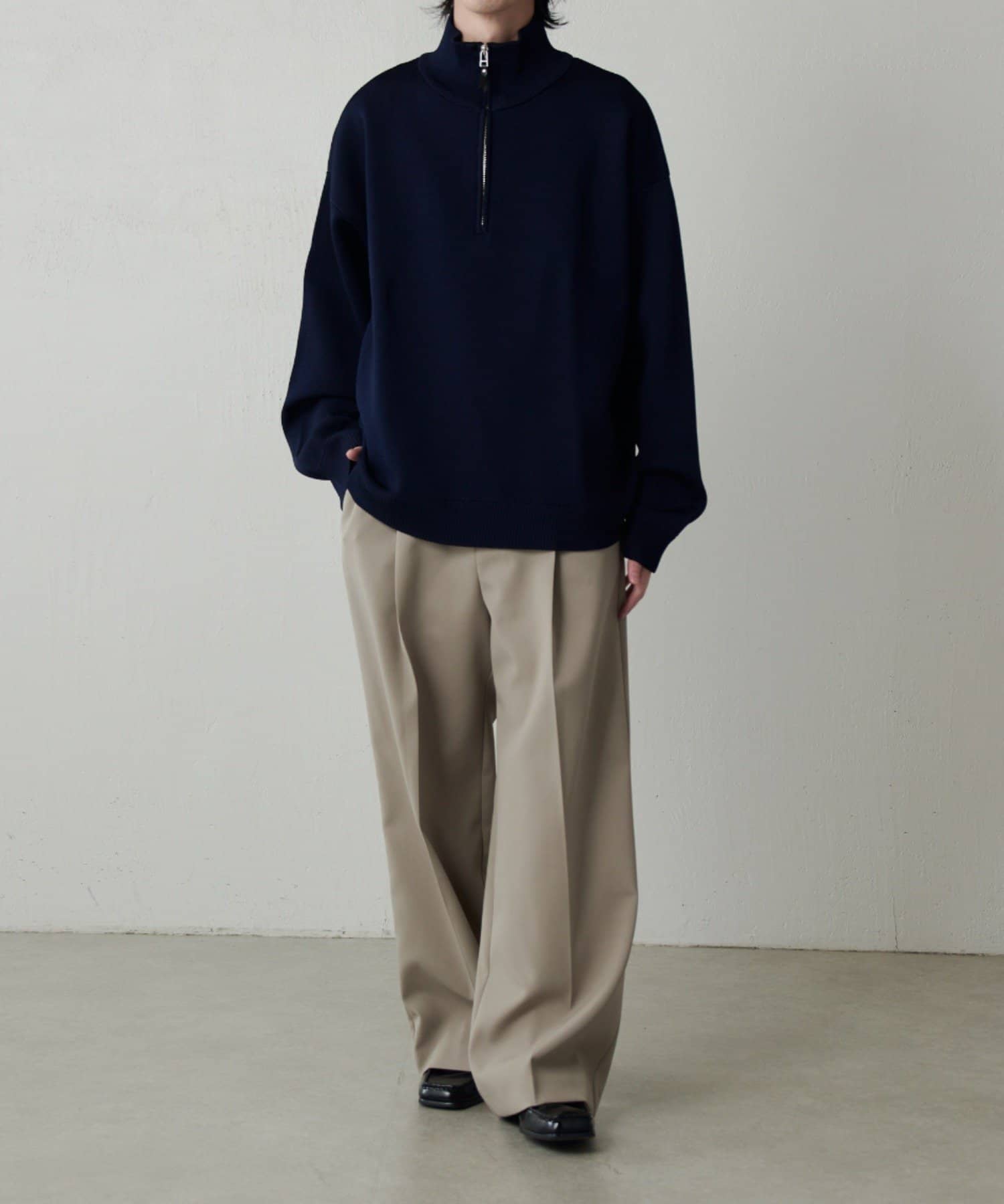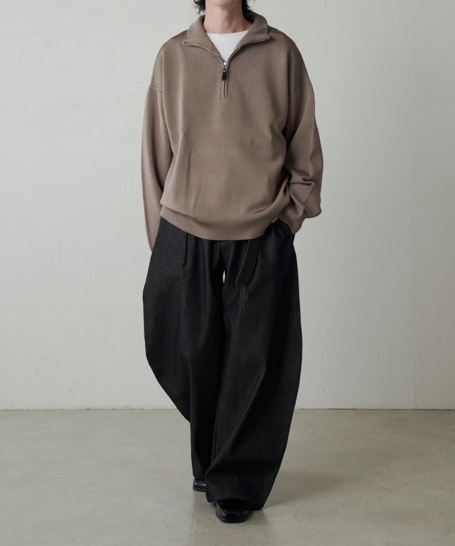 光沢と滑らかな手触りが特徴的な素材を使用したワイドのシルエットのハーフジップデザインがワンポイントのニット。
