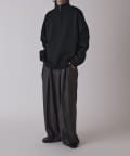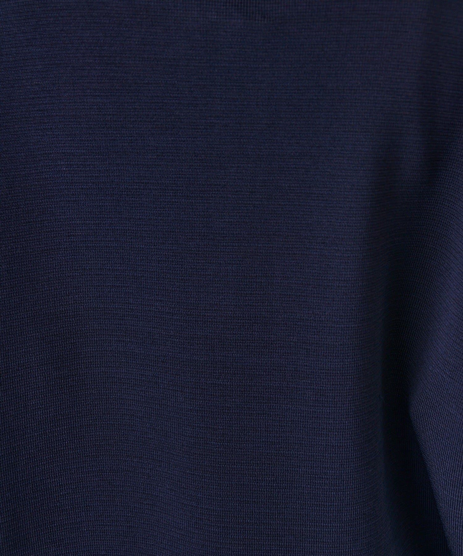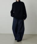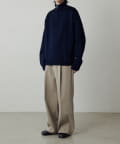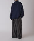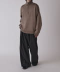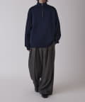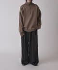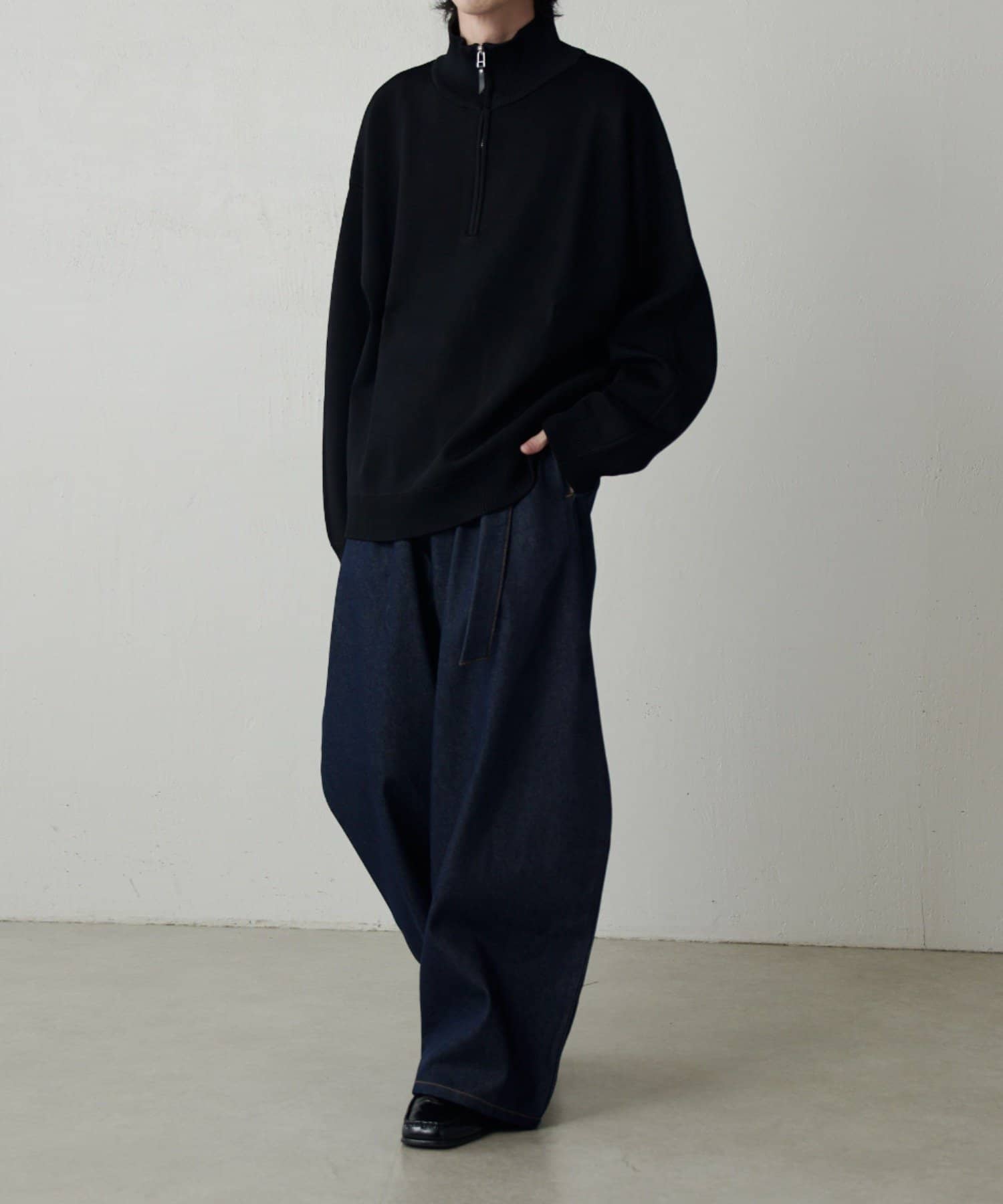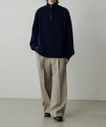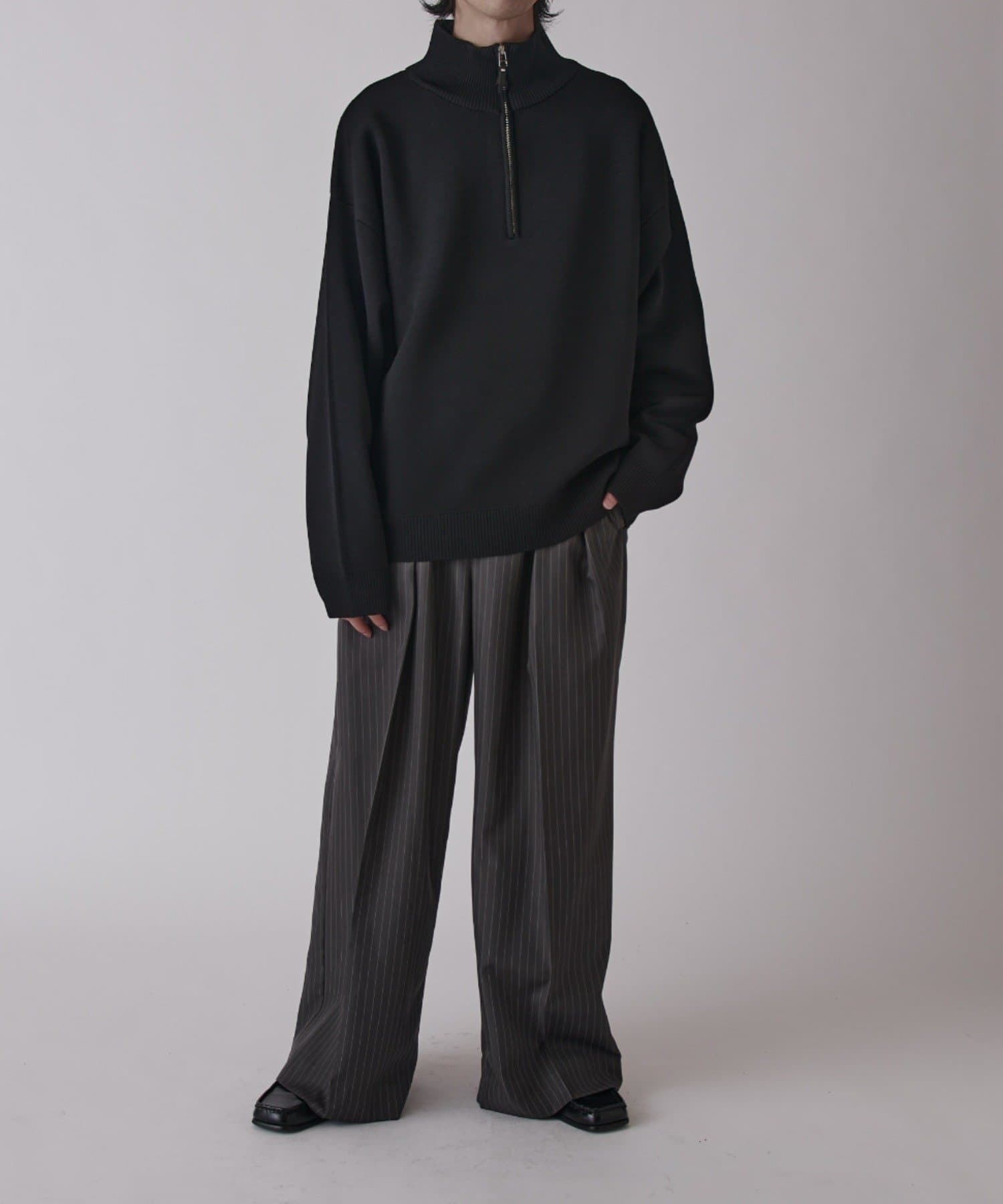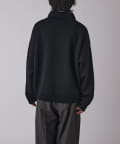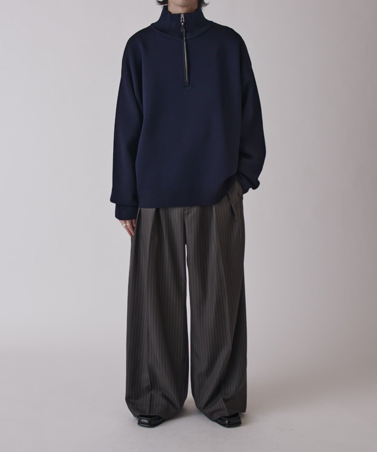 光沢と滑らかな手触りが特徴的な素材を使用したワイドのシルエットのハーフジップデザインがワンポイントのニット。