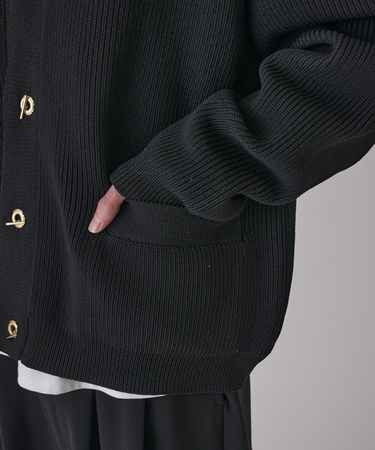 ネックレスでよく使うTバーのデザインをボタン部分に採用した、やや緩めのサイズ感のカーディガン。