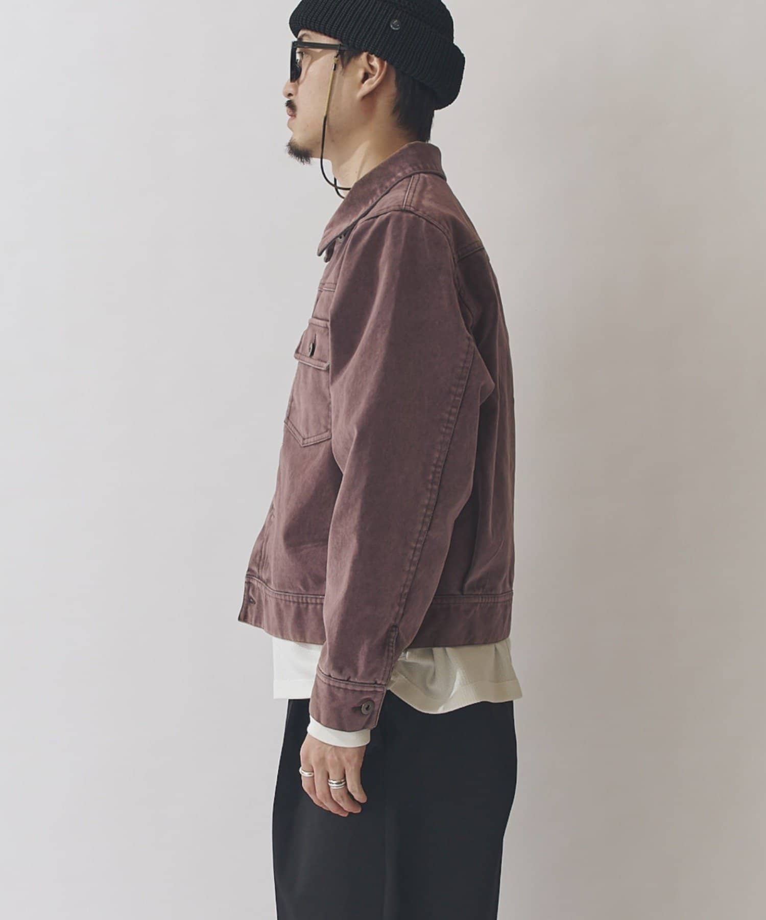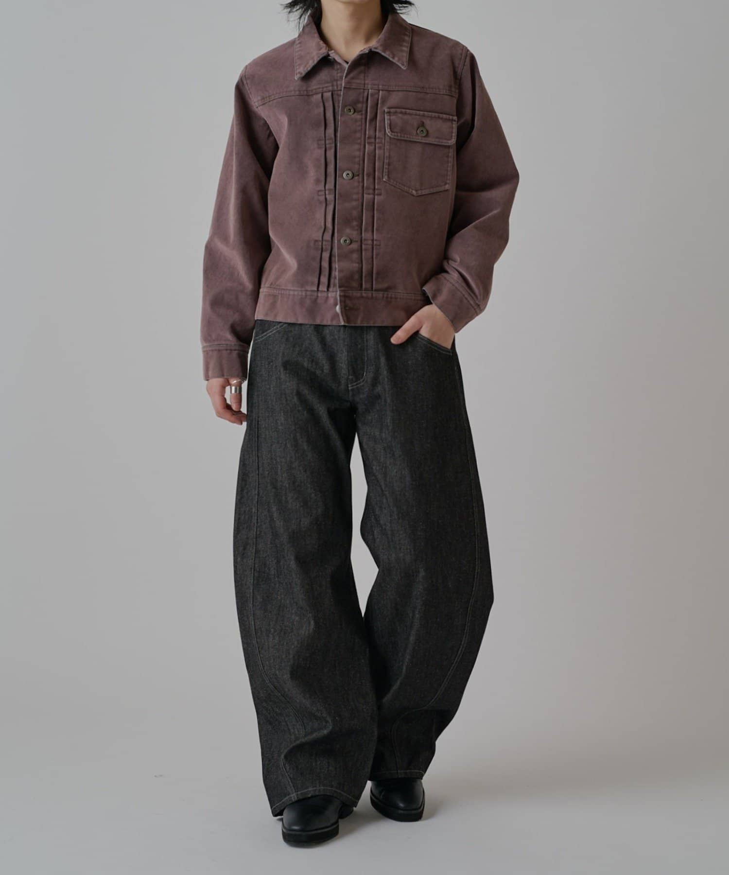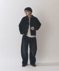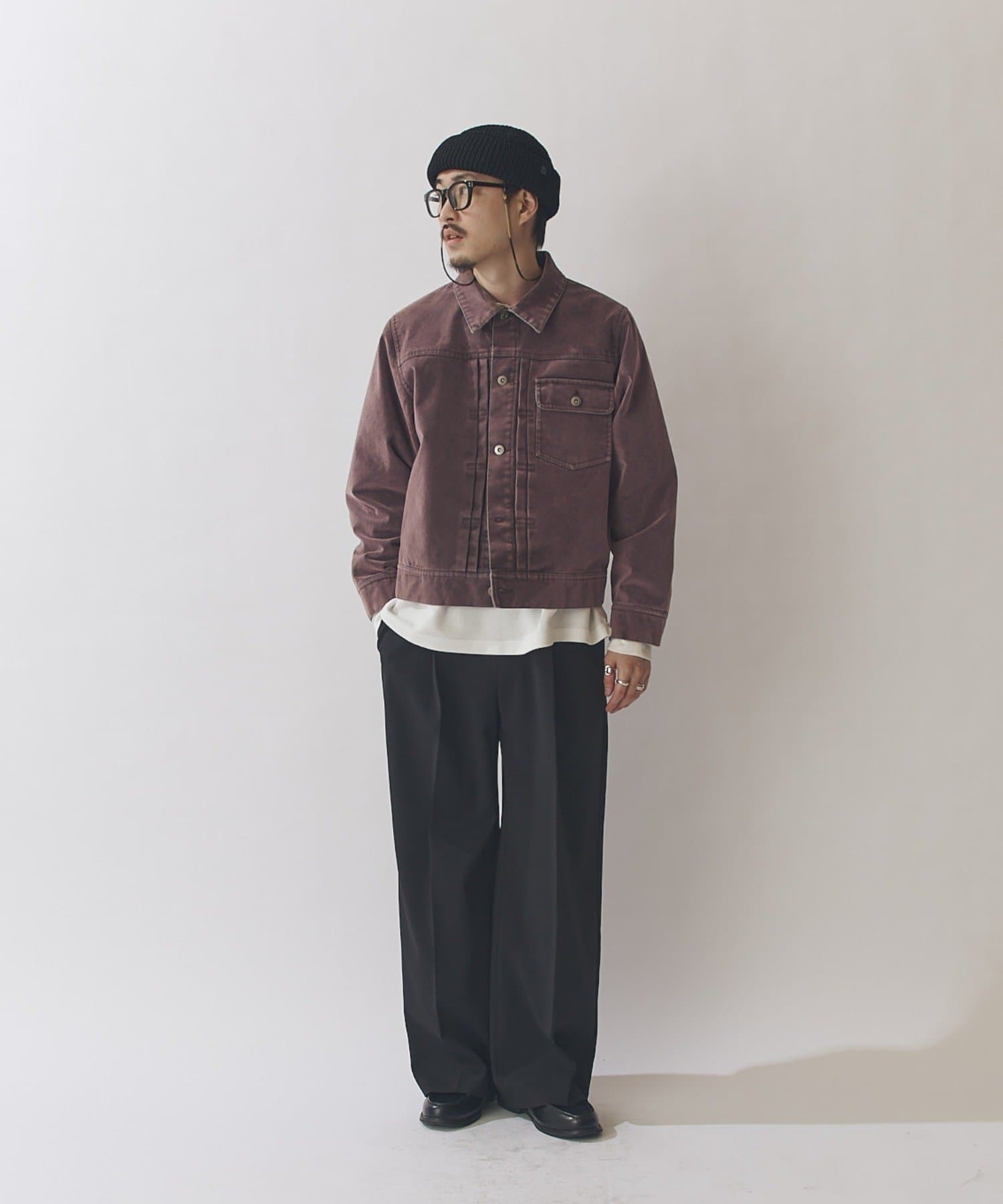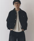 特徴的な素材感と、ボックスシルエットがポイントのデニムジャケットなので、キレイ目なワイドパンツと組み合わせたキレイめなコーディネートや、同素材で展開しているデニムパンツと組み合わせたセットアップもオオススメです。