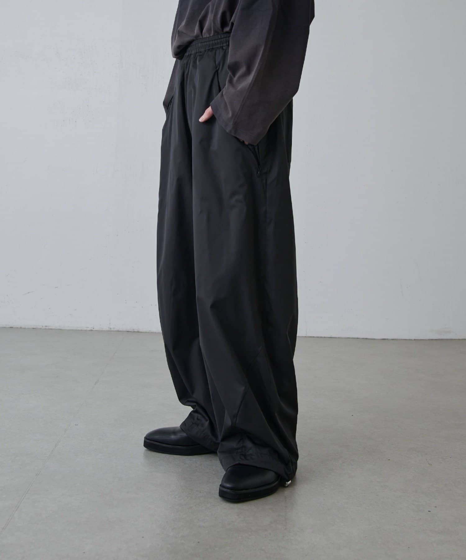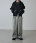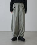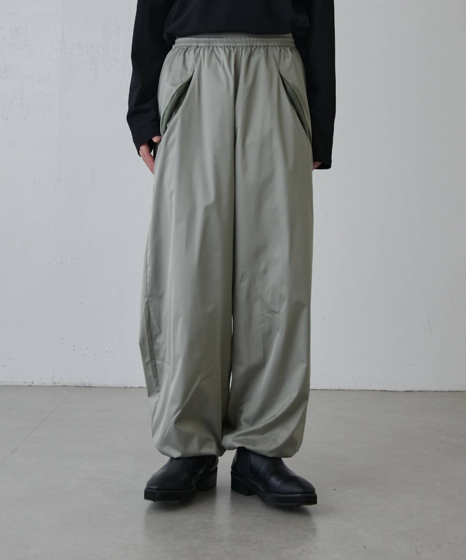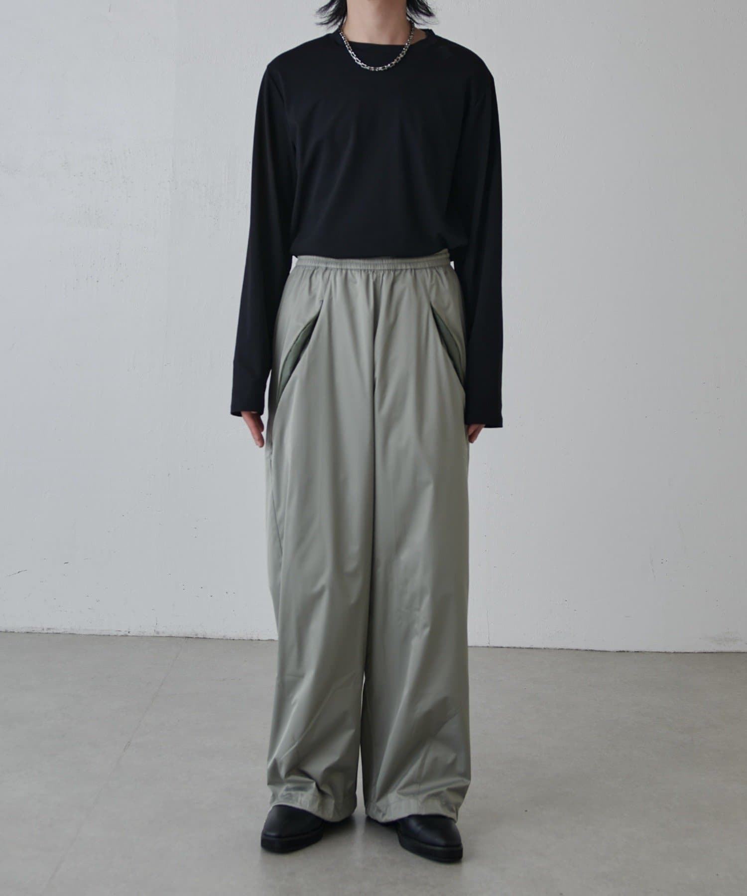 ルーズフィットなイージーパンツ。ポケットのデザインが特徴的で、ZIPポケットを開けると微配色の裏地が現れ、さりげないアクセントとなります。