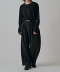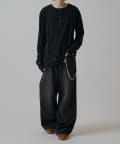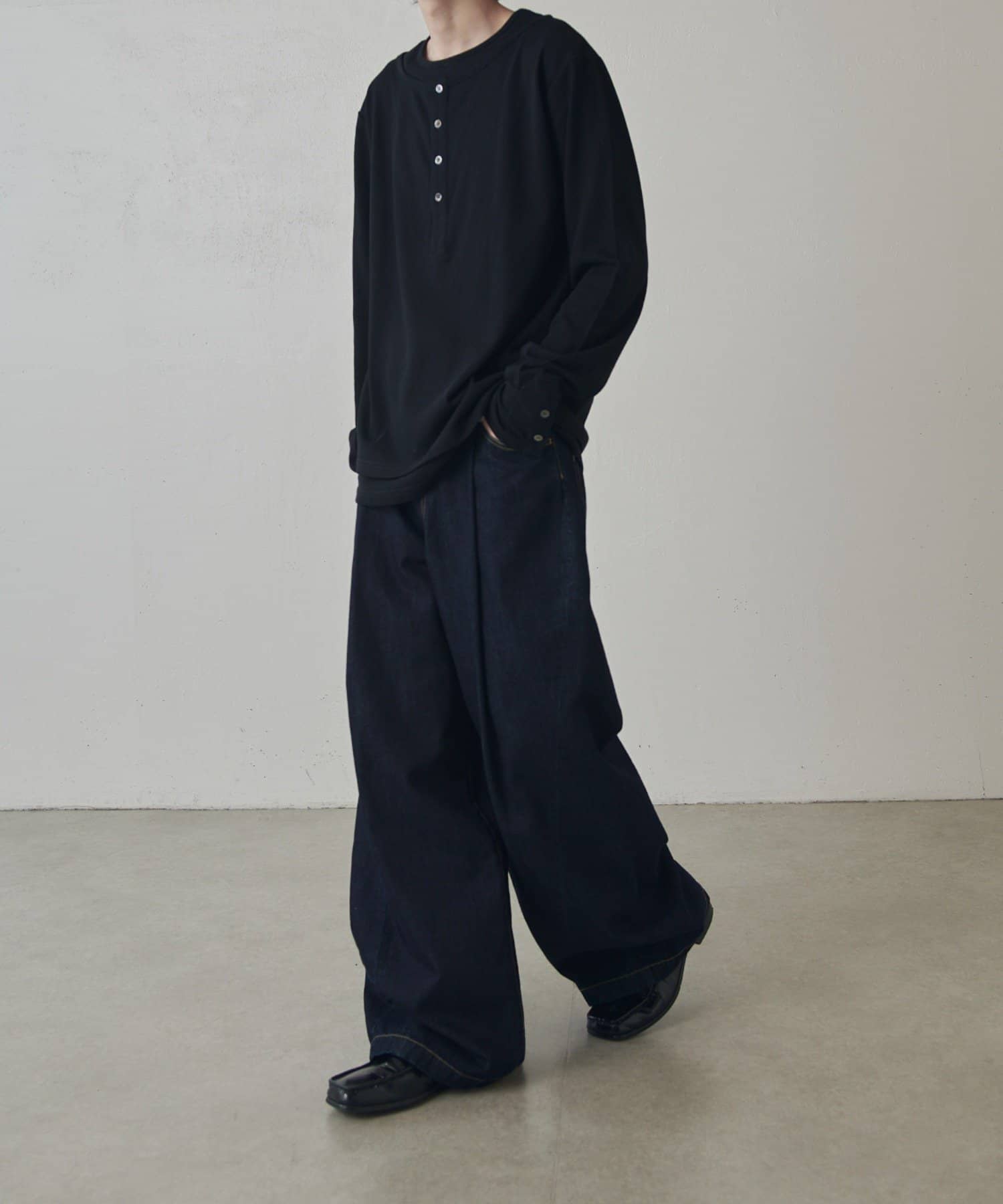 レイヤードデザインが特徴的なアイテムなので、ワイドデニムや、カーブパンツなどボリュームシルエットのパンツで組み合わせて頂くのがオススメです。