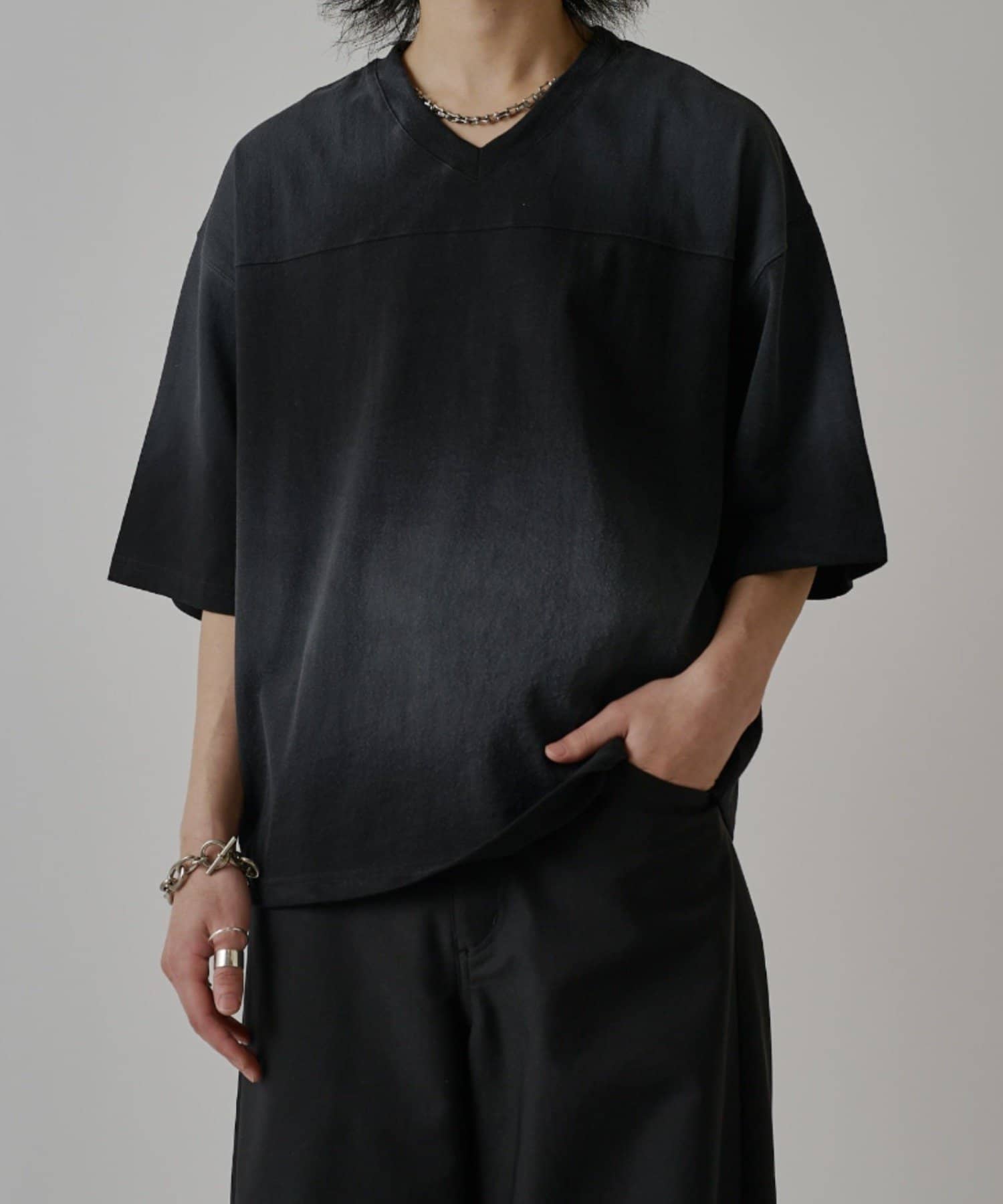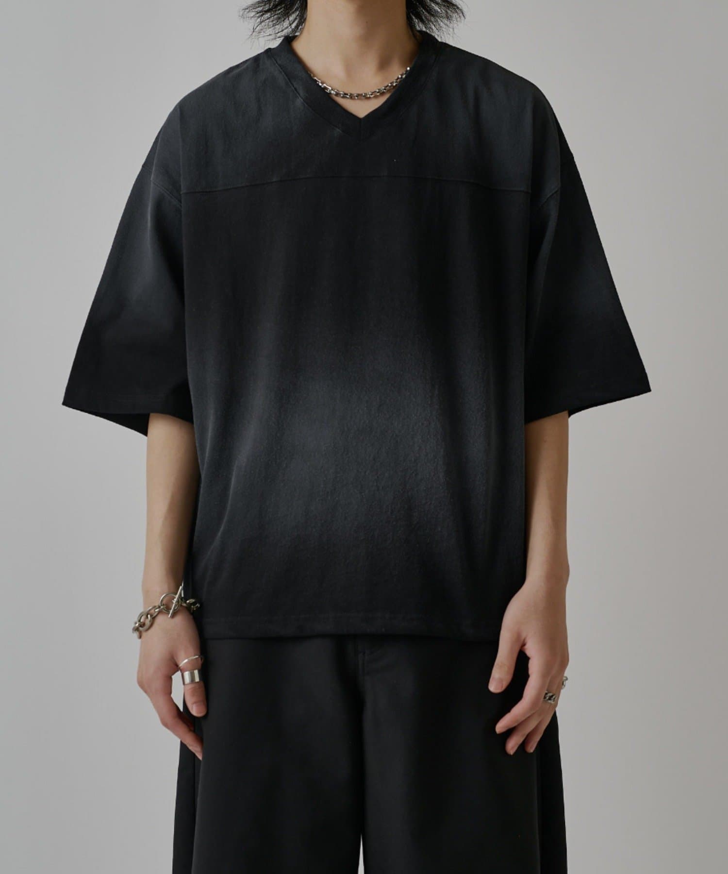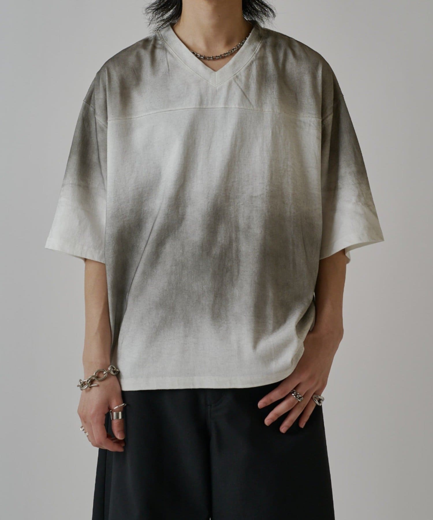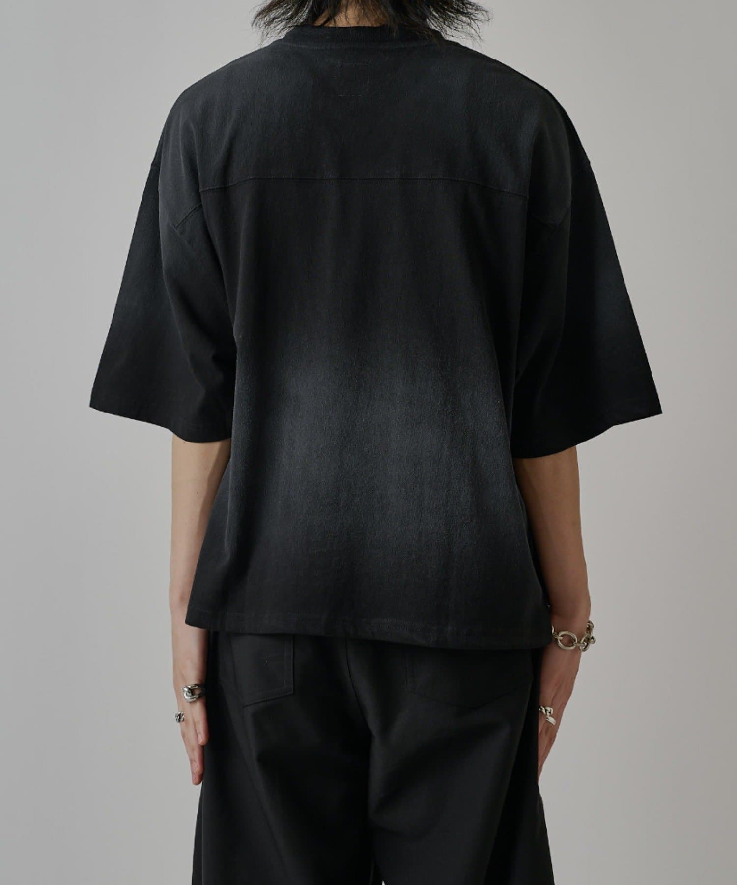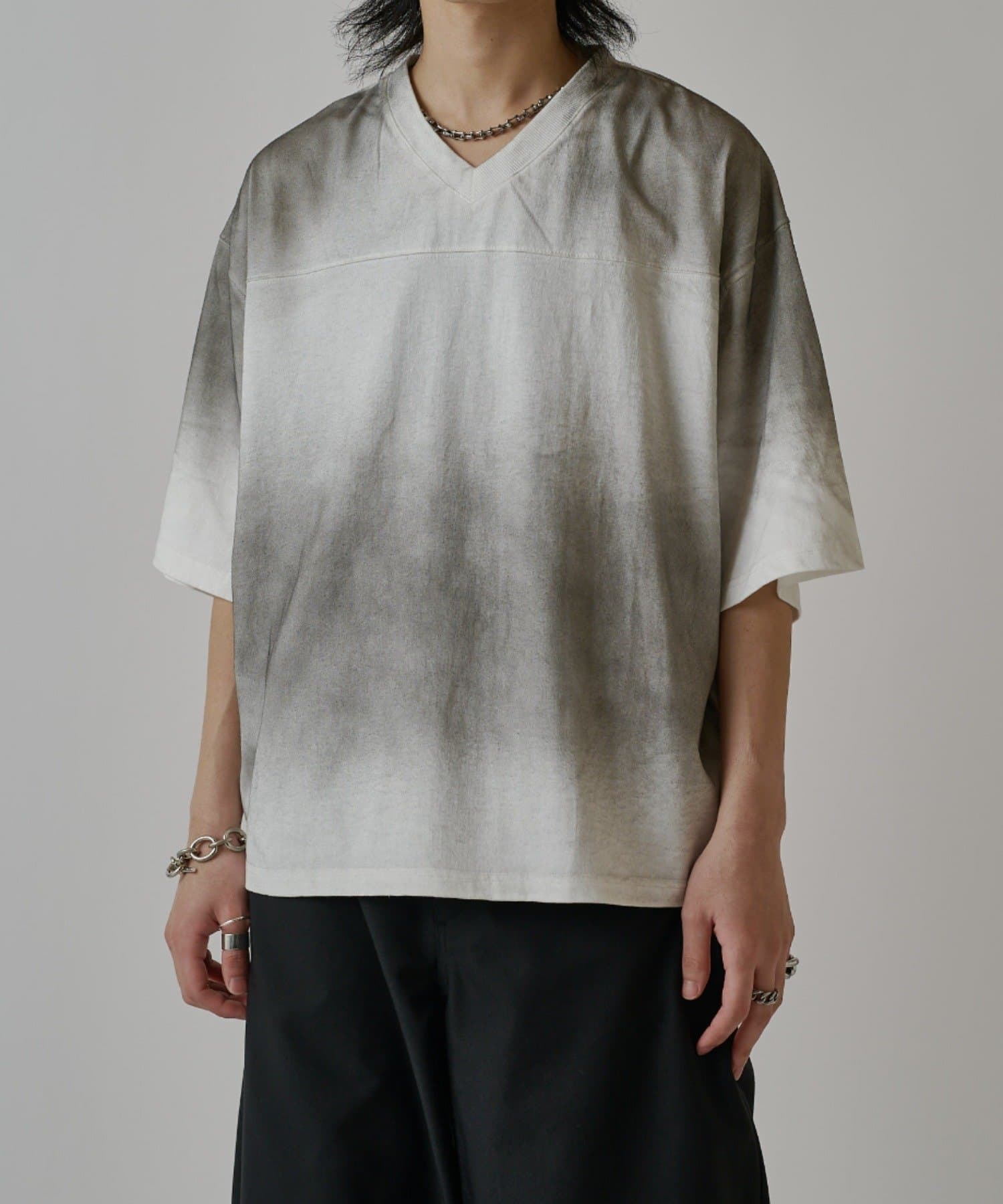 ・グランジテイストのブリーチ加工を施したフットボールTシャツ。