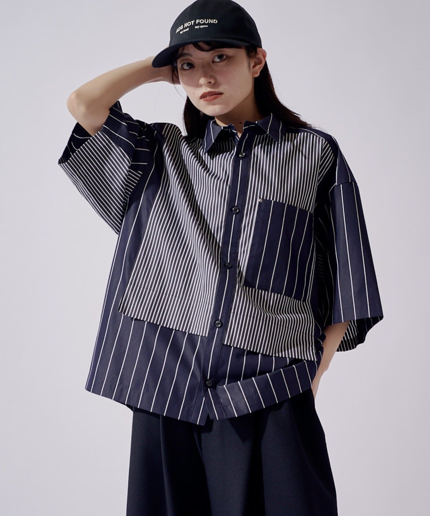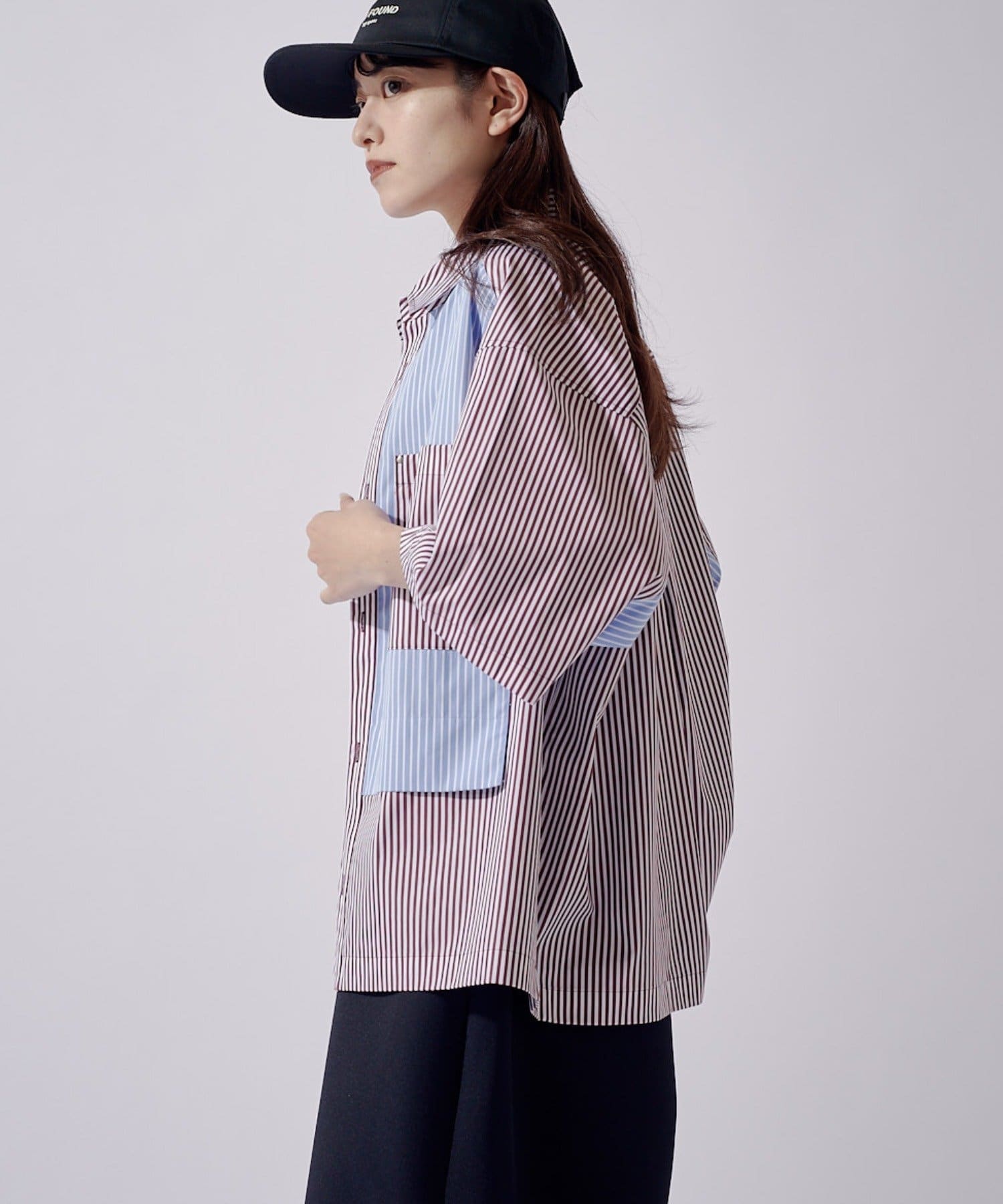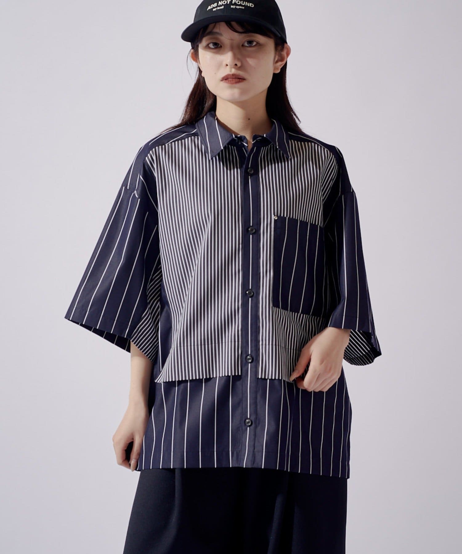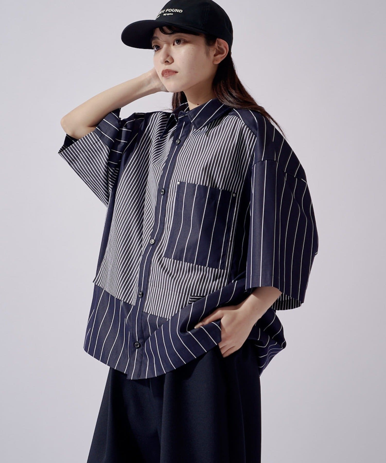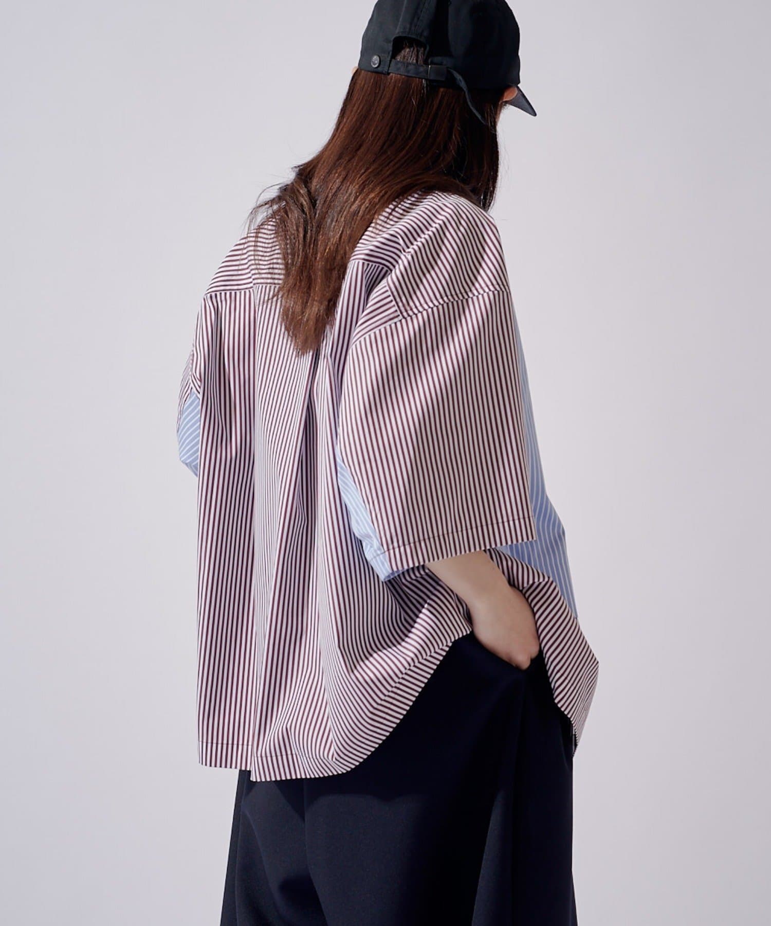 2種類のストライプが切替デザインになっているデザインシャツです。