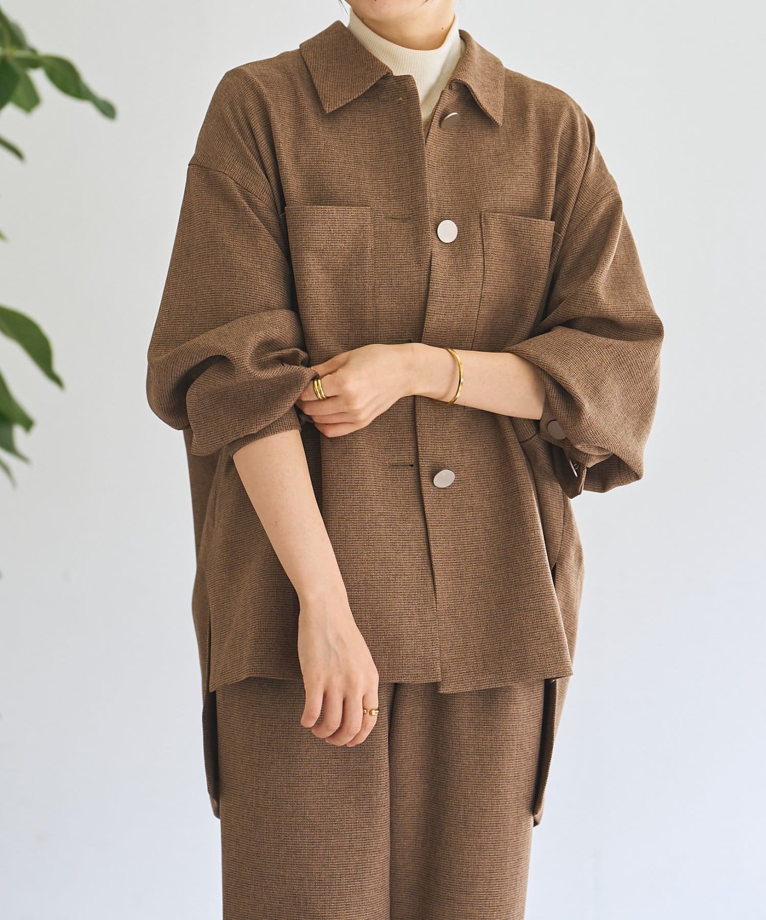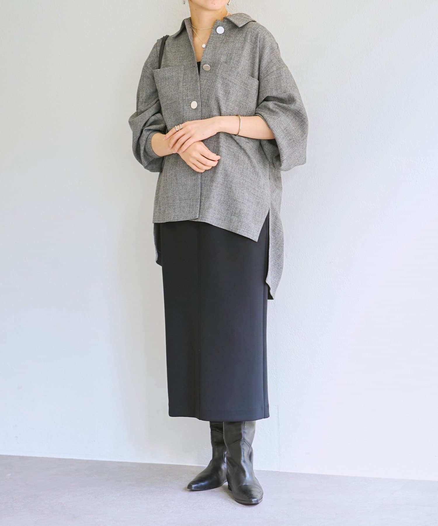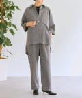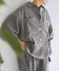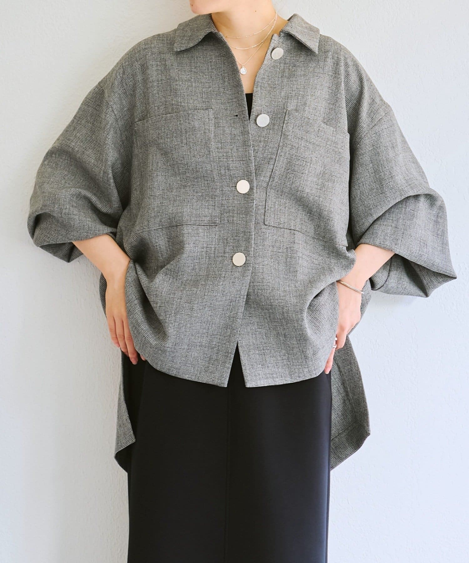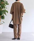 メンズライクなシャツデザインでありながら、背中のタックで女性らしさを感じさせます。フラットボタンがアクセントになり、さらに存在感のある1枚に。