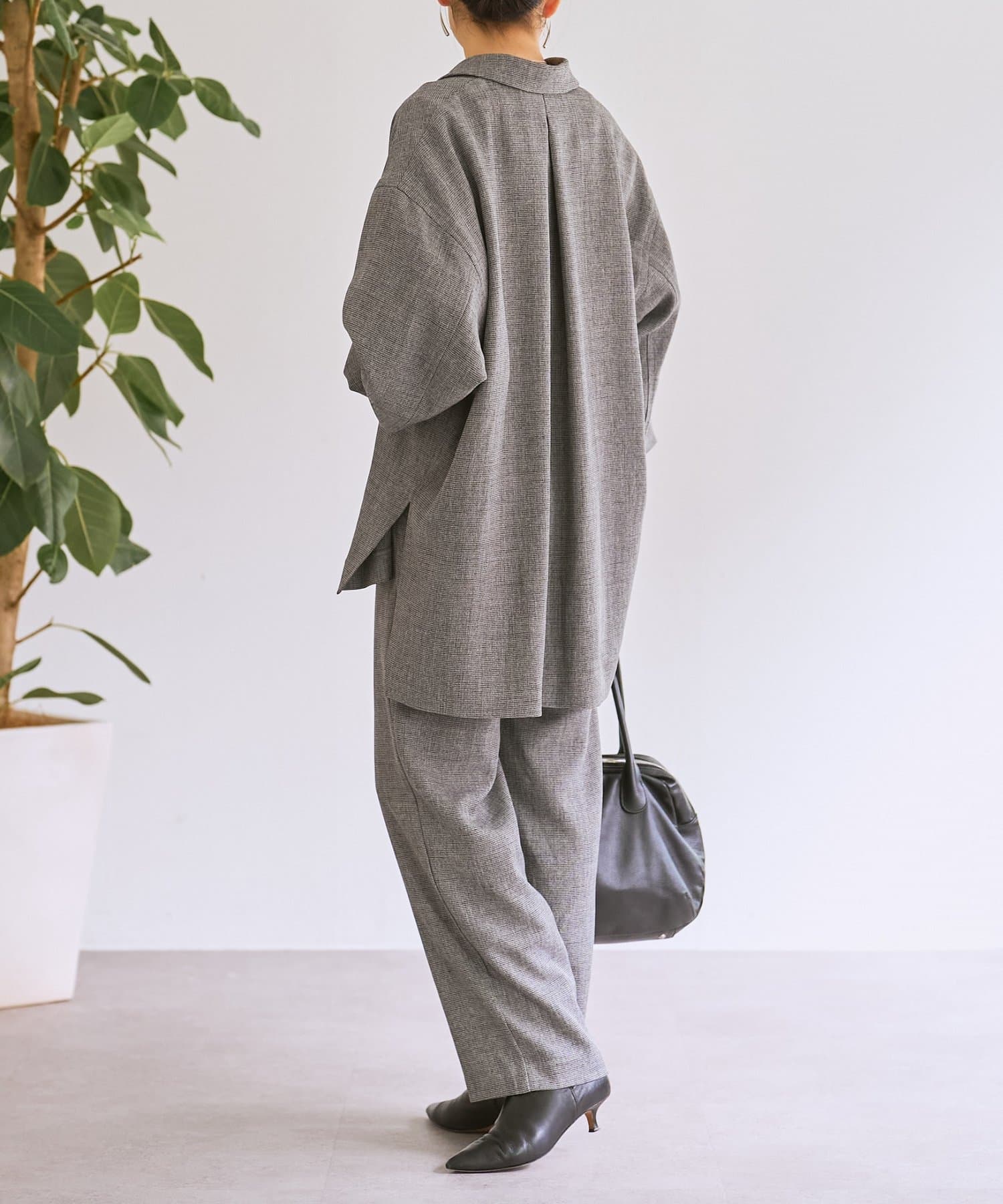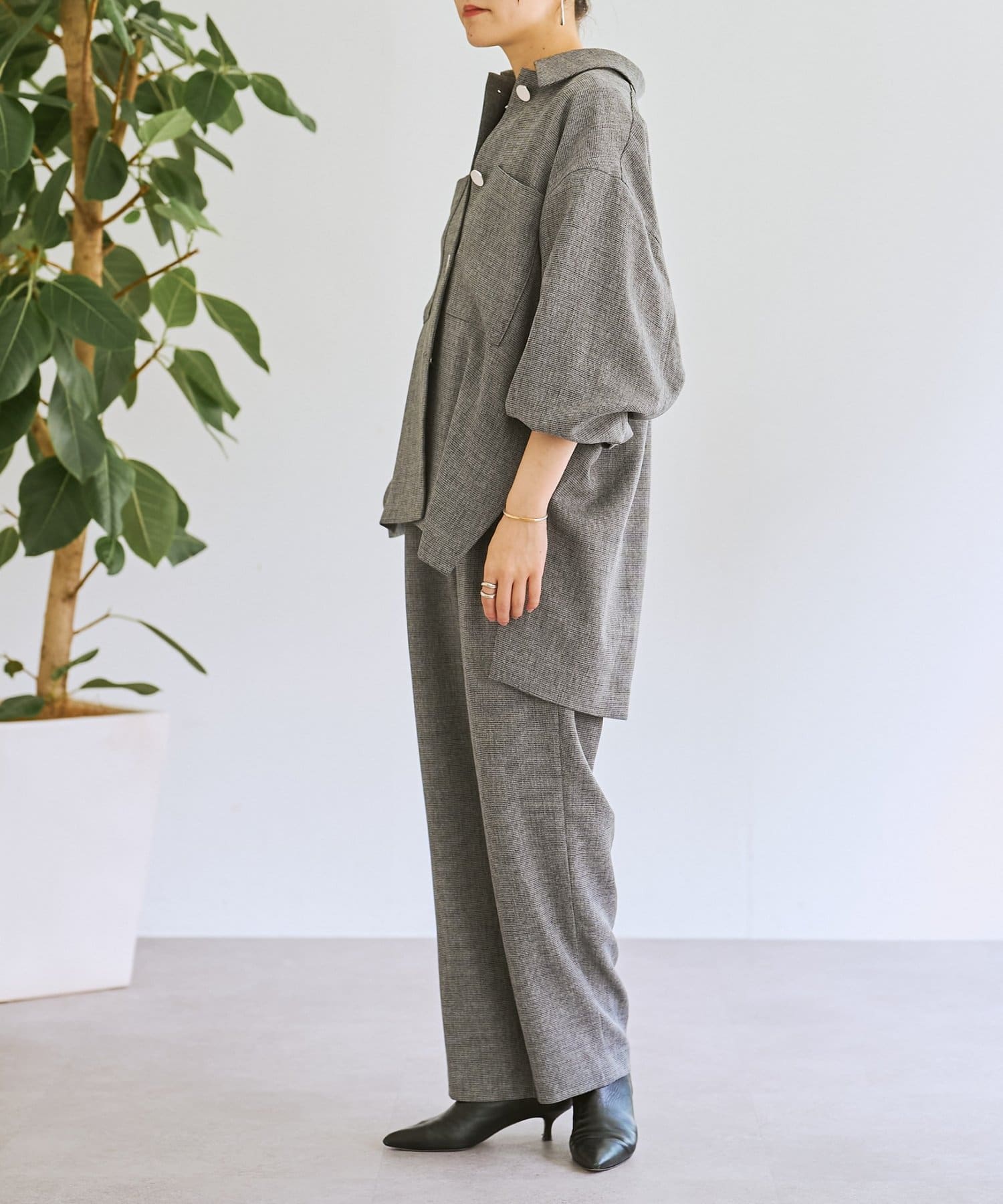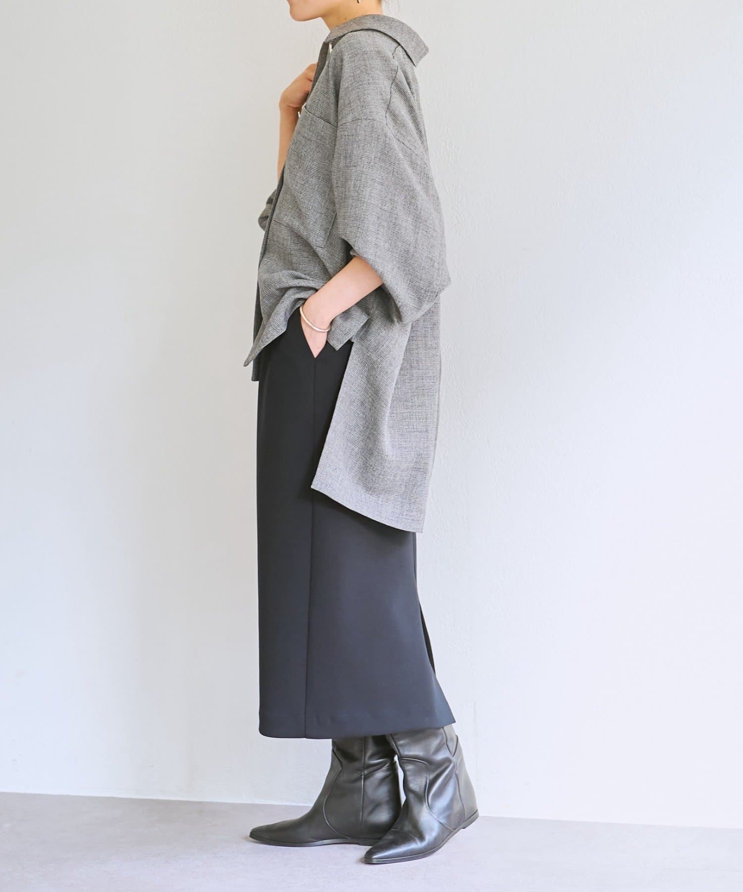 メンズライクなシャツデザインでありながら、背中のタックで女性らしさを感じさせます。フラットボタンがアクセントになり、さらに存在感のある1枚に。