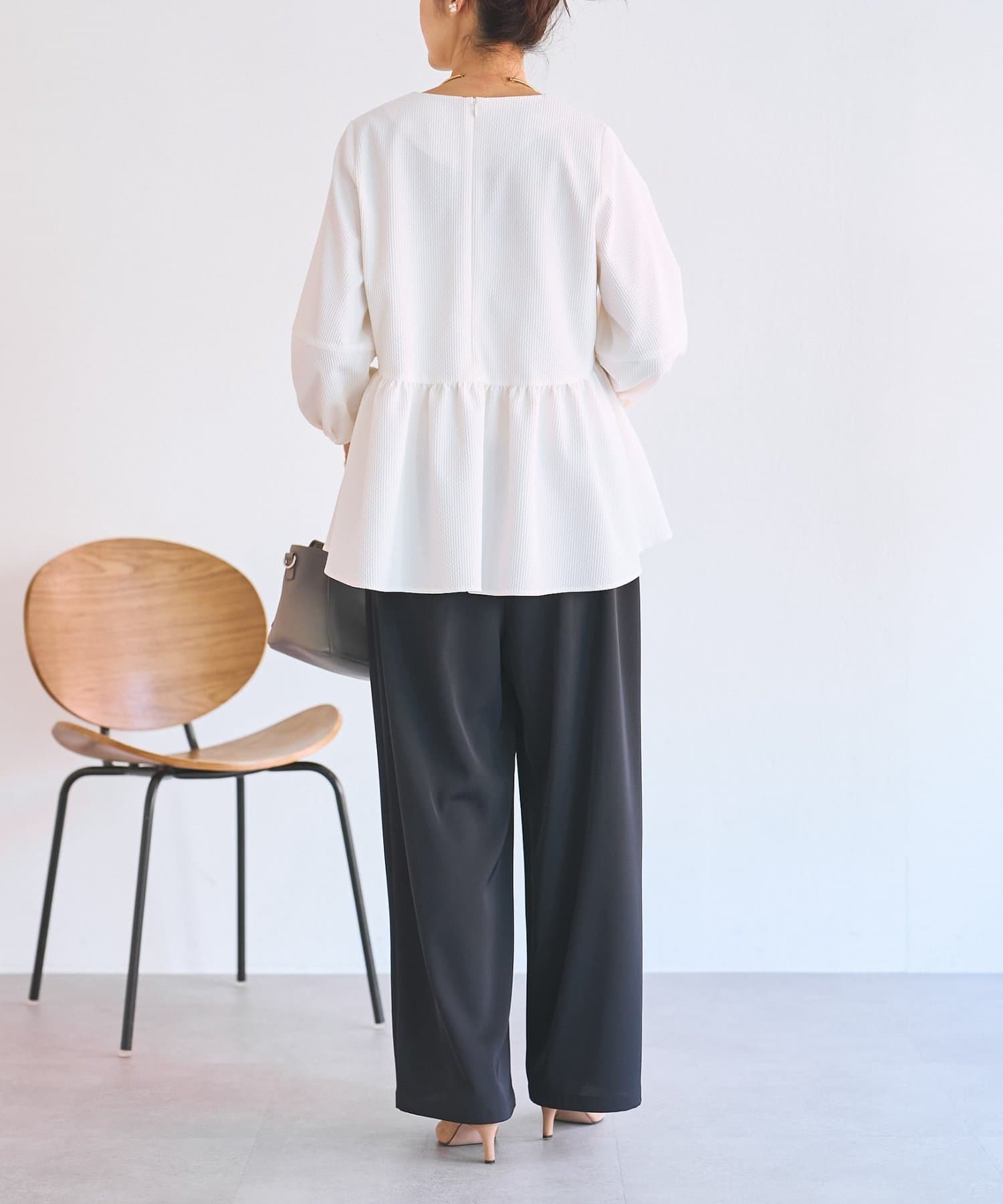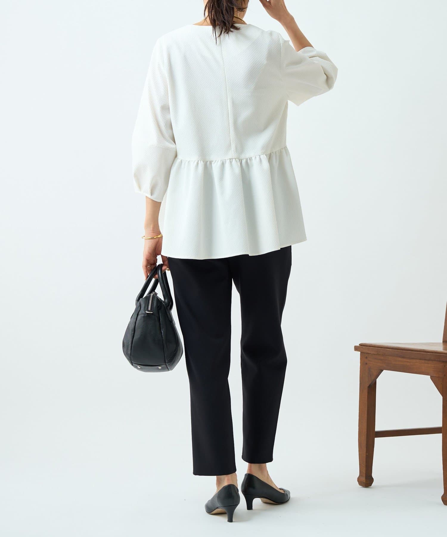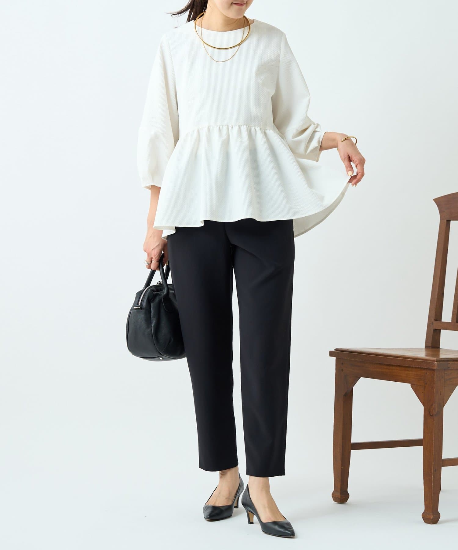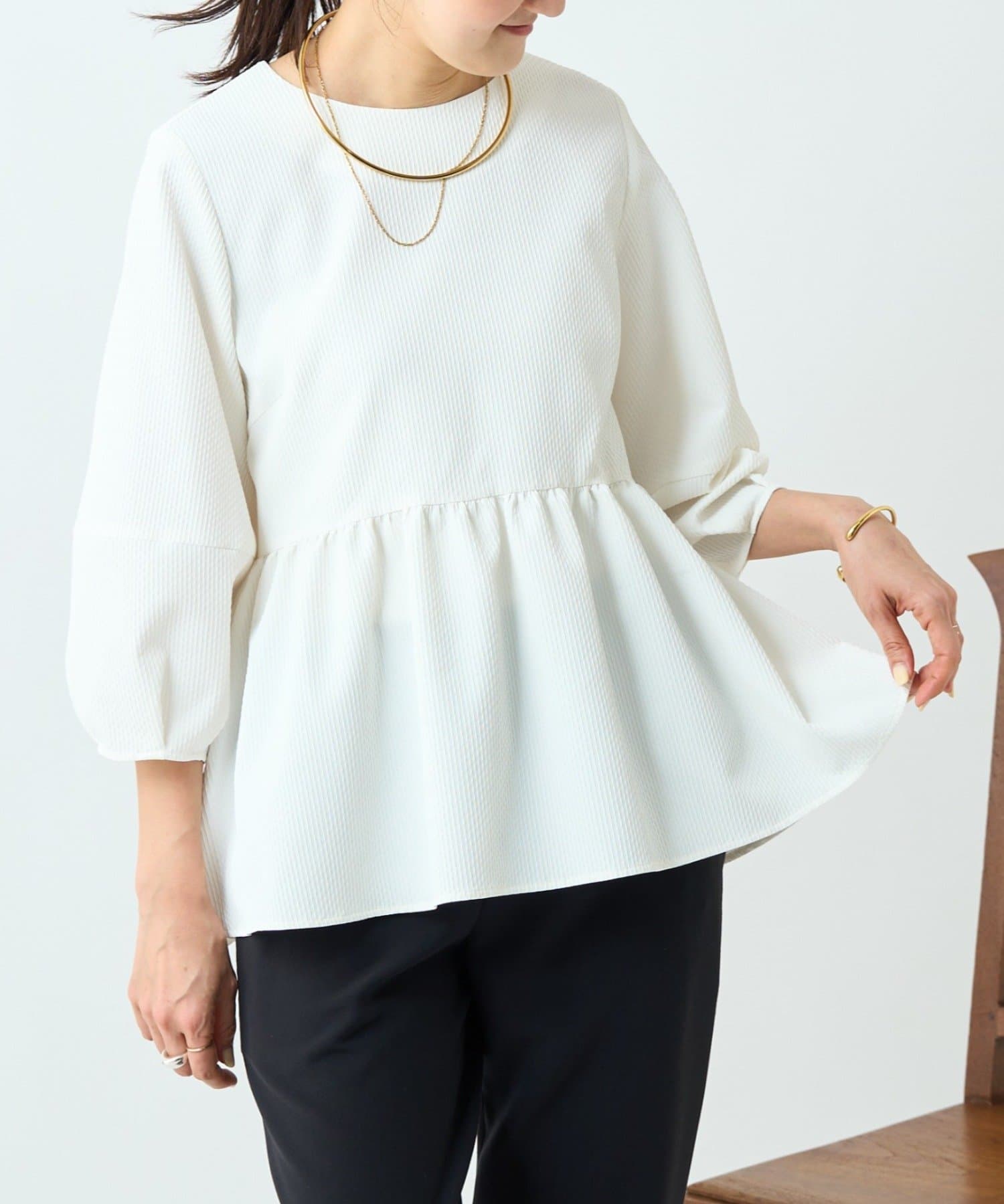 女性らしいペプラムデザインが腰回りをカバーしてくれます。