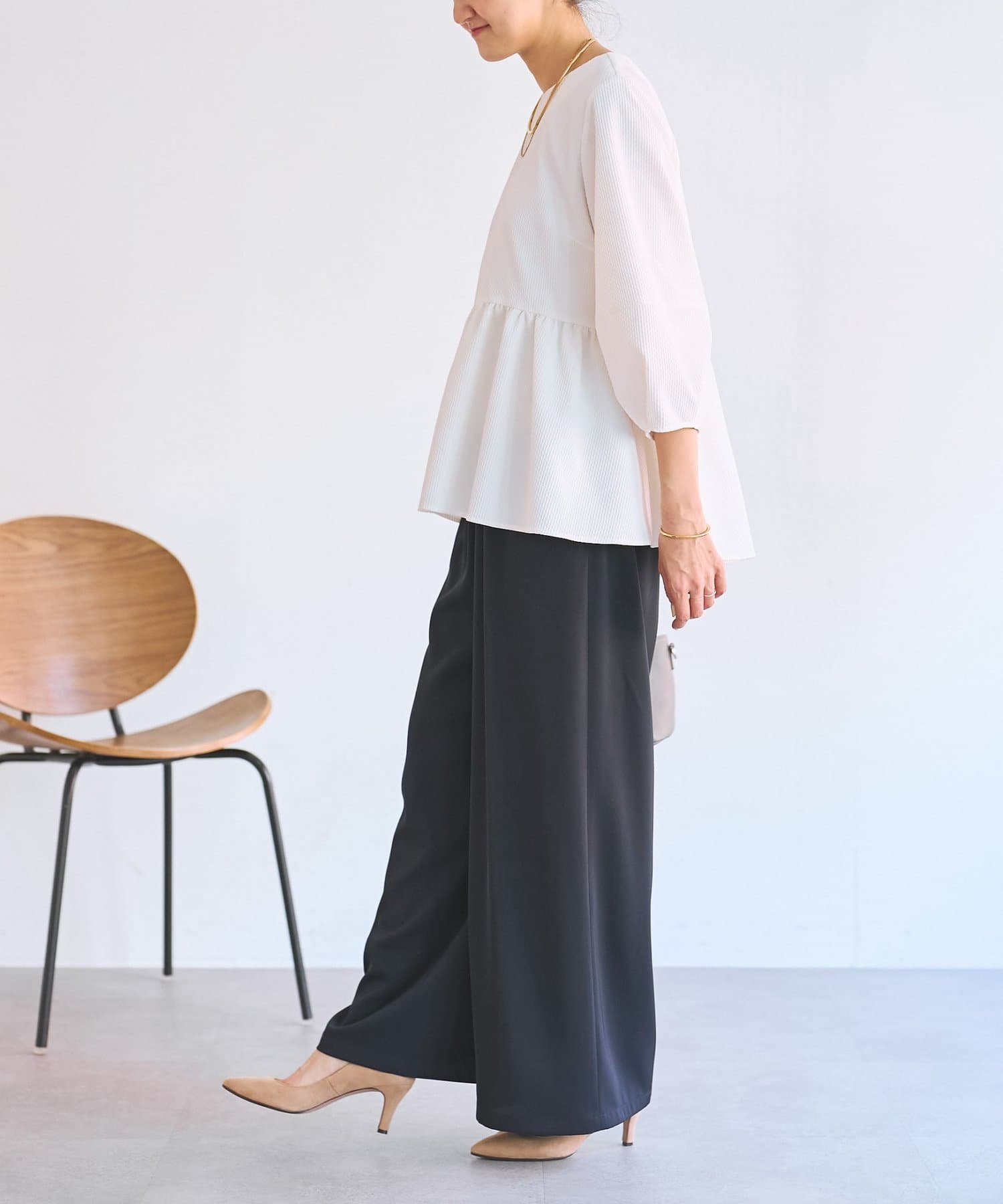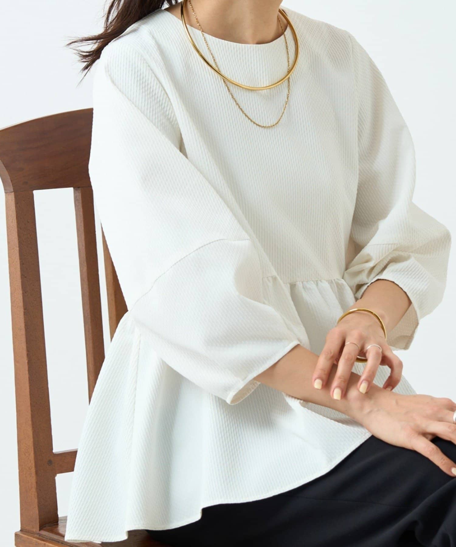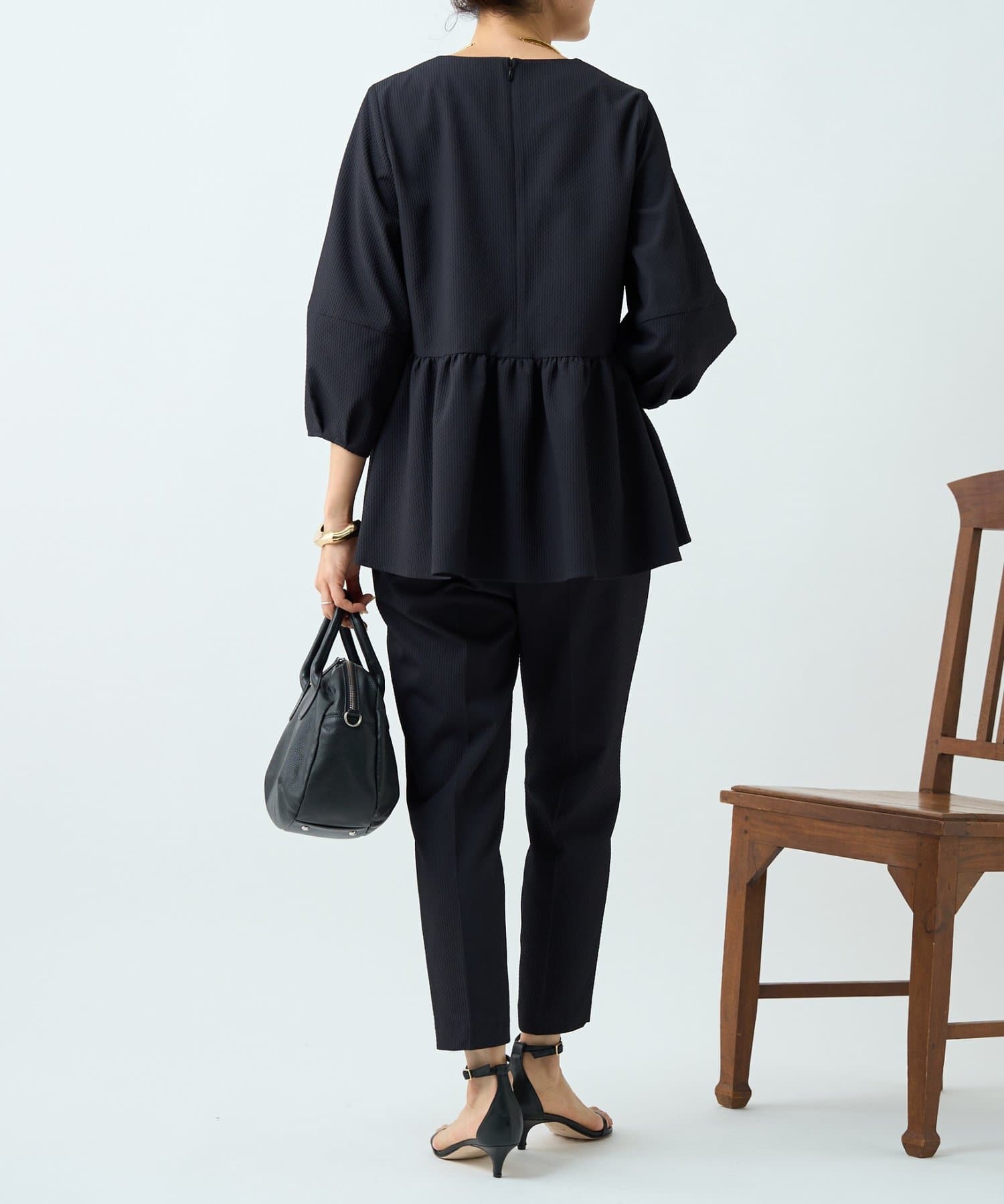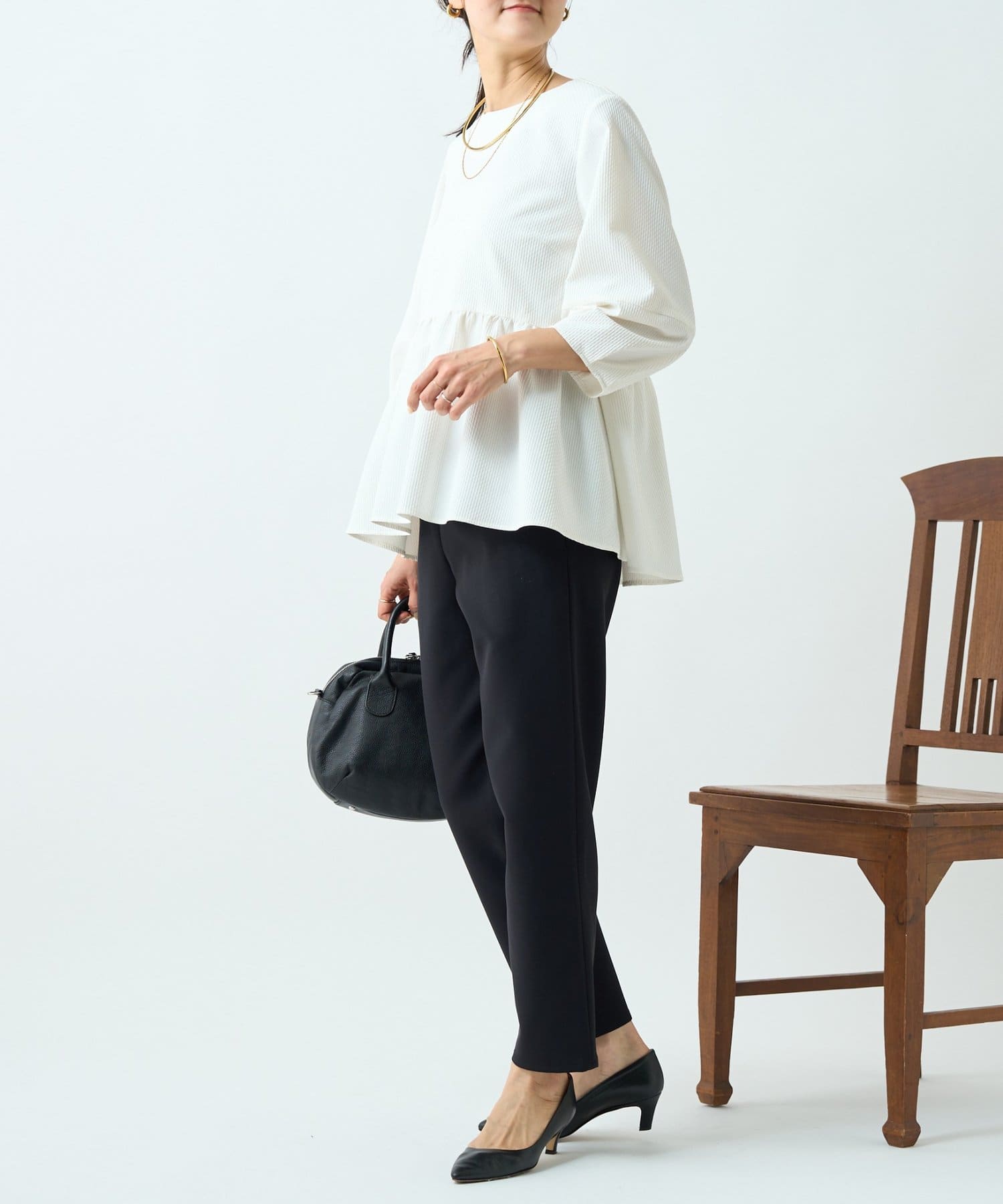 女性らしいペプラムデザインが腰回りをカバーしてくれます。
