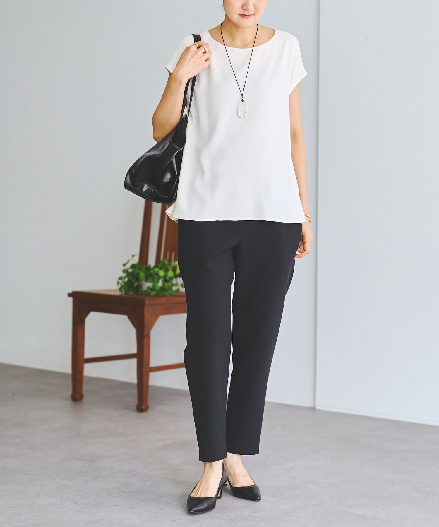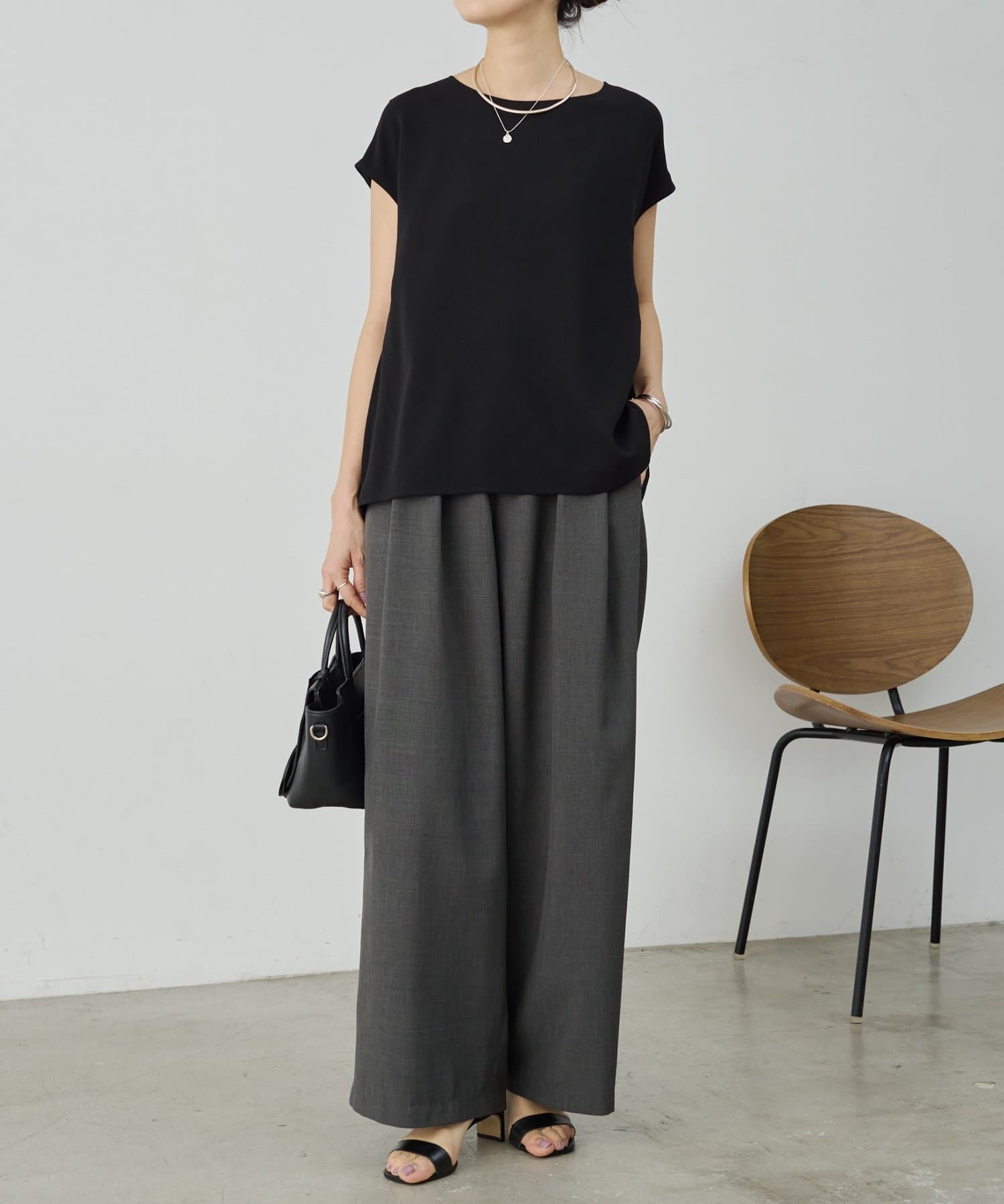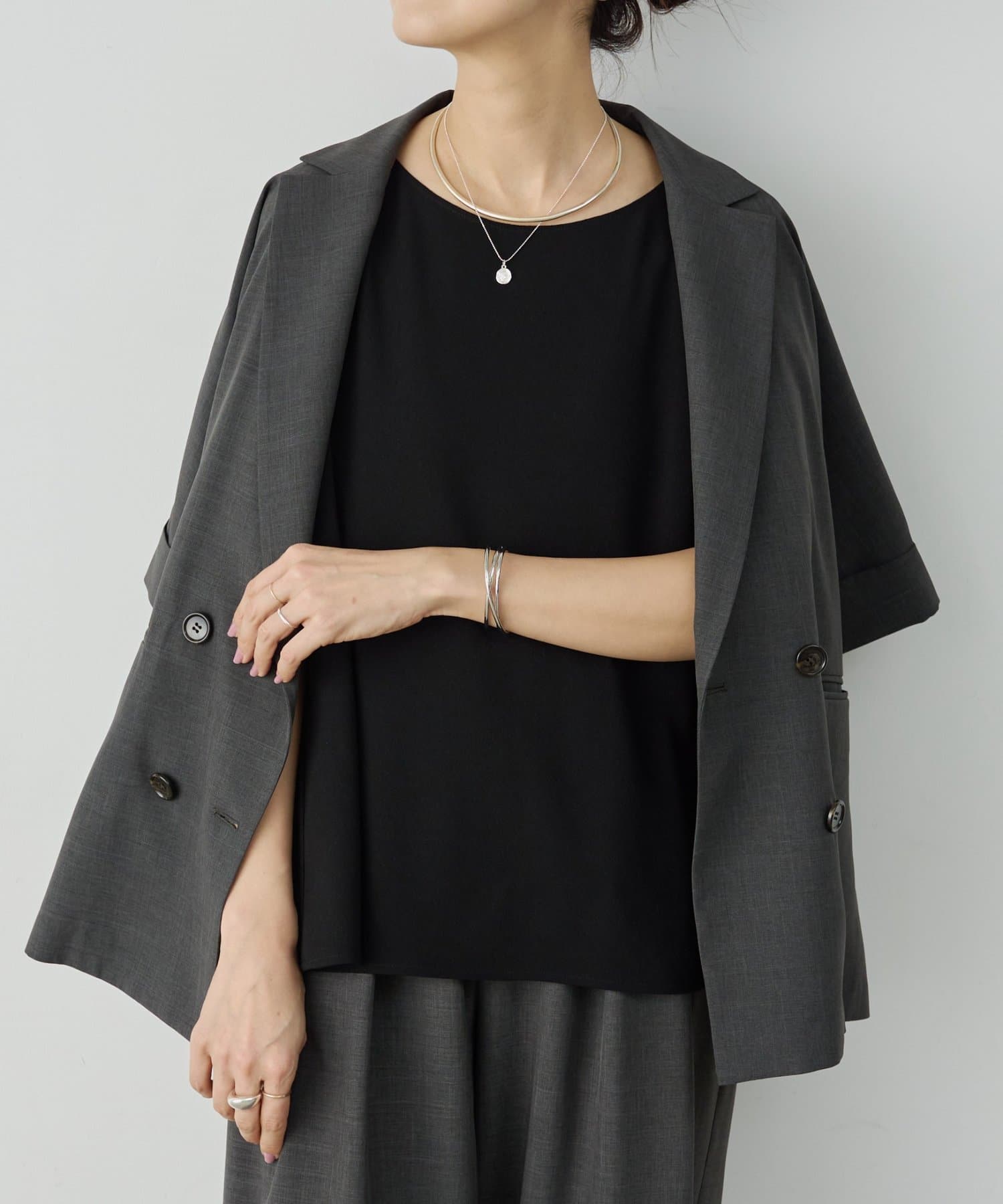 程よい厚みがありストレッチ性に優れているので体のラインを拾わず、シワになりにくいのもポイント。