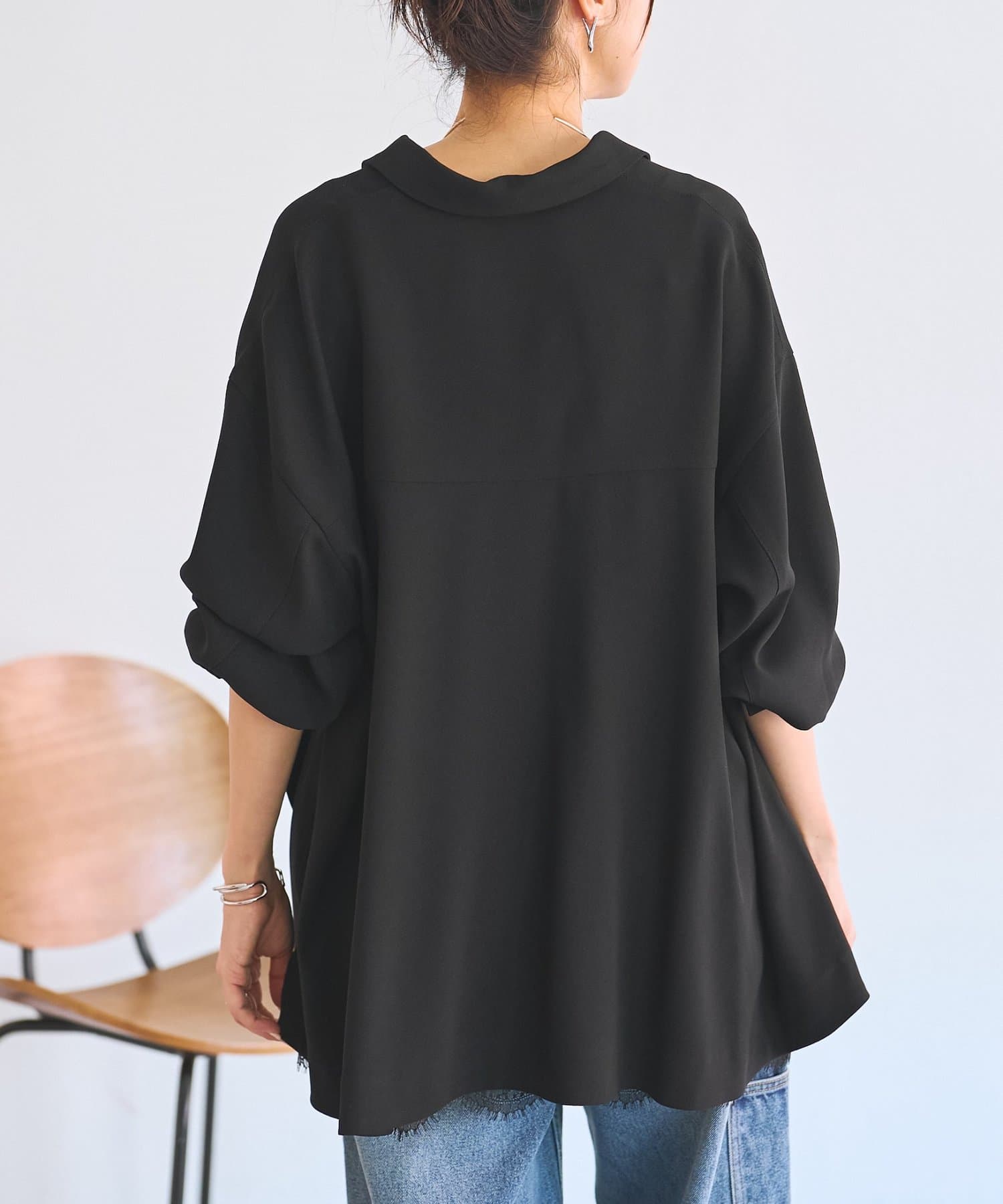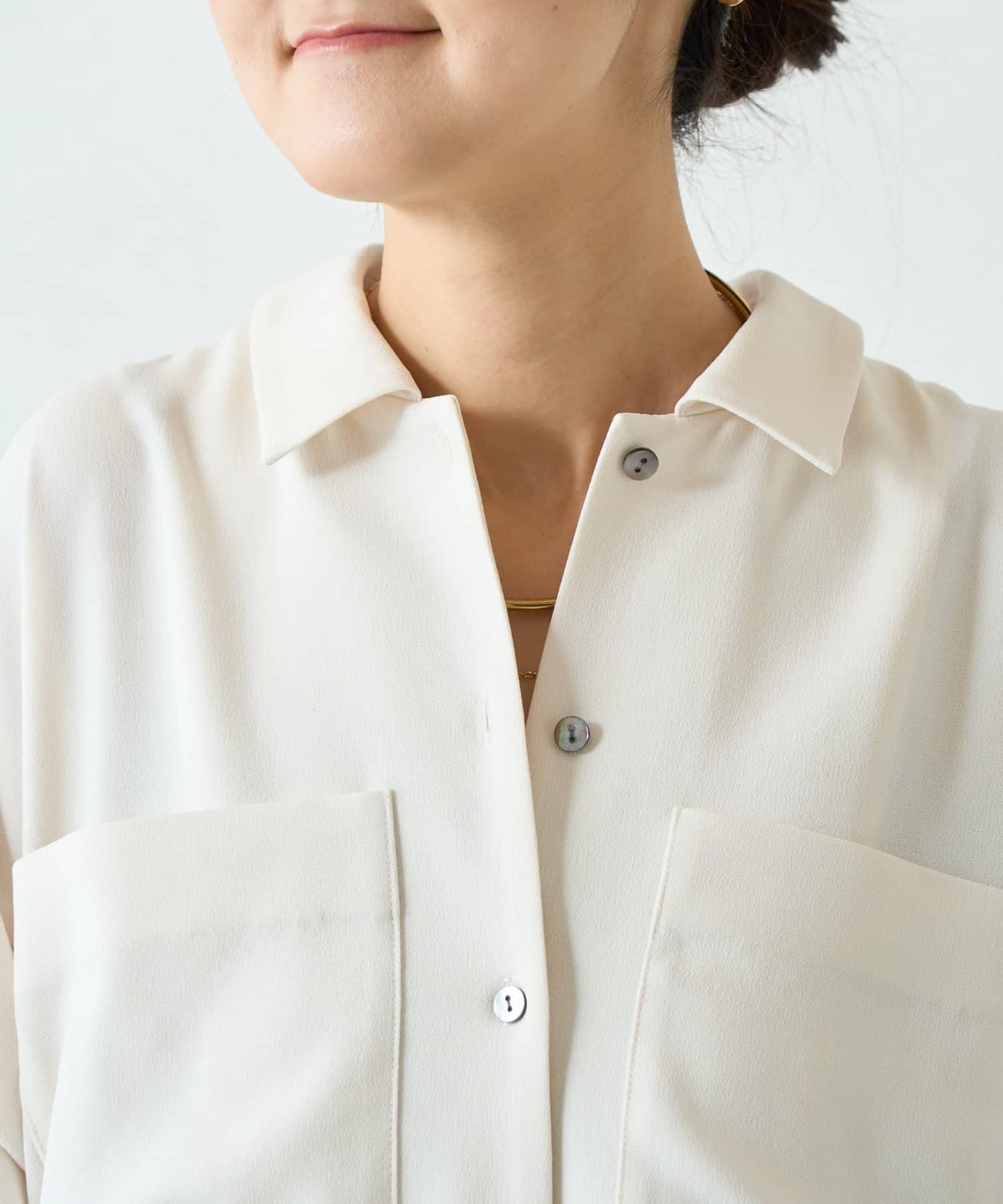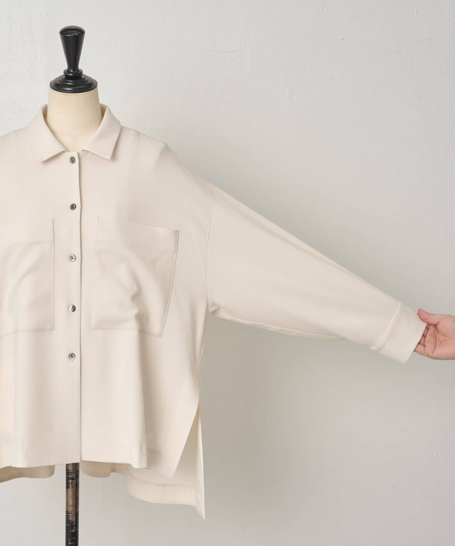 程よい厚みがありストレッチ性に優れているので体のラインを拾わず、シワになりにくいのもポイント。
