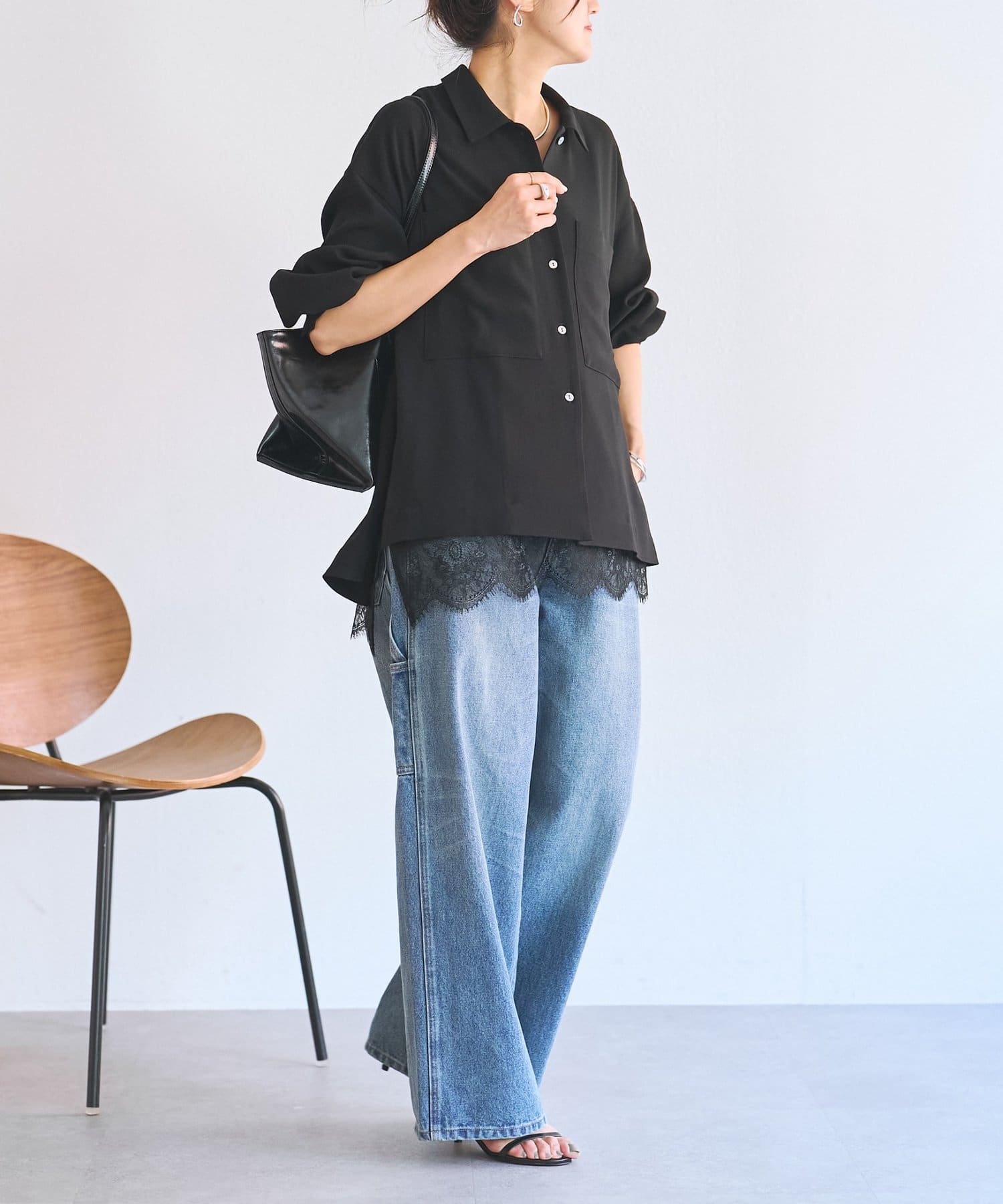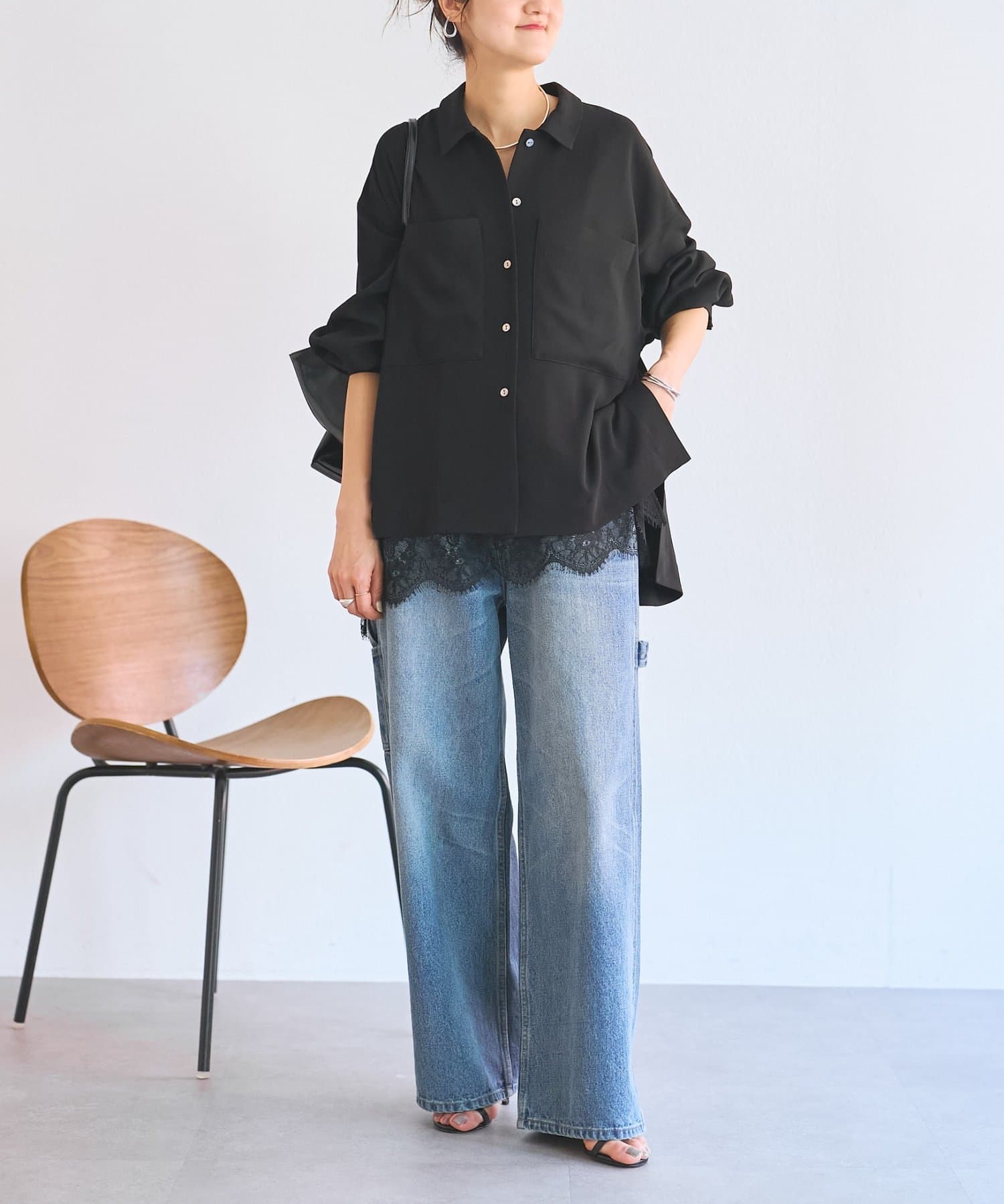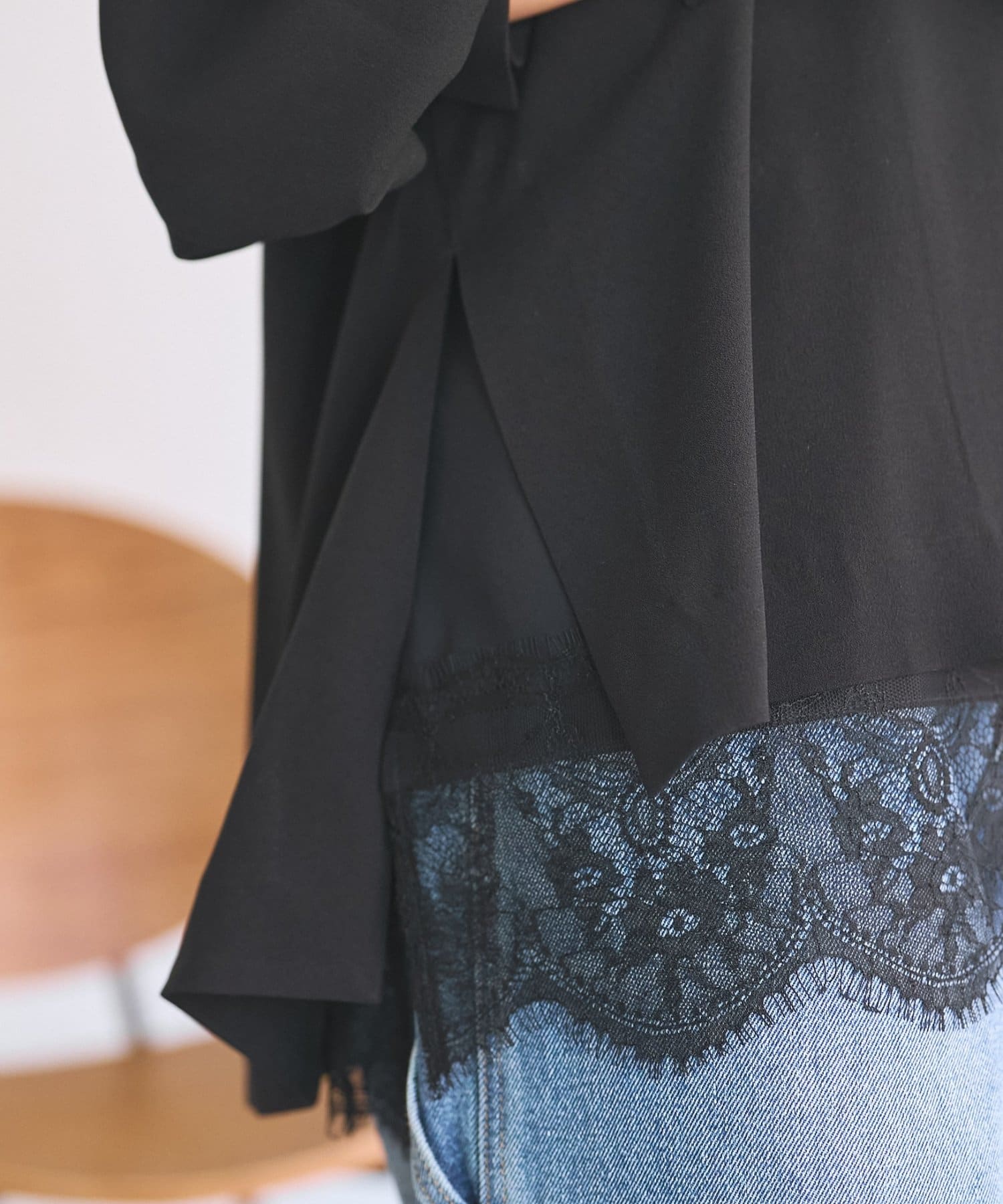 インナーのレースを裾から覗かせた綺麗めなスタイリングもおすすめ。