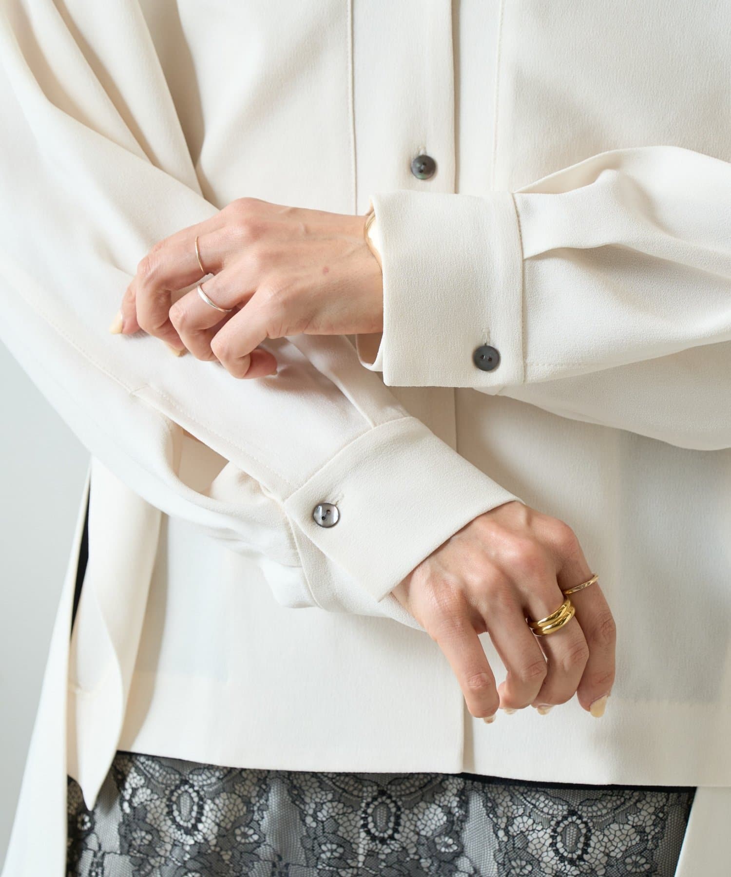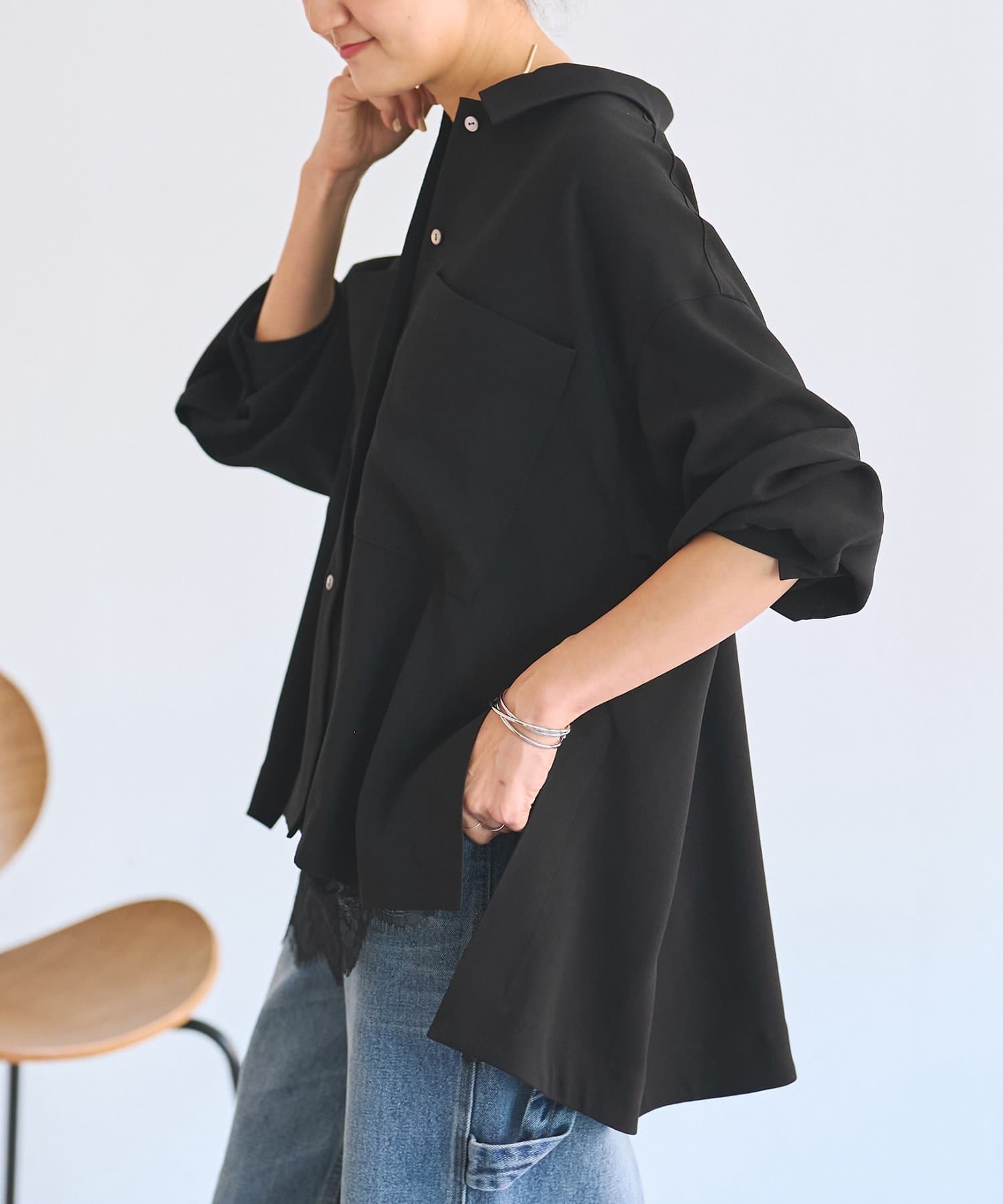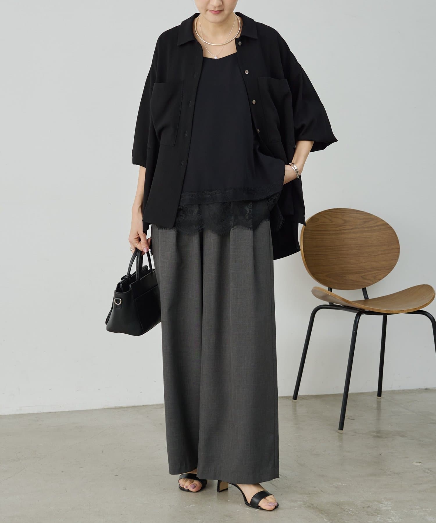 インナーのレースを裾から覗かせた綺麗めなスタイリングもおすすめ。