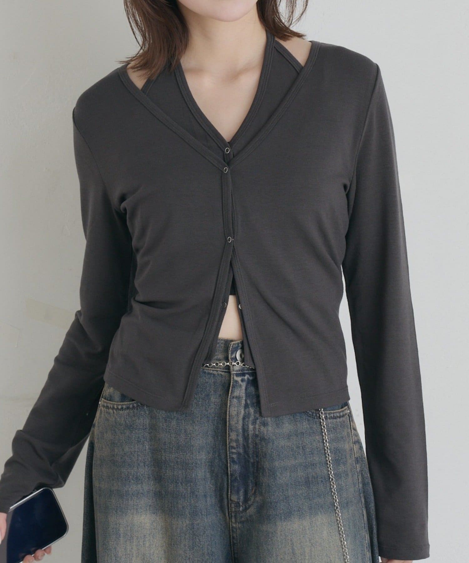 ・デコルテを綺麗に見せてくれるVネックライン。深すぎない絶妙な開き具合なのもポイント◎