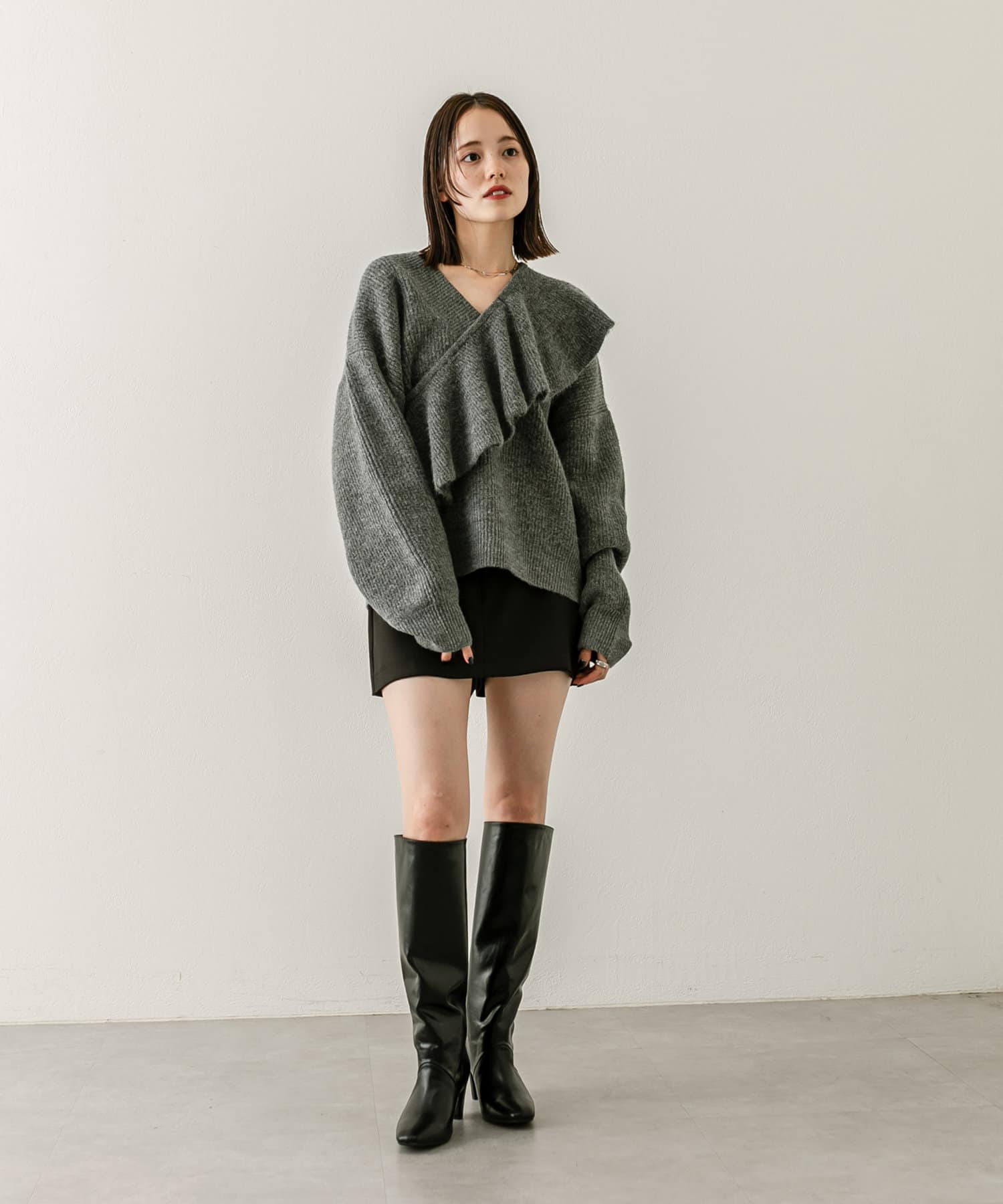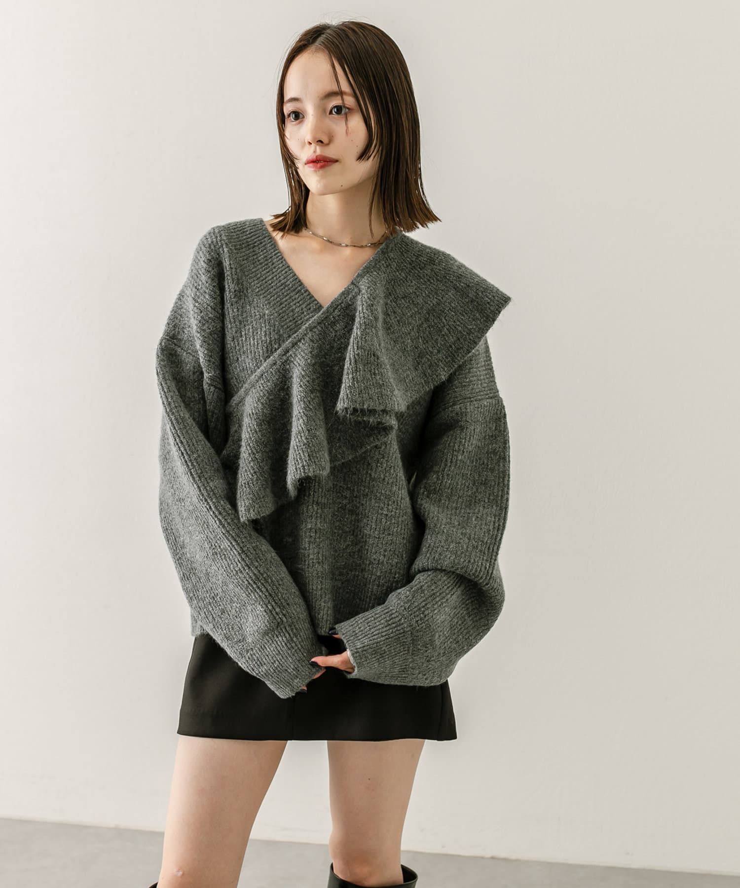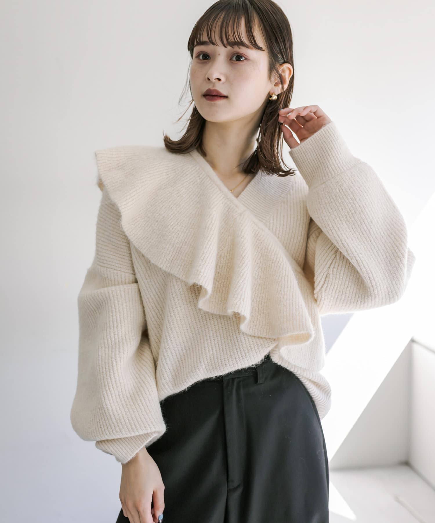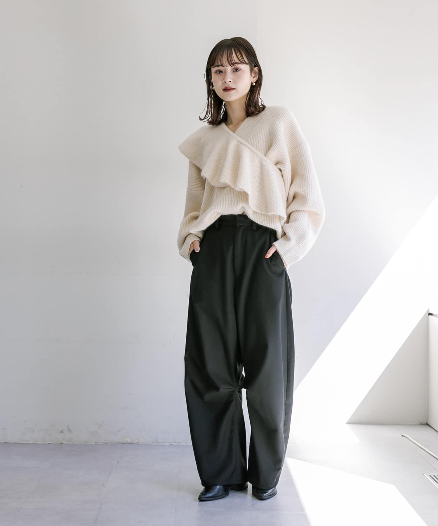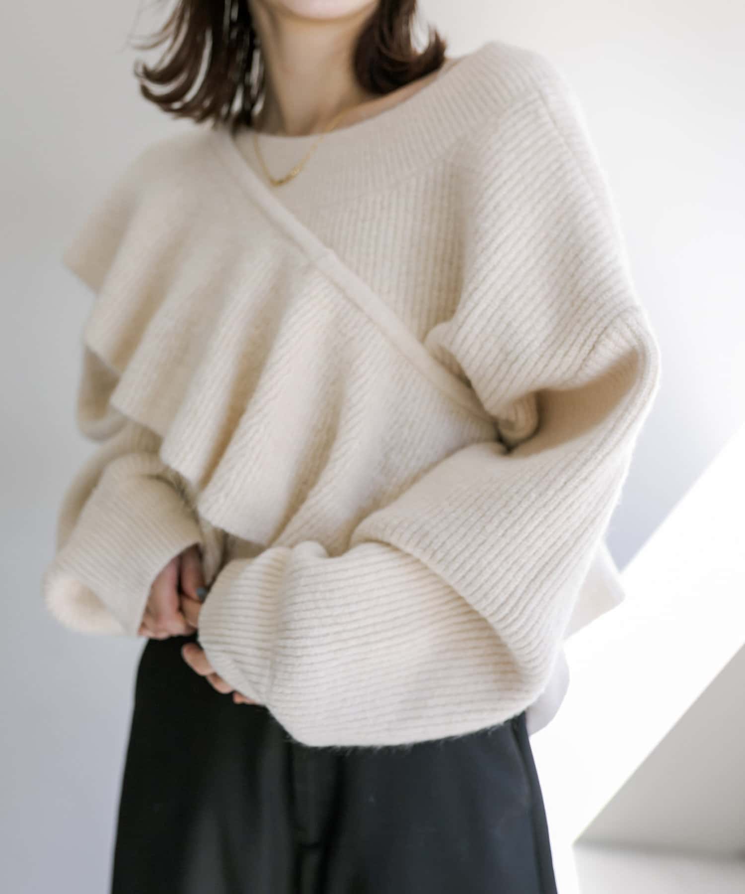 ・フリルを斜めがけしたキャッチーなスタイリングもおすすめです。