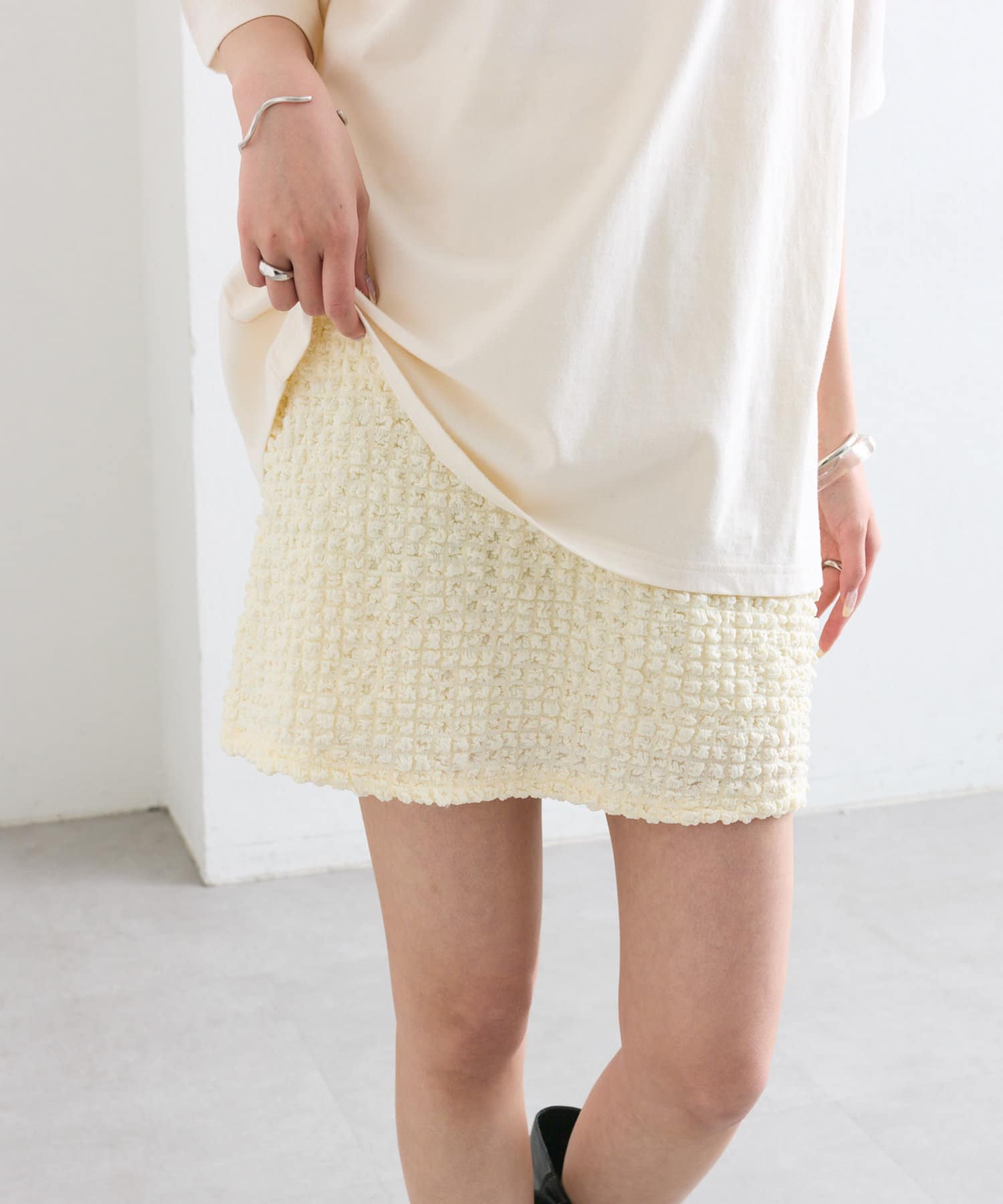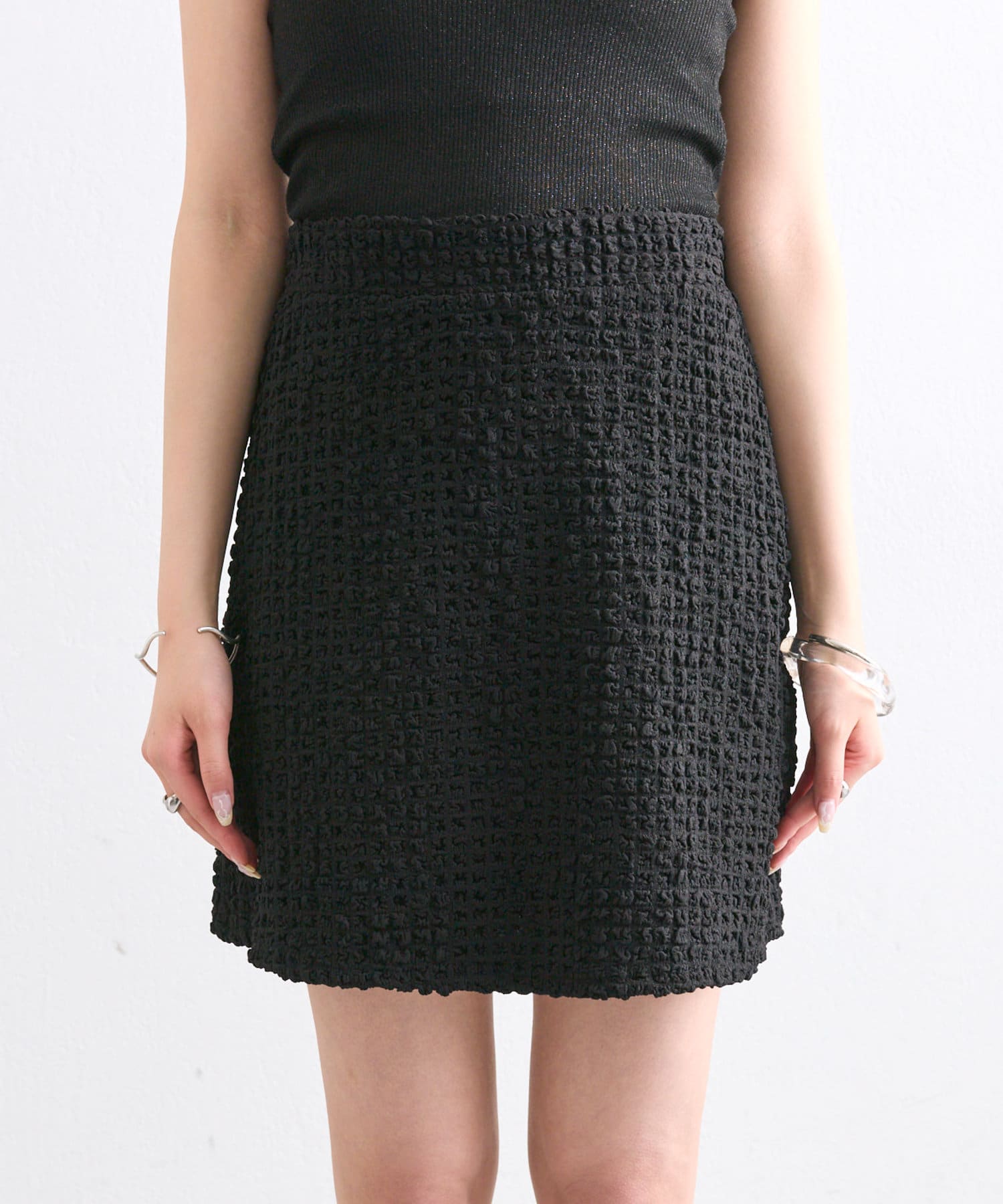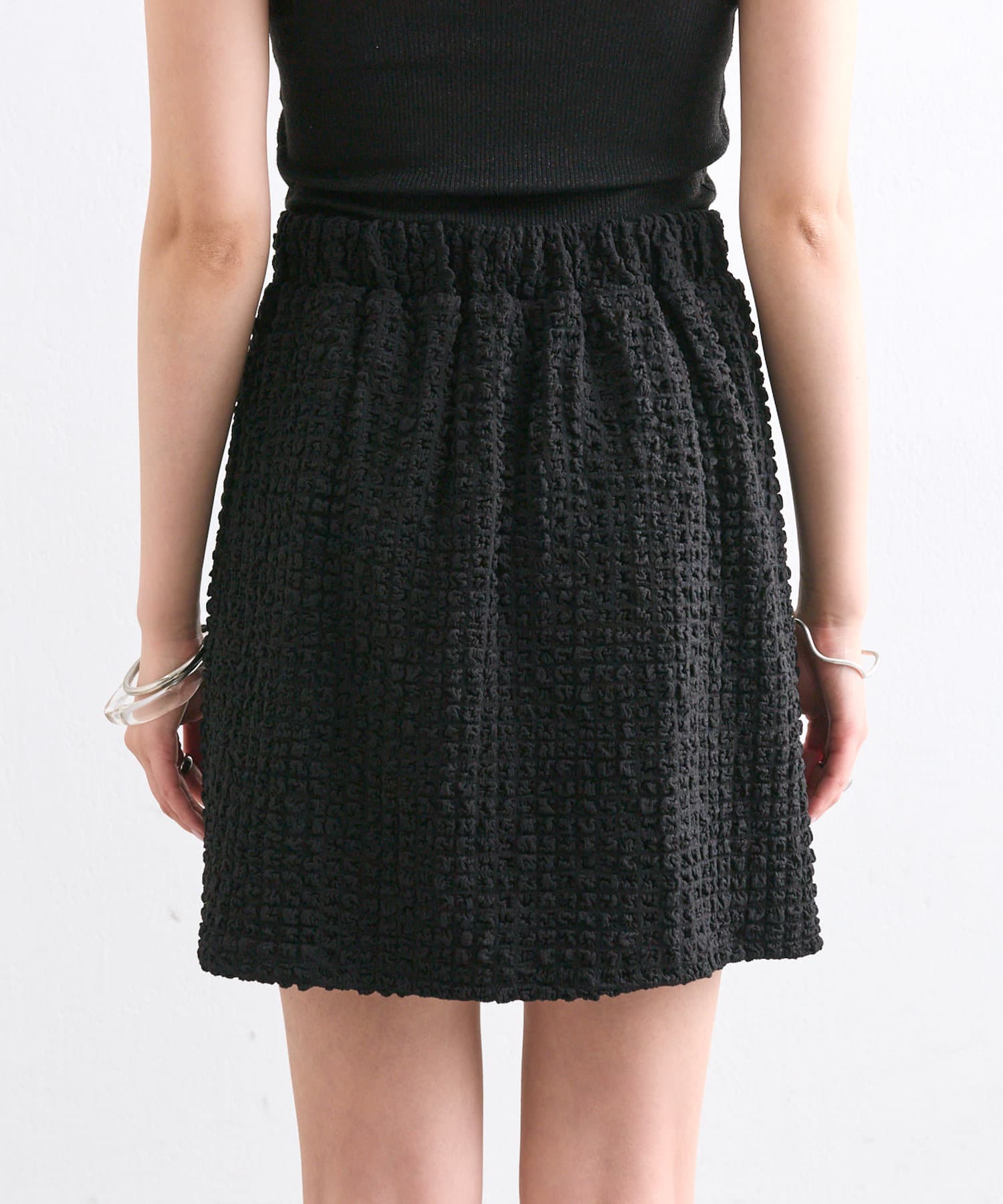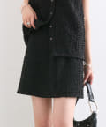 シャーリング素材の表面的な生地がポイントのミニスカート。