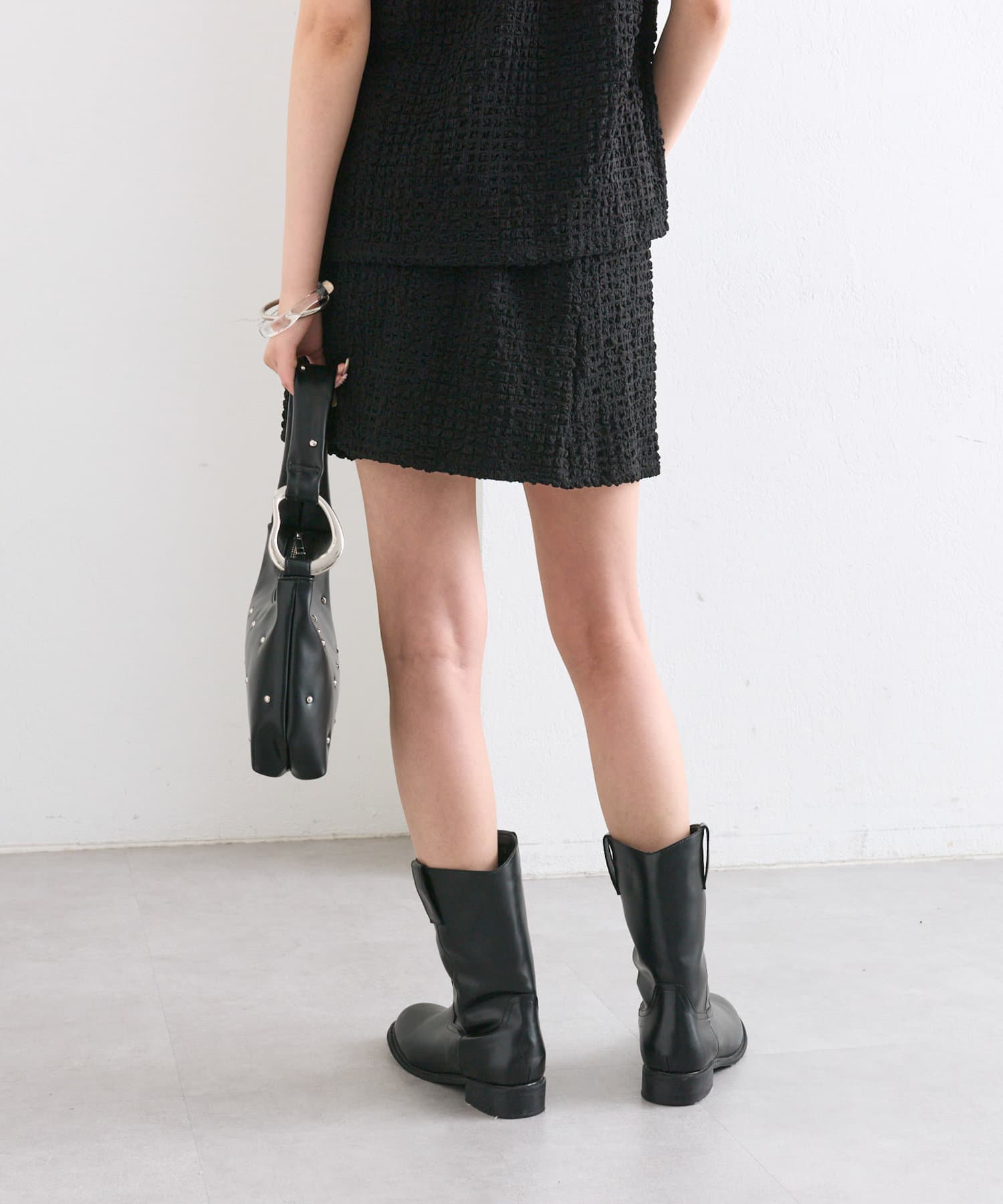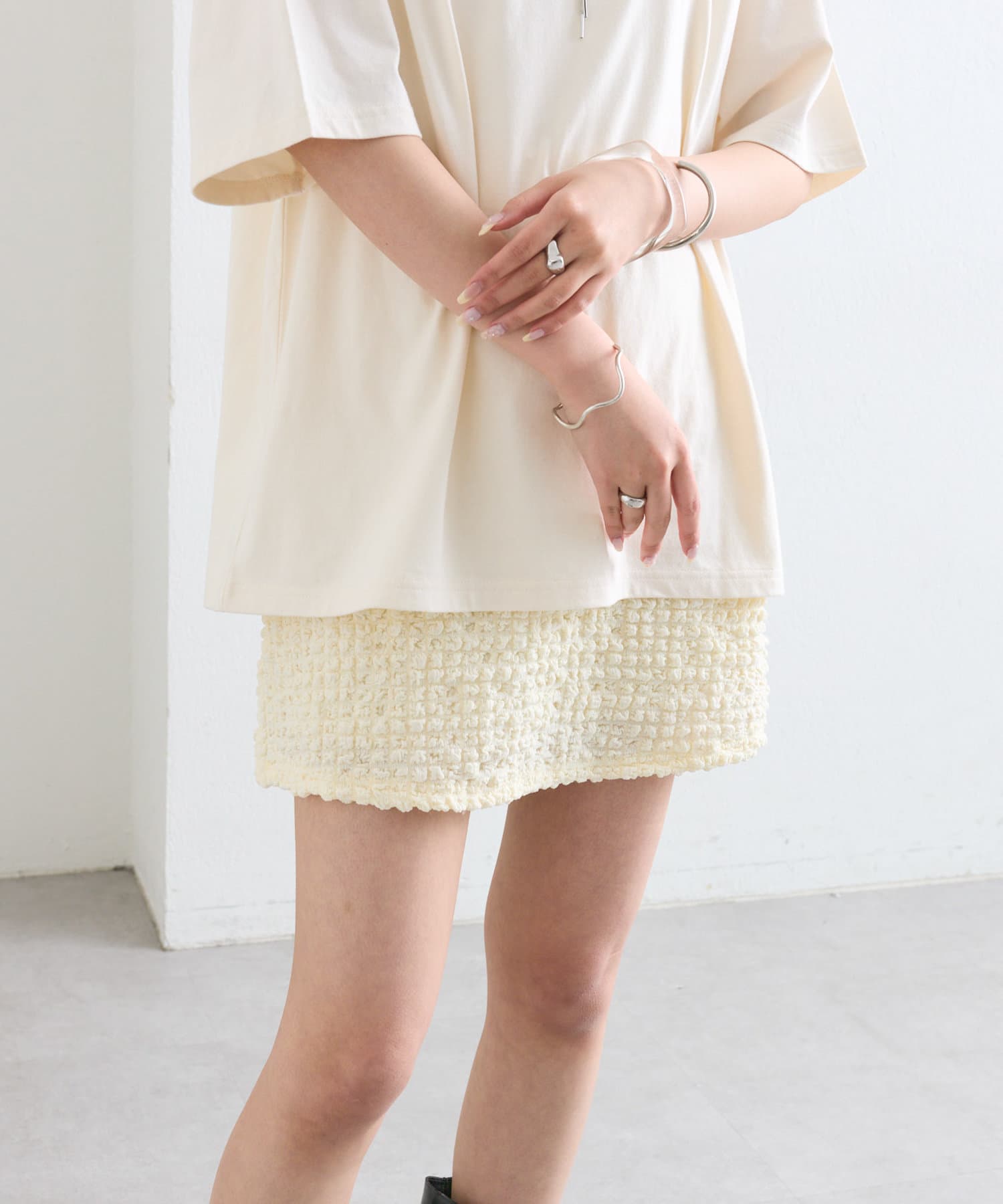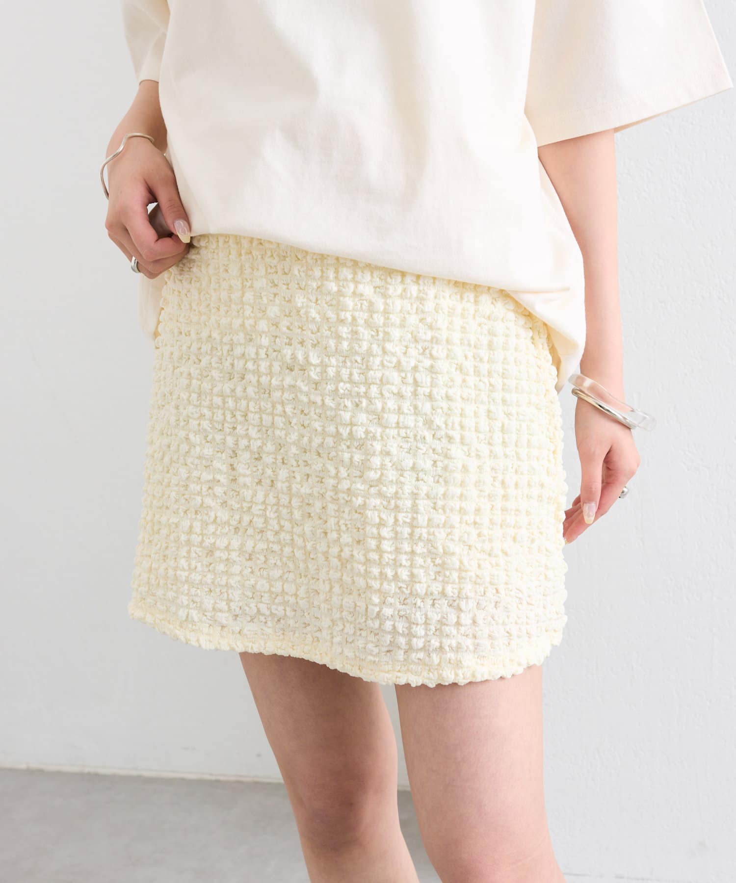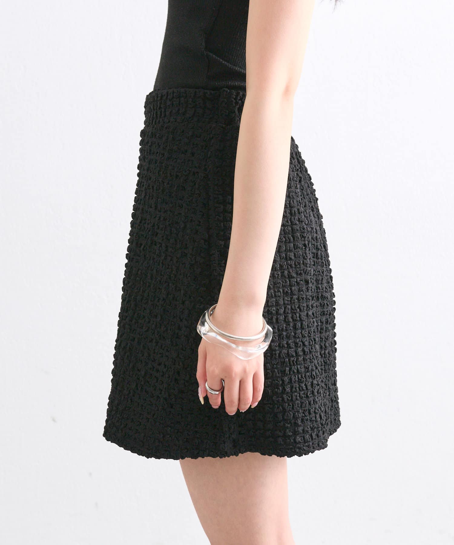 シャーリング素材の表面的な生地がポイントのミニスカート。
