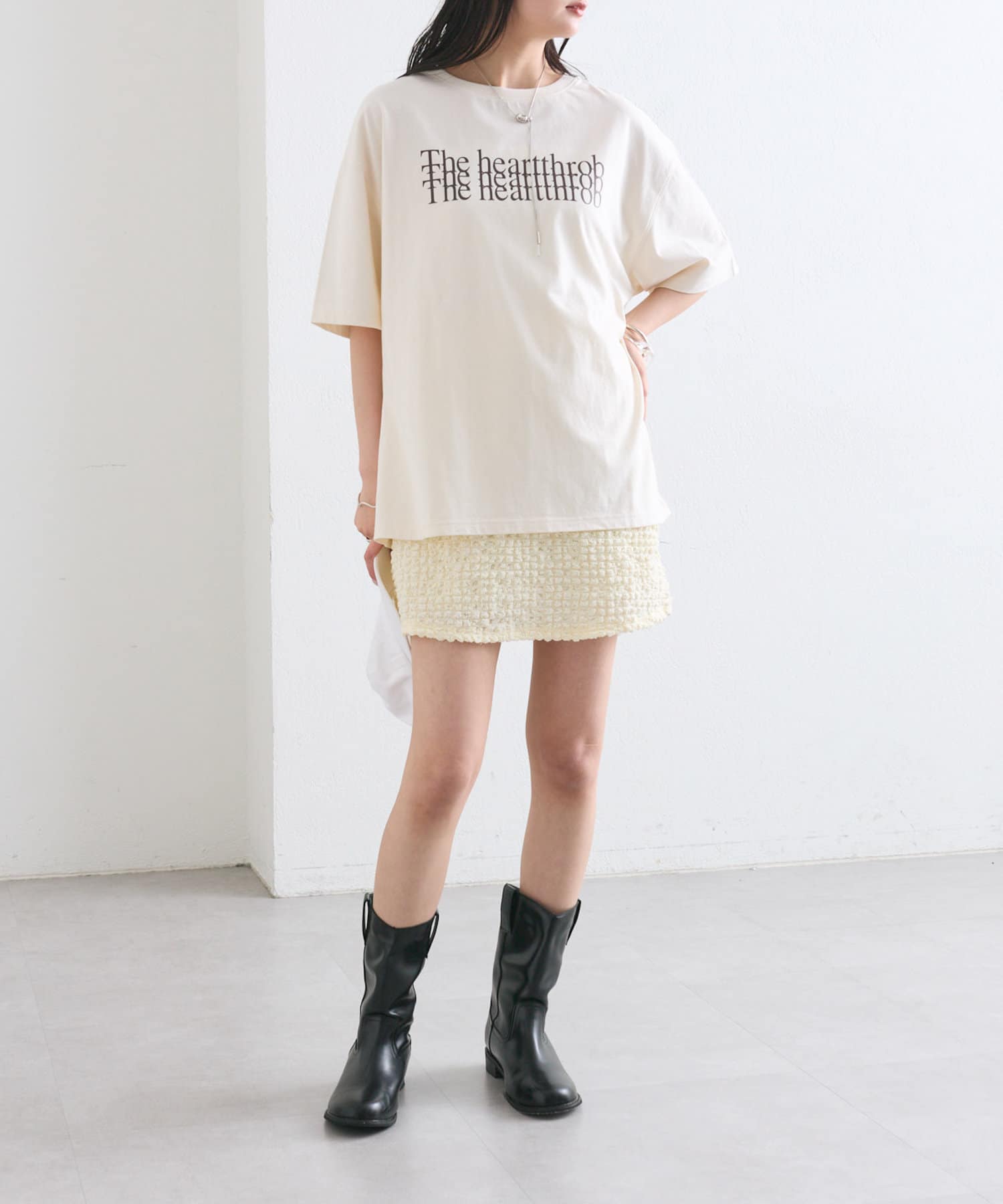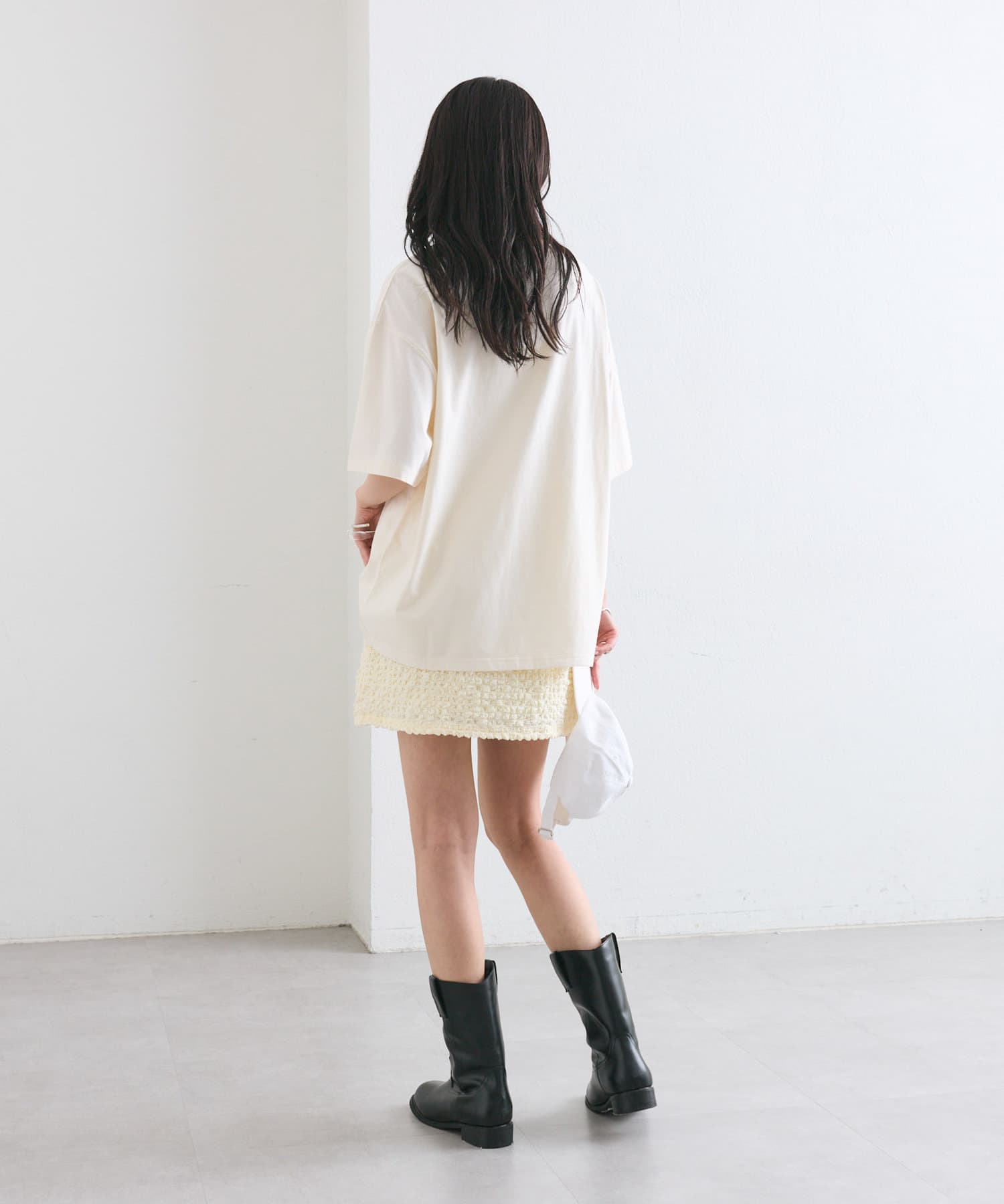 ロングブーツを合わせるだけで、トレンドライクなコーデに。