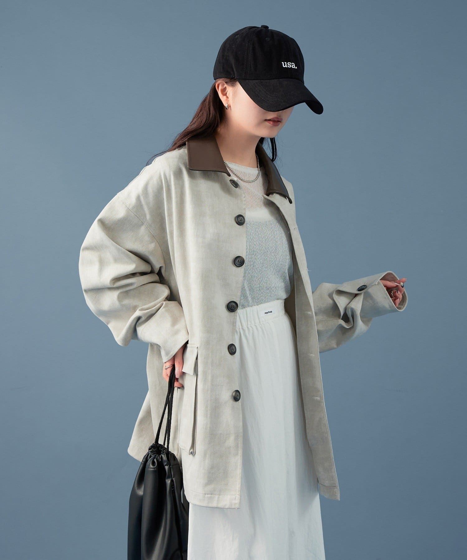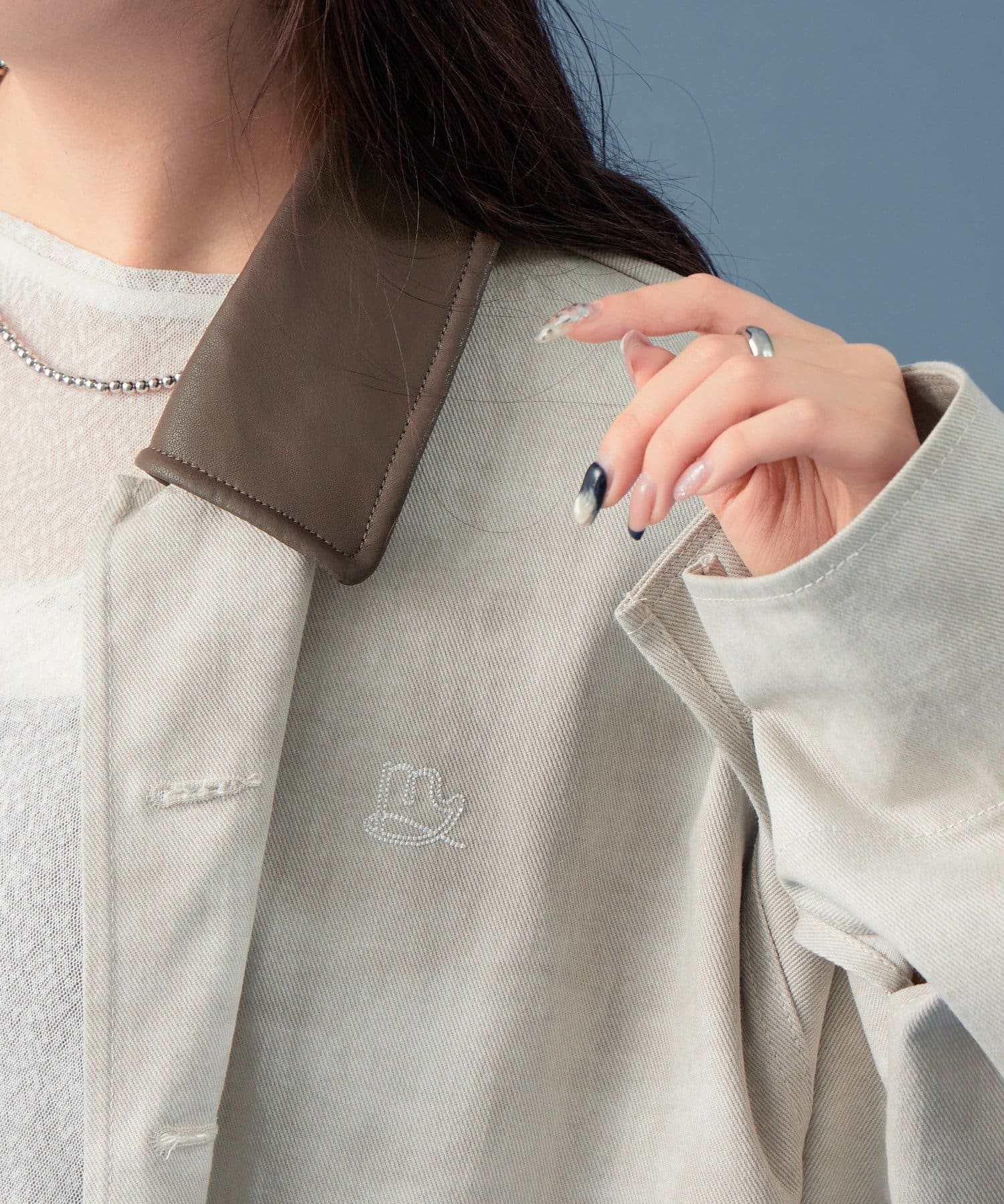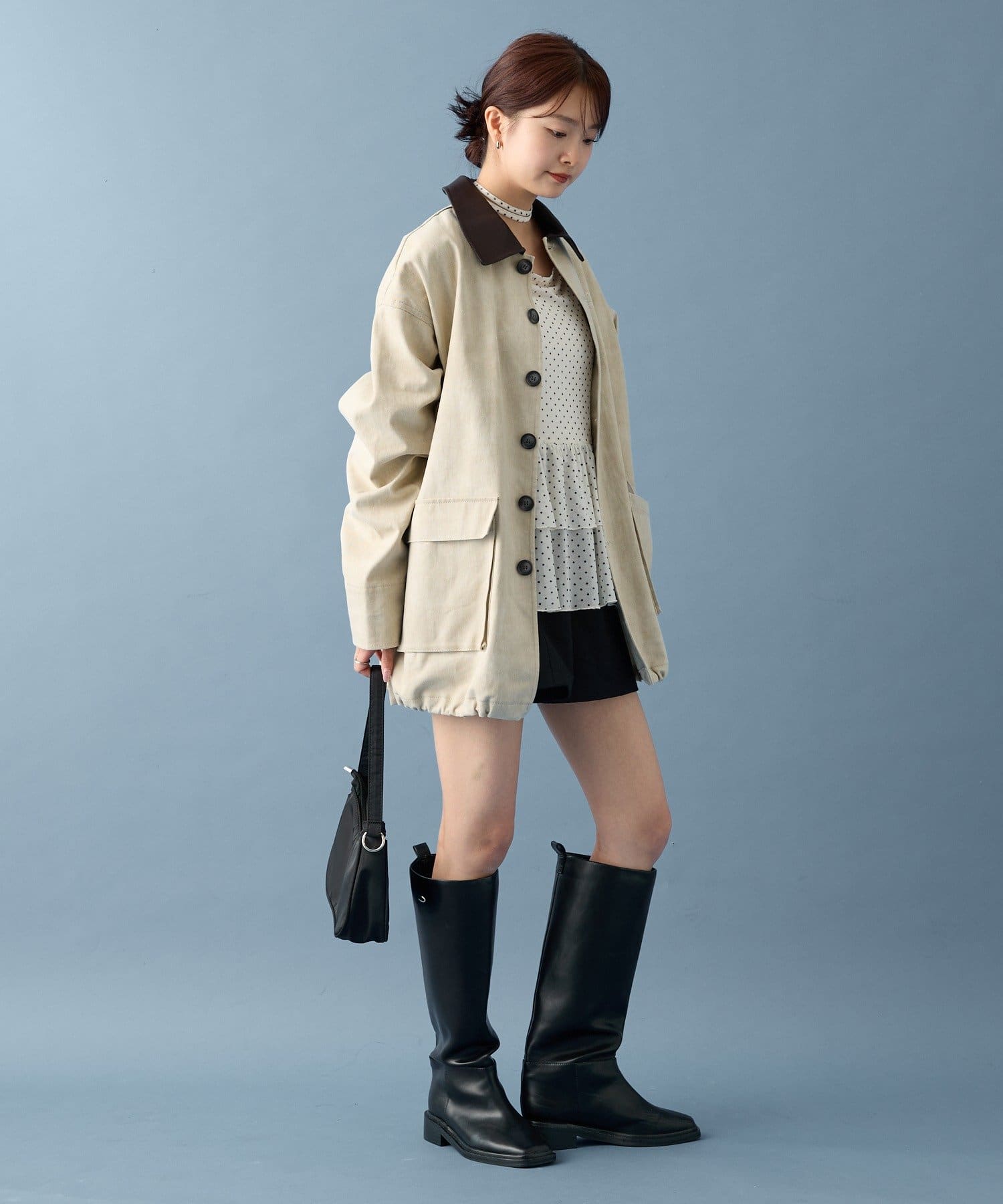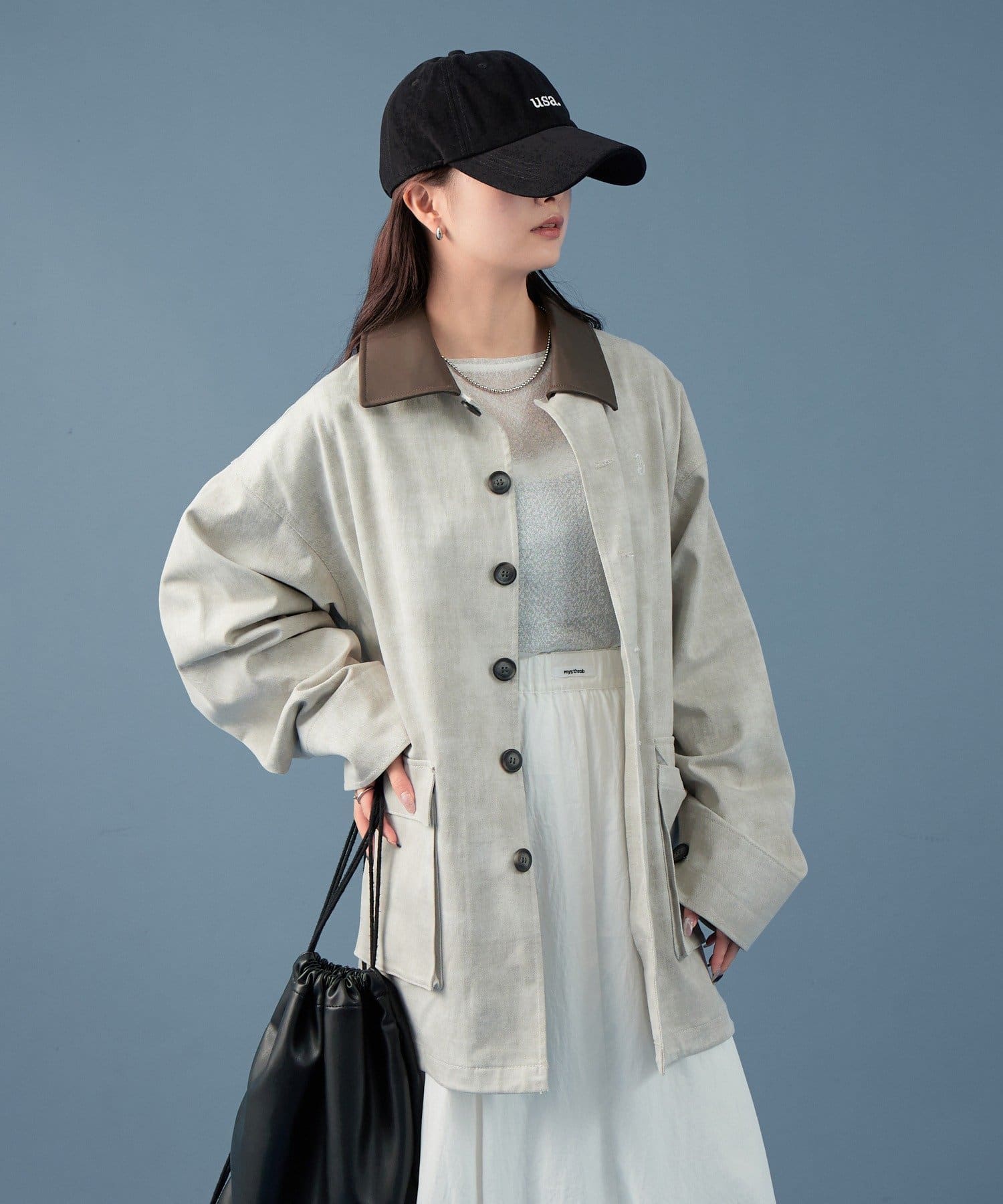 ・襟部分の合成皮革が、スタイリングに上品さをプラスします。