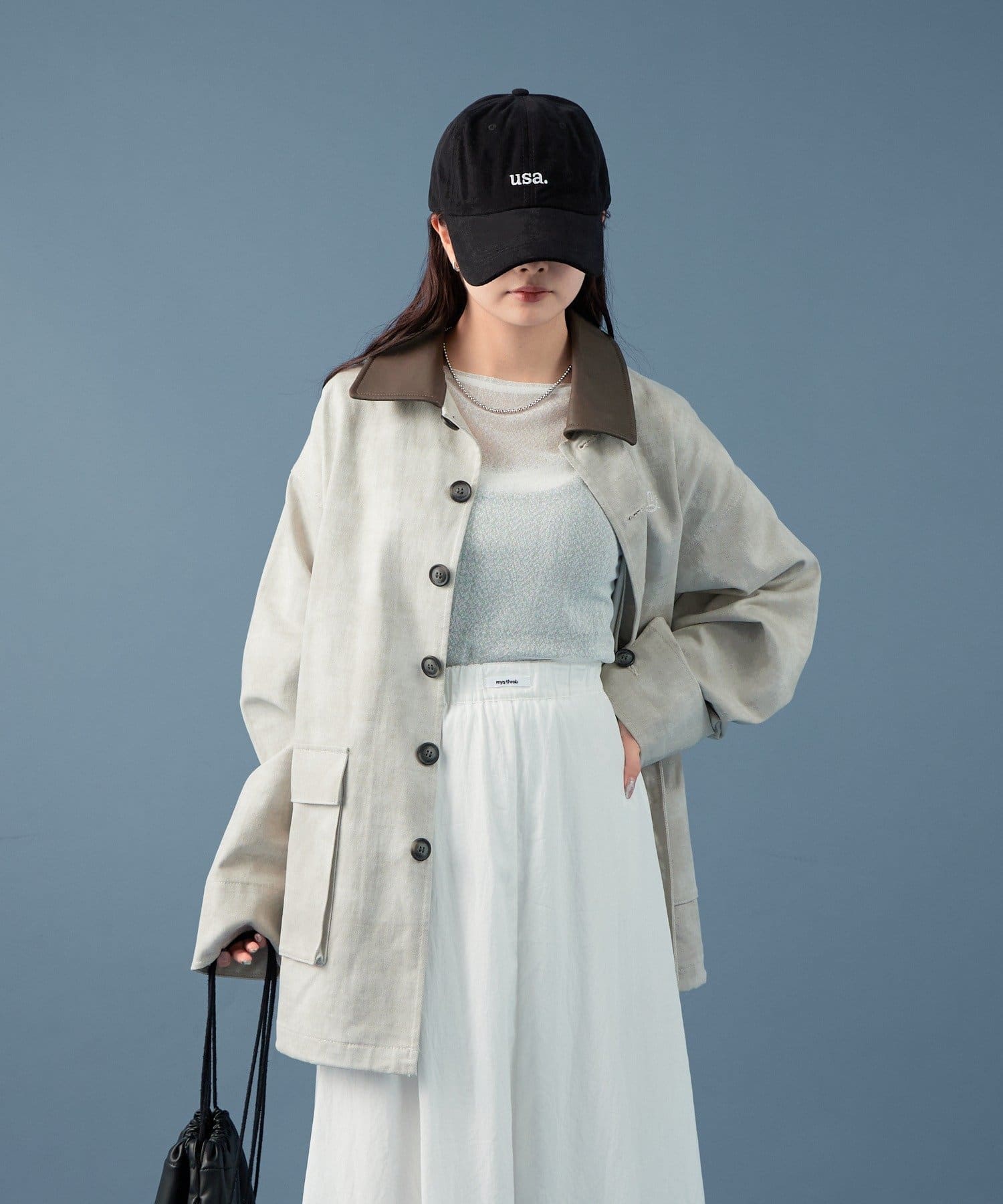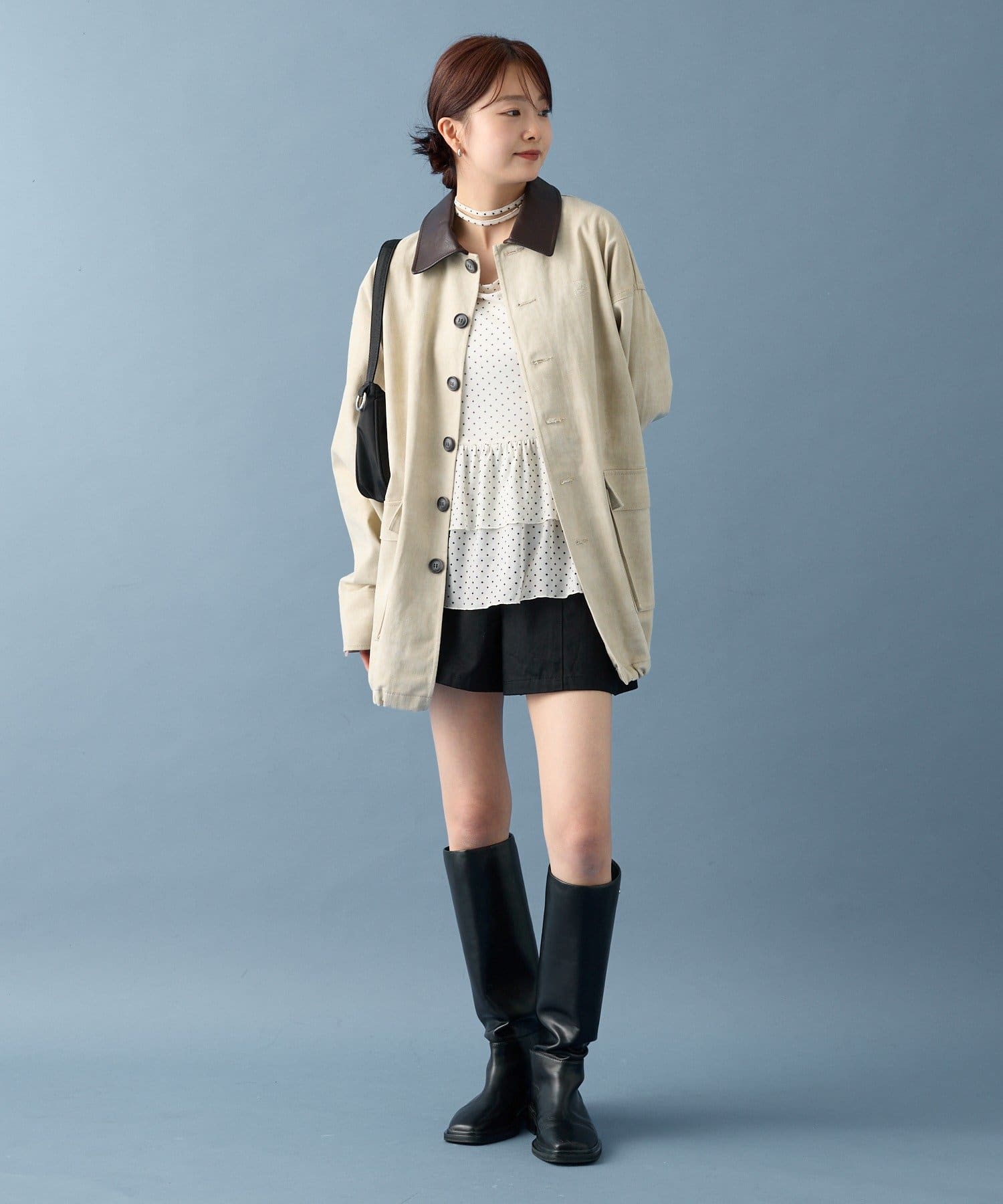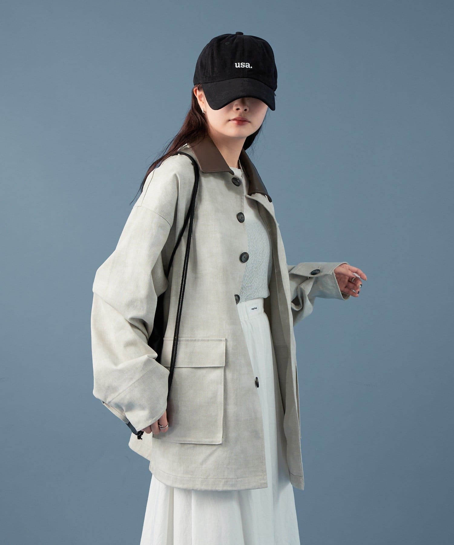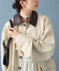 ・襟部分の合成皮革が、スタイリングに上品さをプラスします。