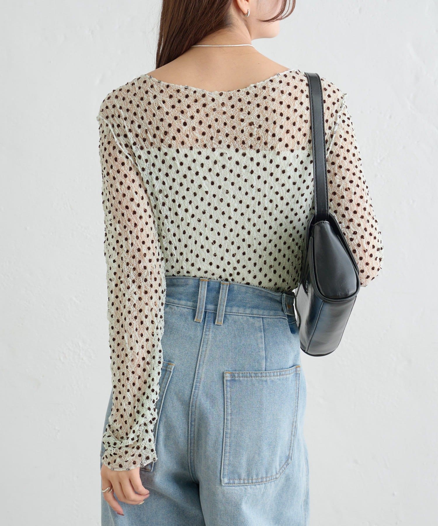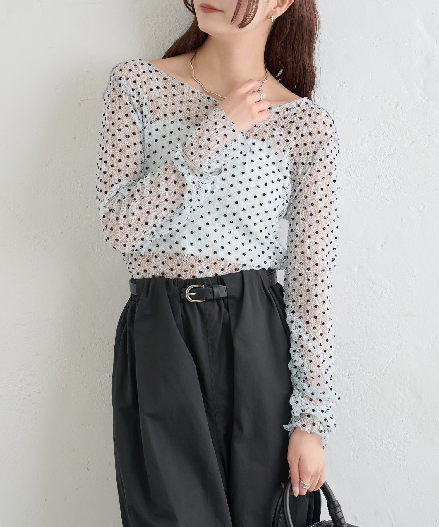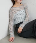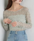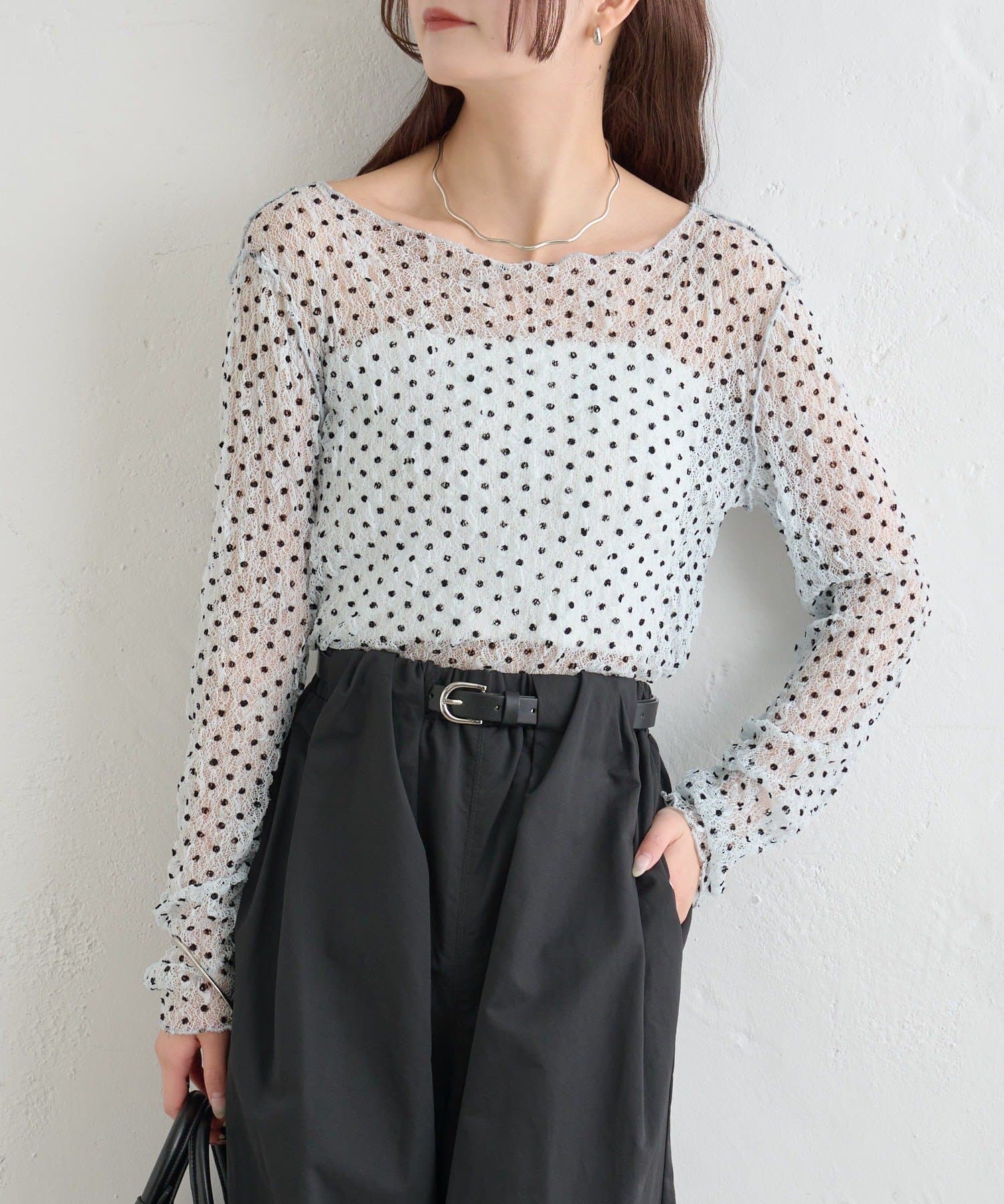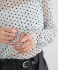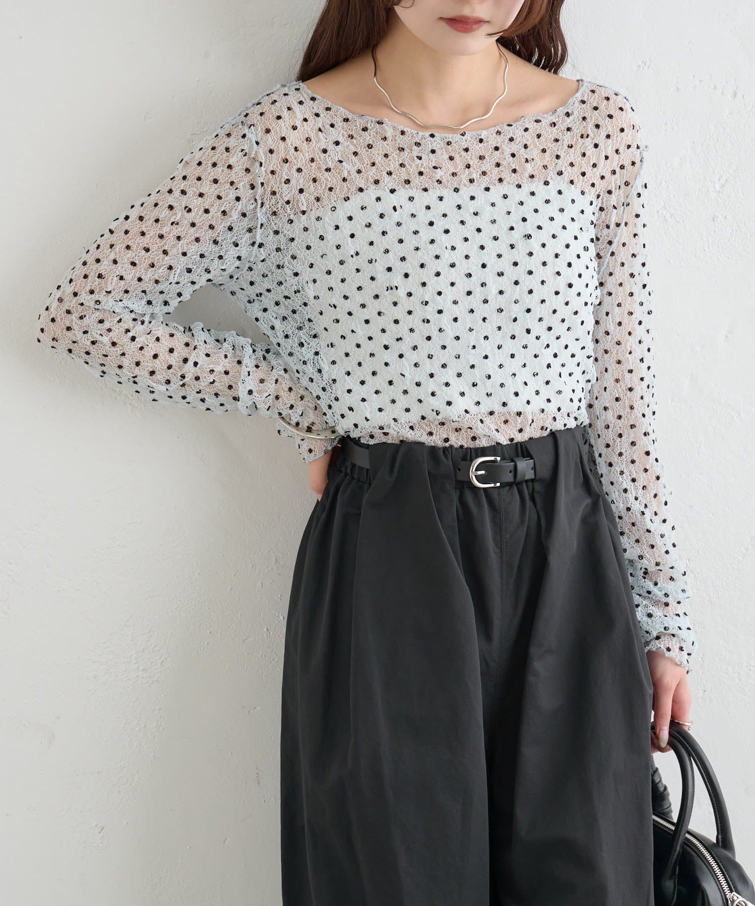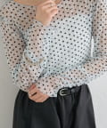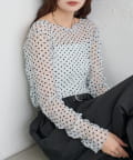 ・ふんわりと軽やかな印象のドット柄シアートップス。シアー素材ならではの透け感で抜け感と軽やかさをプラスしました。