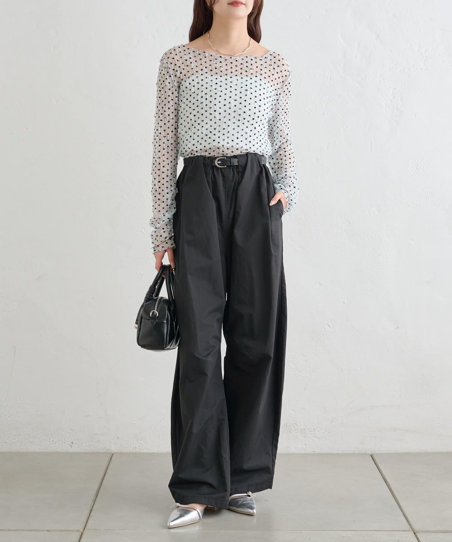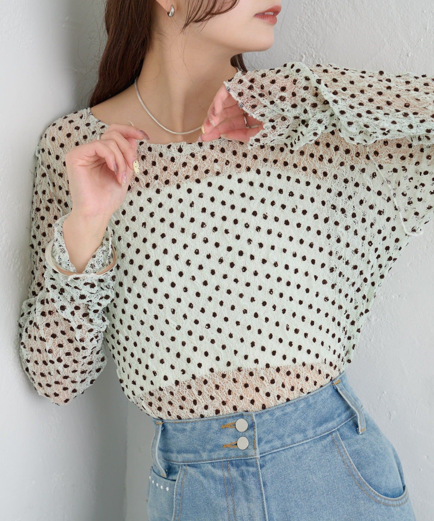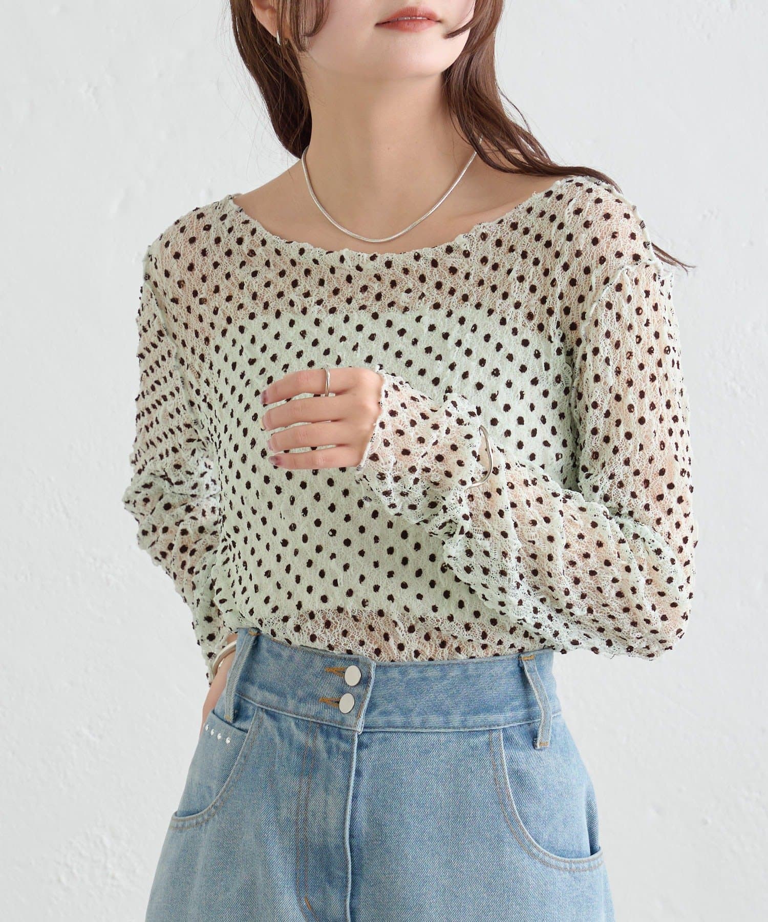 ・ふんわりと軽やかな印象のドット柄シアートップス。シアー素材ならではの透け感で抜け感と軽やかさをプラスしました。
