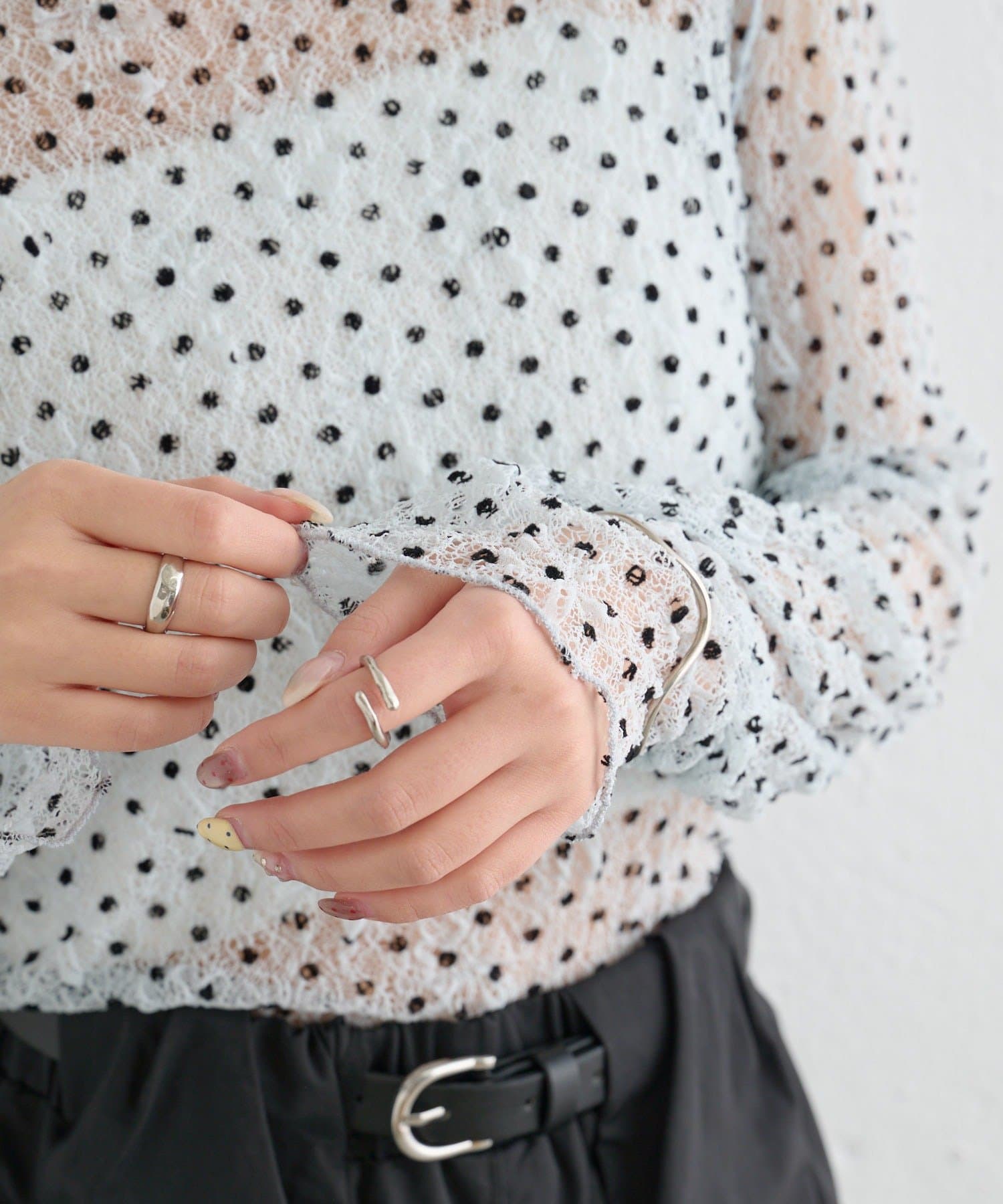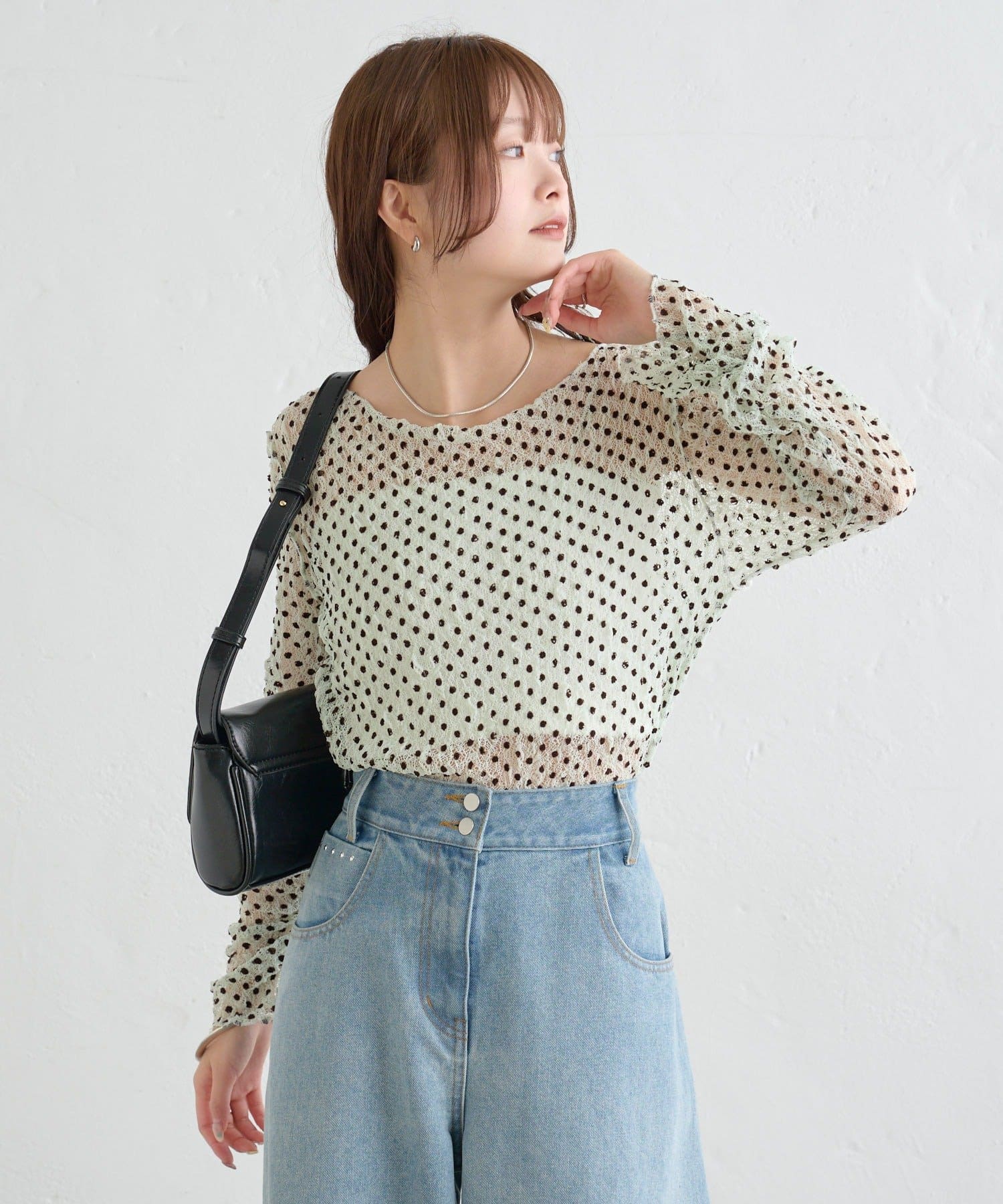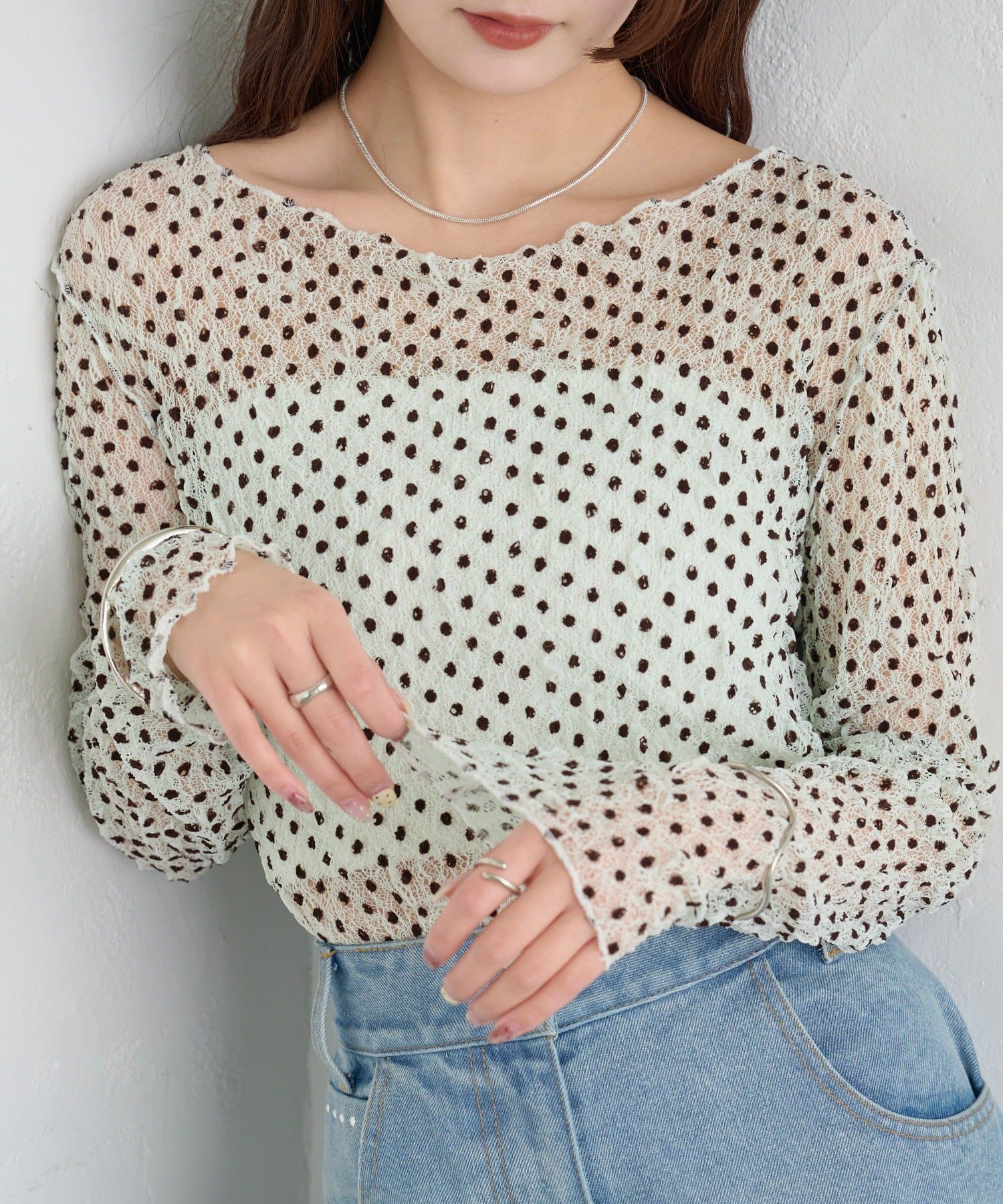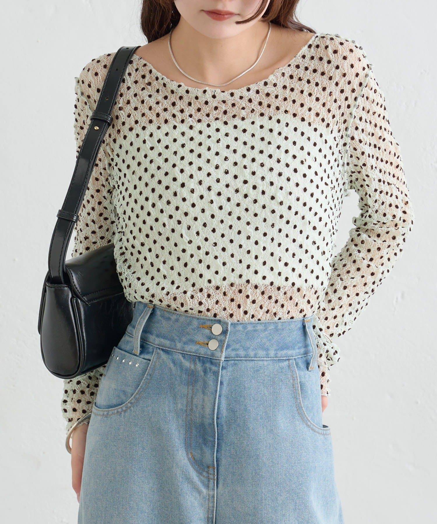 ・ふんわりと軽やかな印象のドット柄シアートップス。シアー素材ならではの透け感で抜け感と軽やかさをプラスしました。