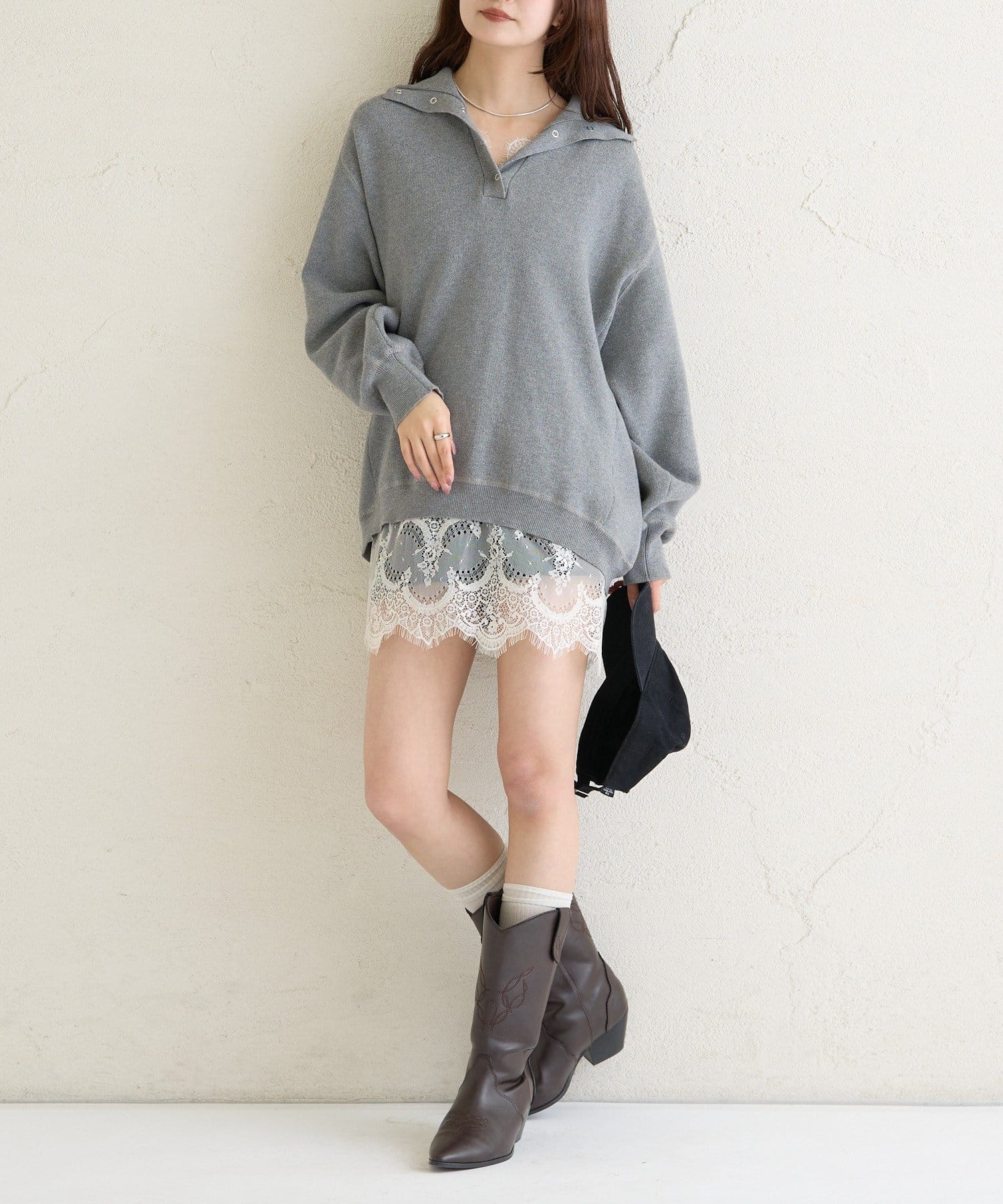 ・ミニボトムスを履いてワンピース風に着るのも。足元はロングブーツ×ソックスでトレンド感のあるコーディネートに♩