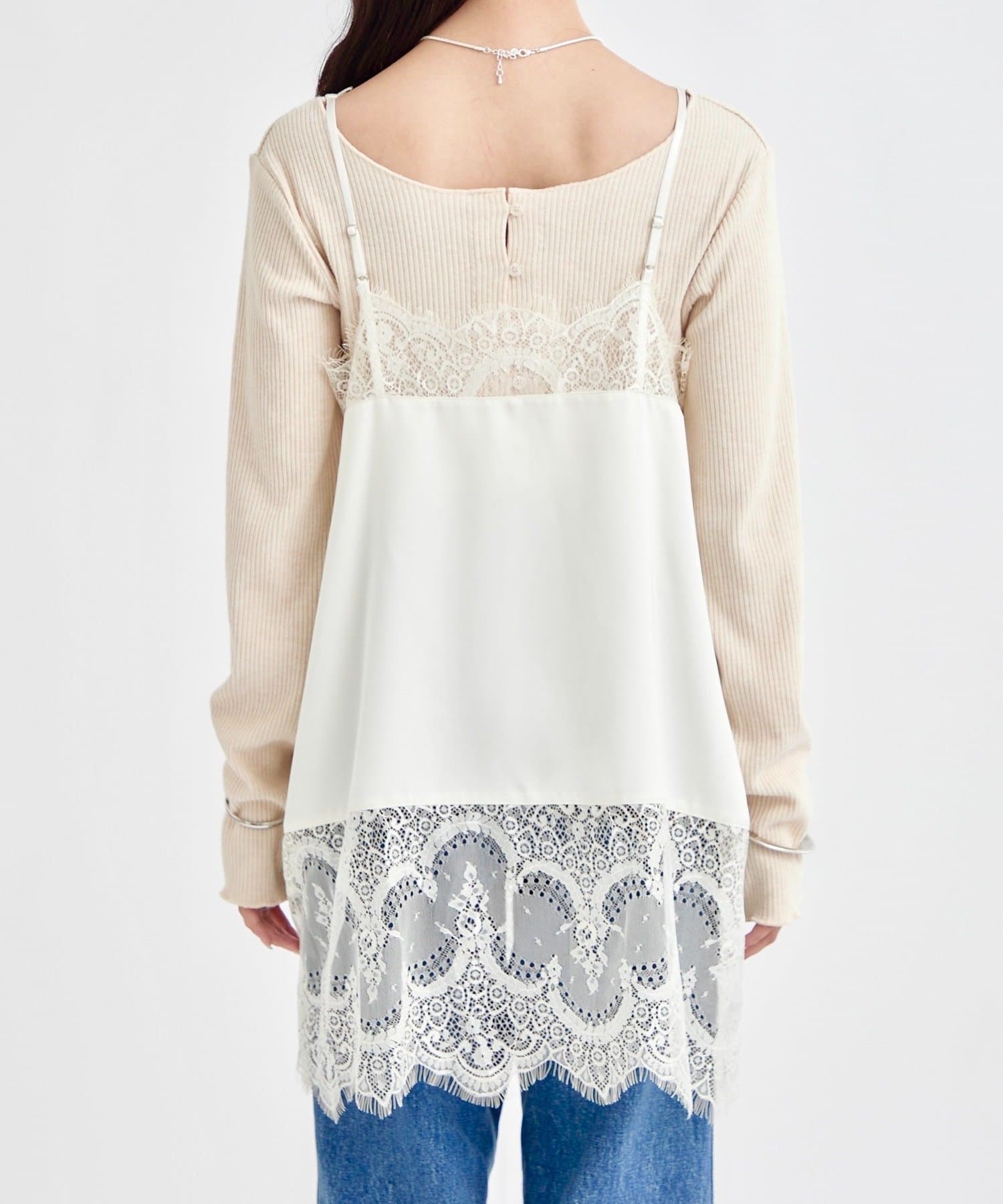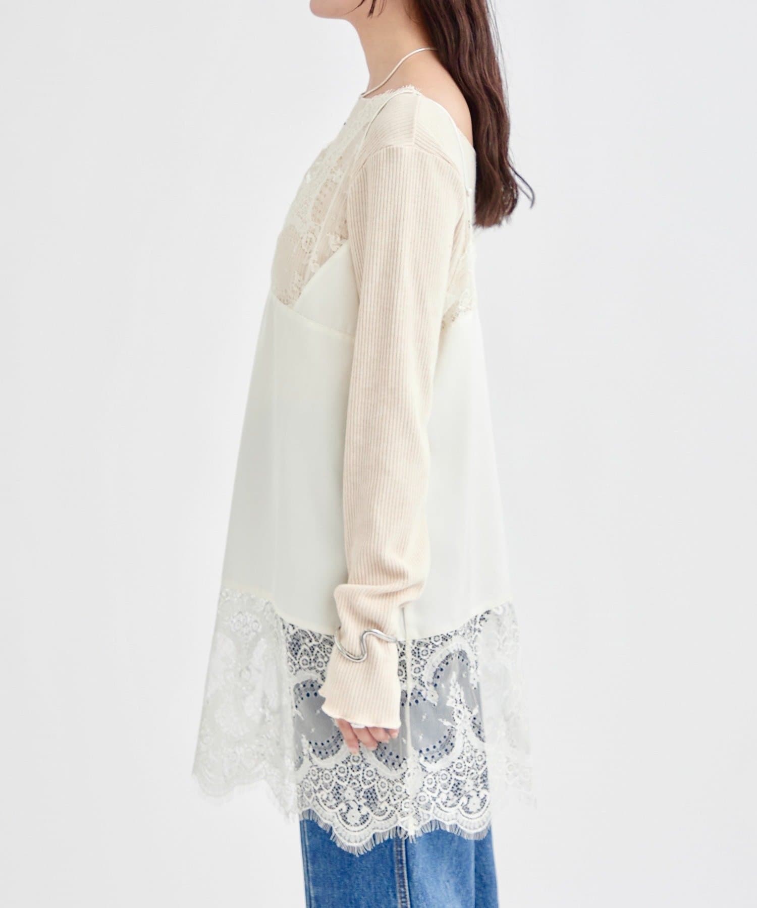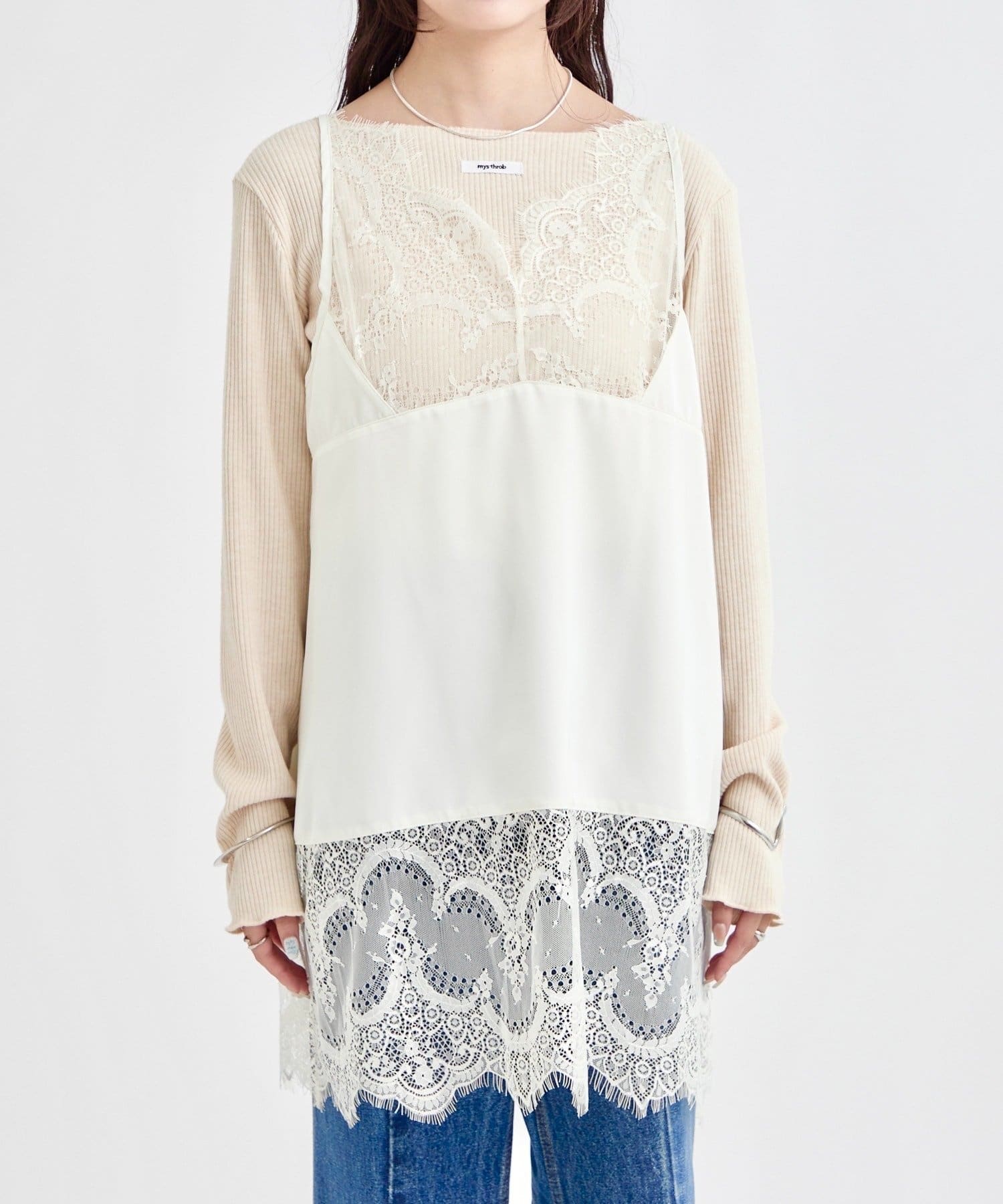 ・サテン生地×レースが今年らしいランジェリータッチなレイヤードアイテム。