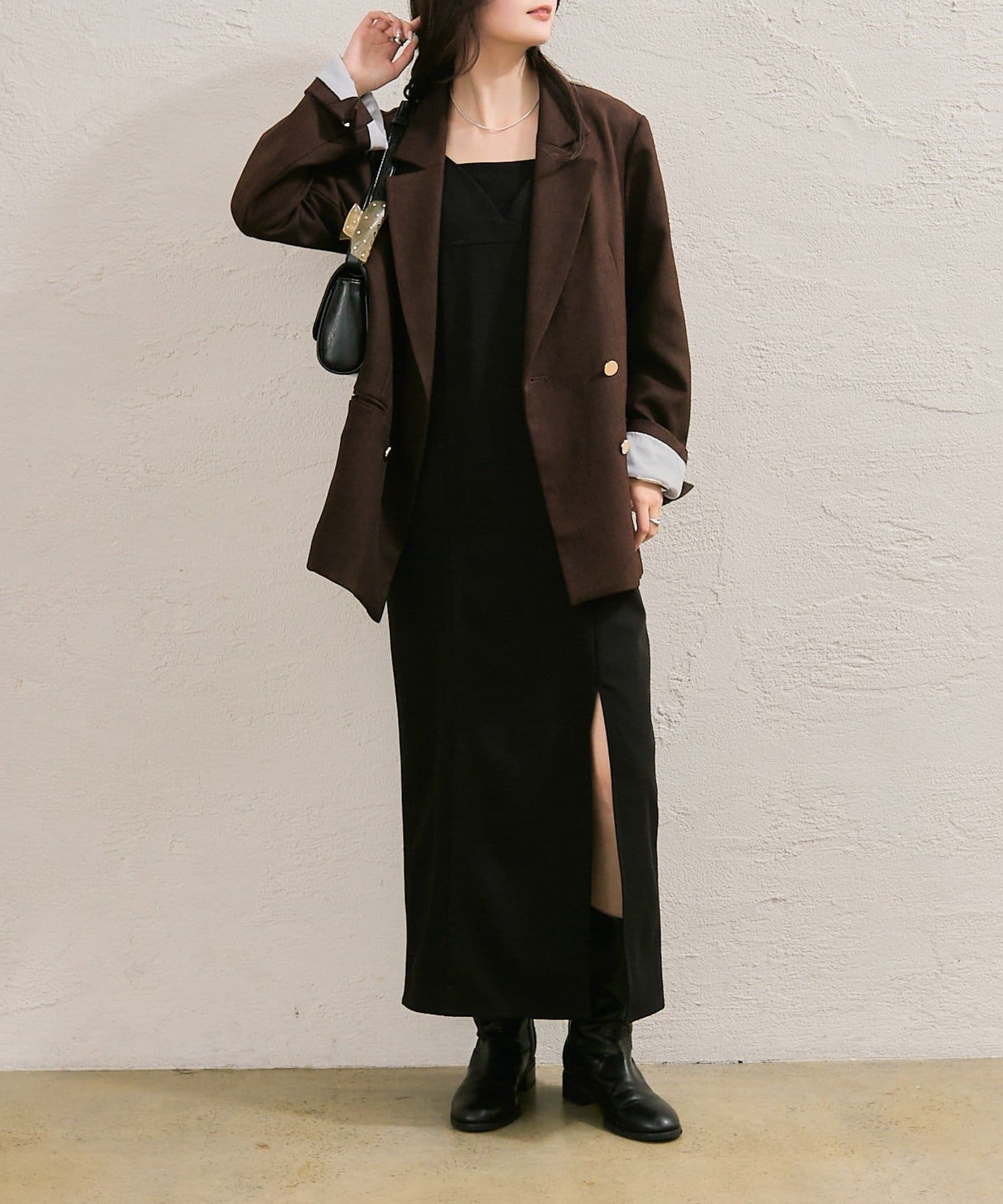 ・足元はブーツを合わせて、スリット部分からチラ見えさせてこなれ感を。
