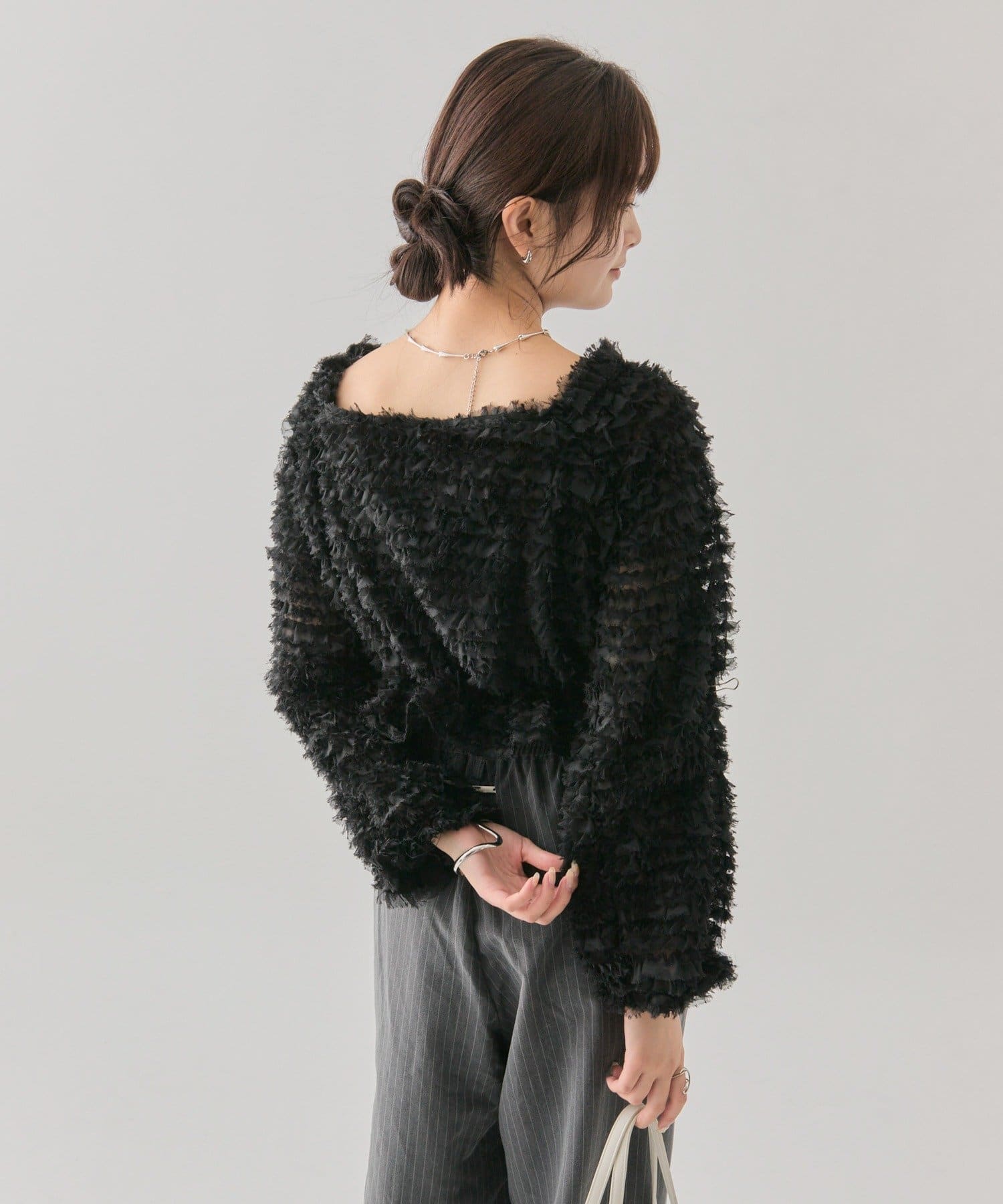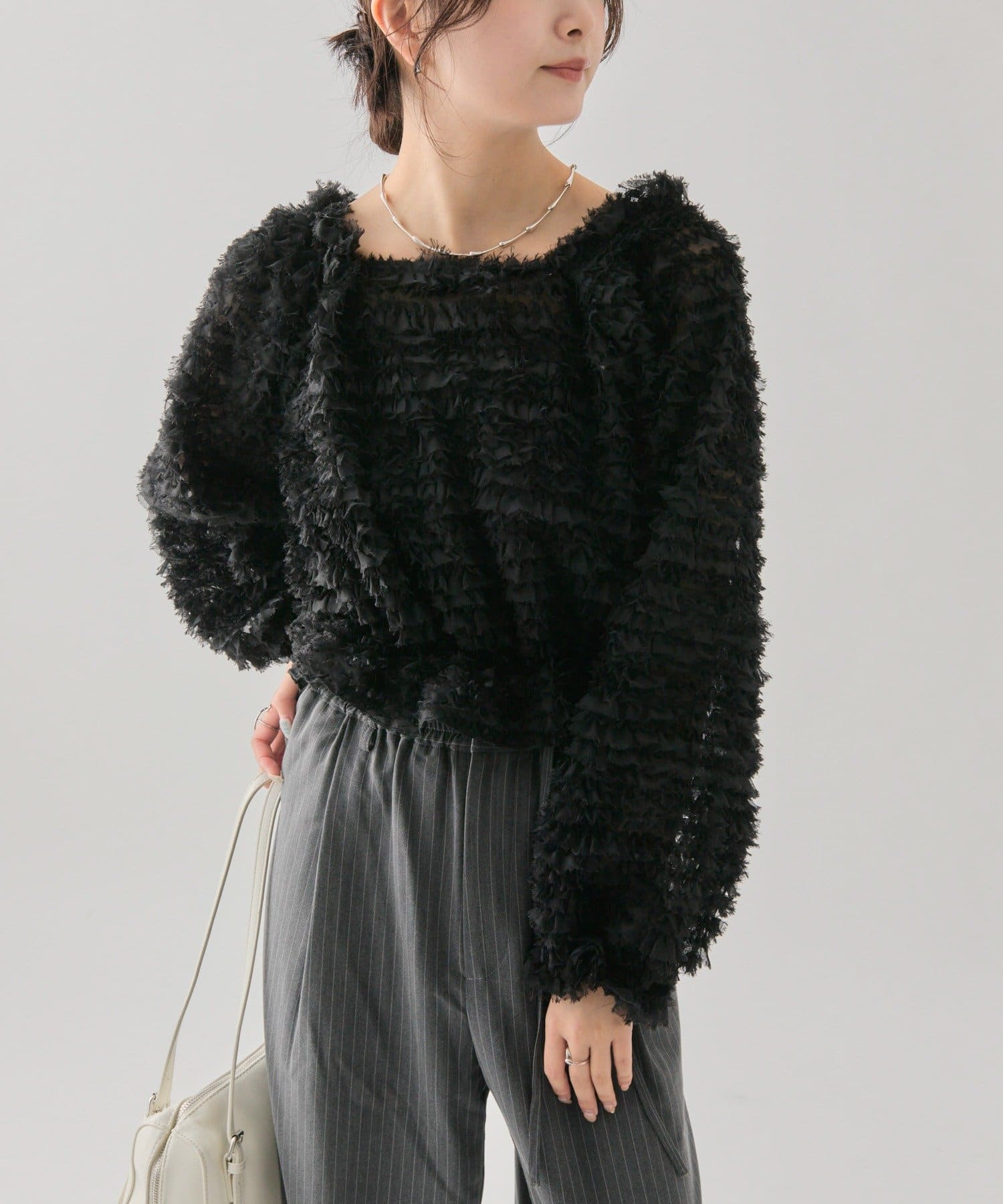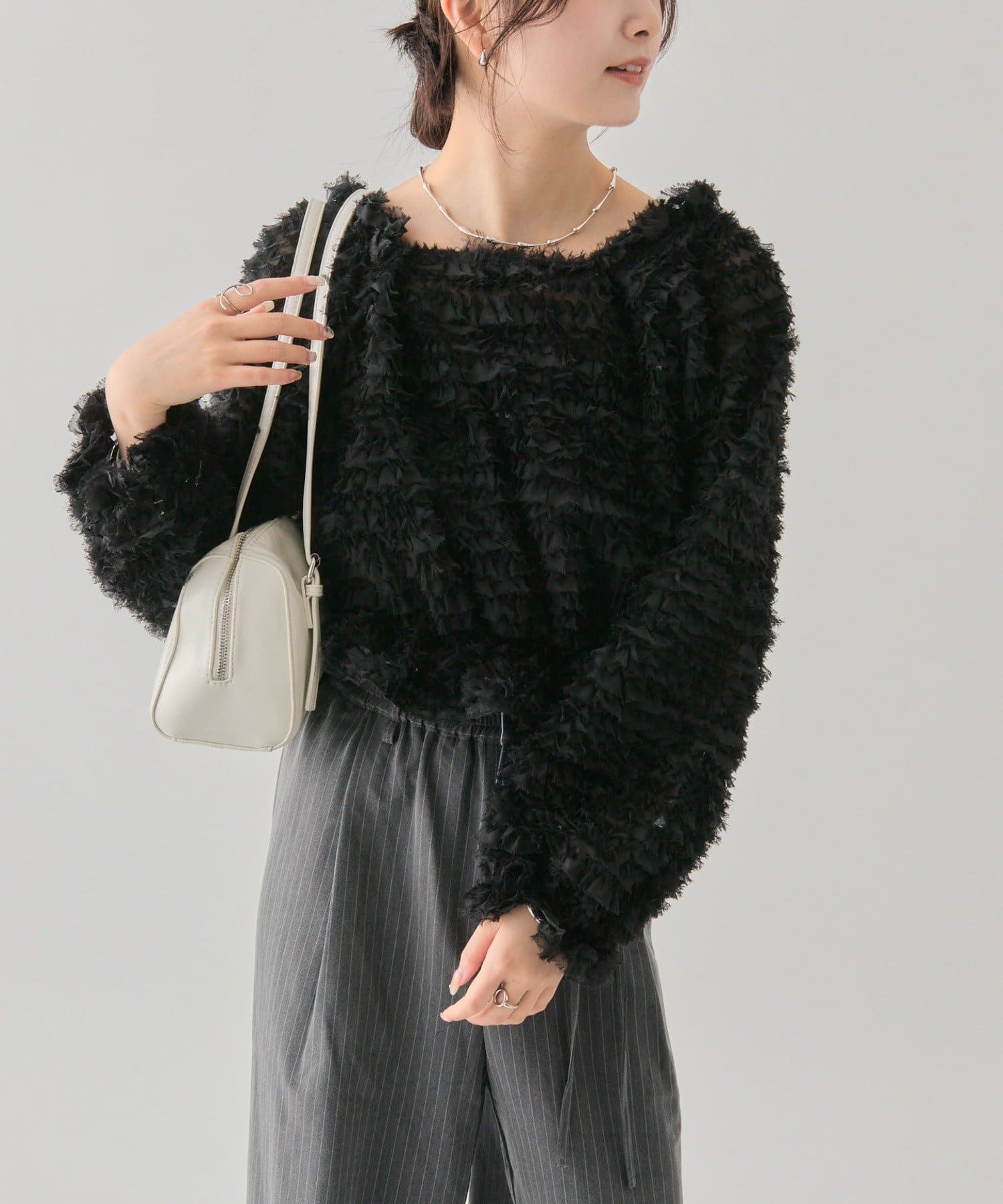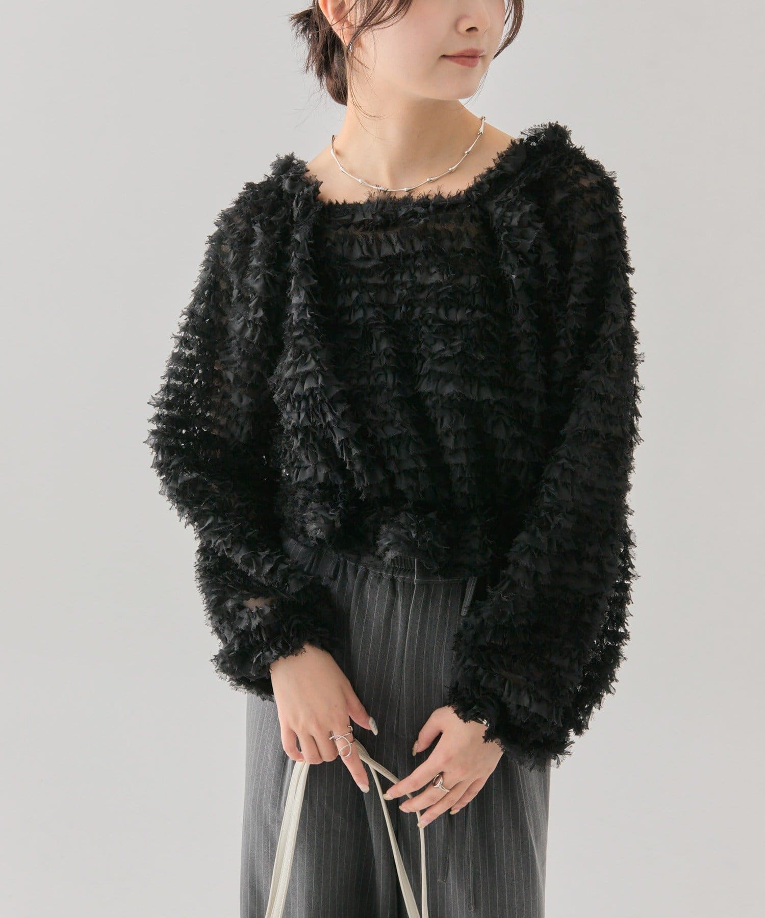 ・表面感のあるフリンジデザインで1枚で華やかな印象のブラウス。