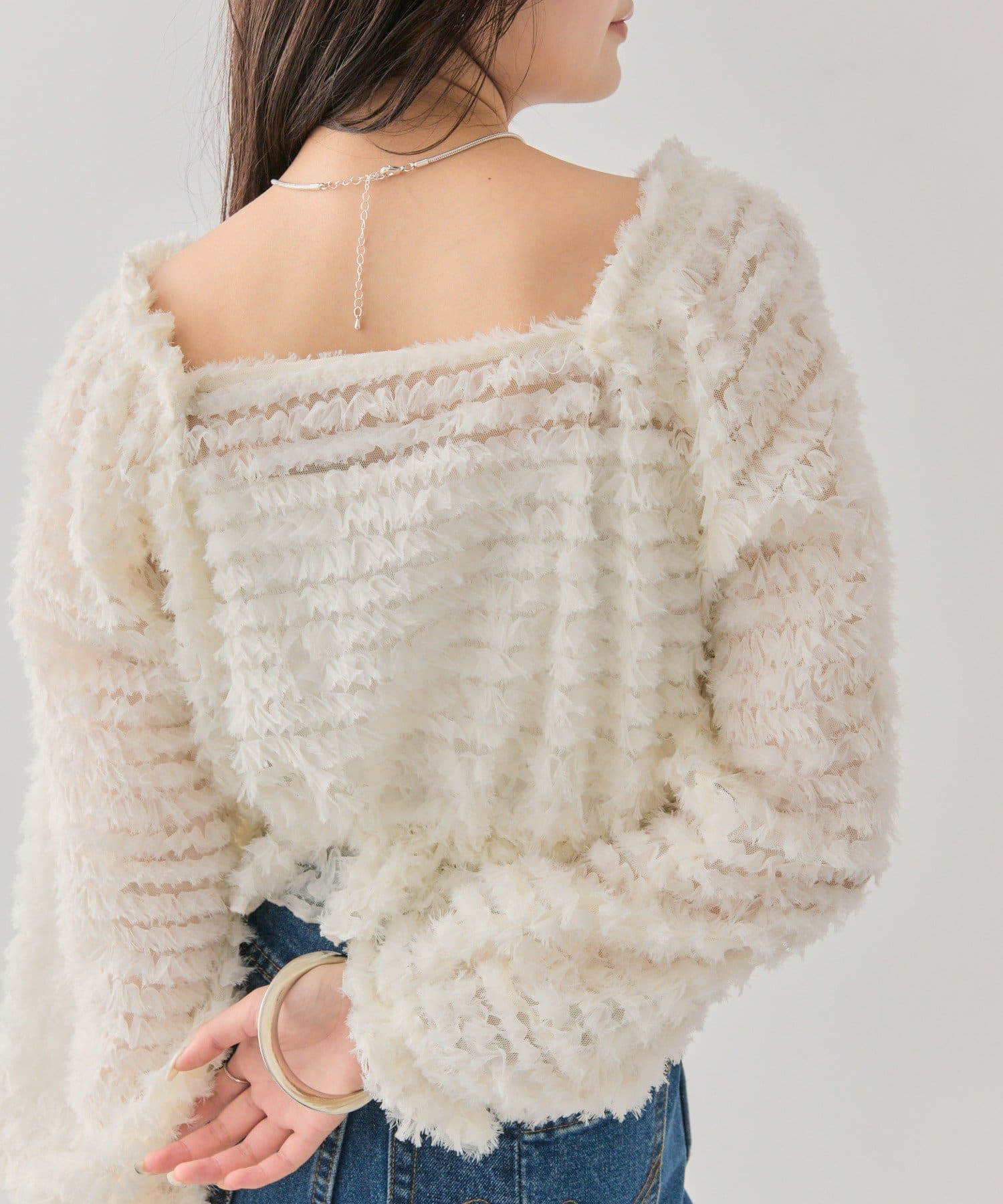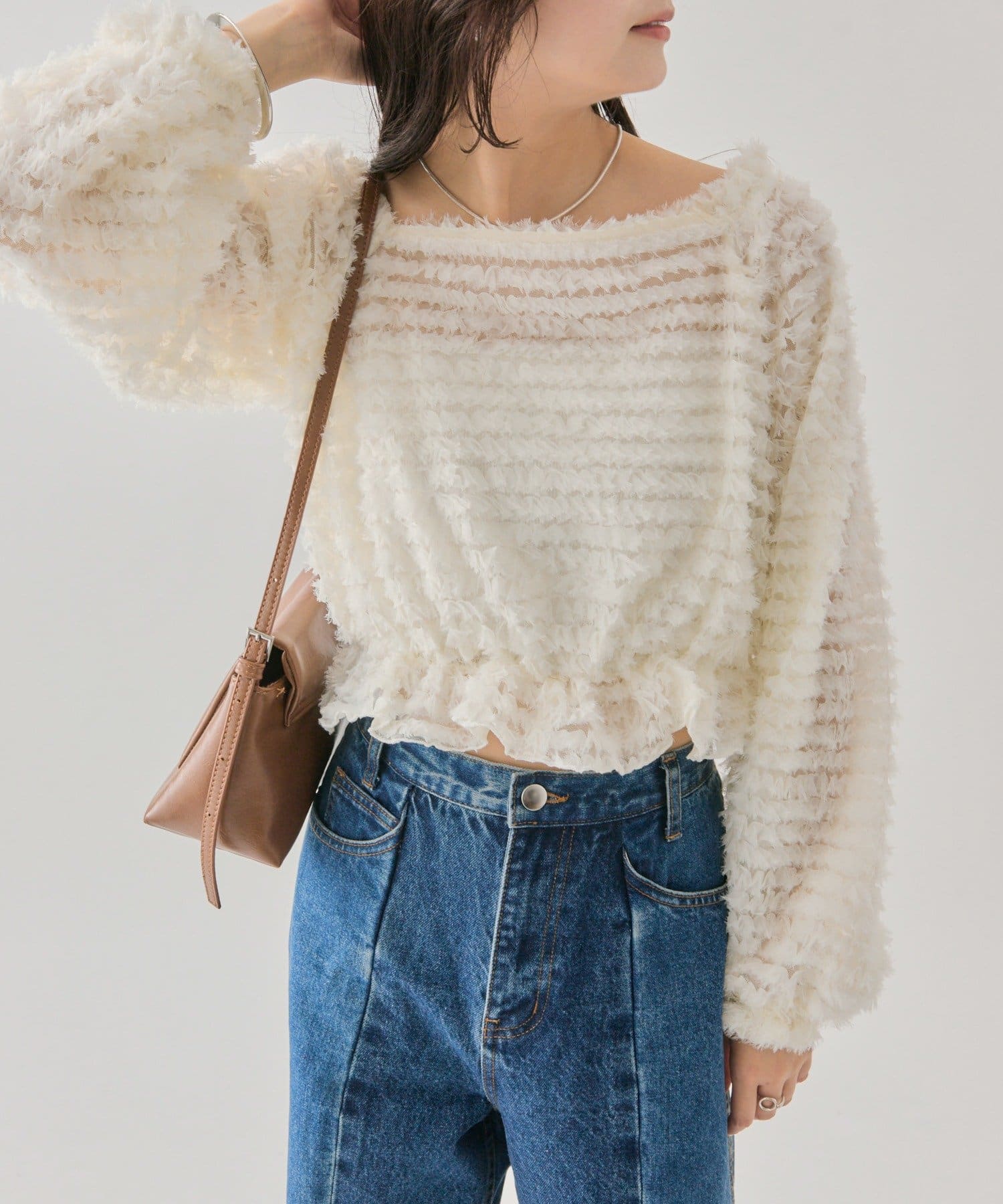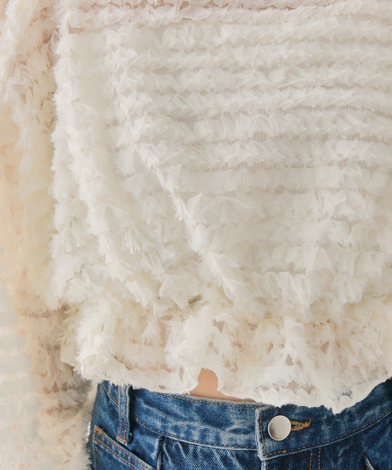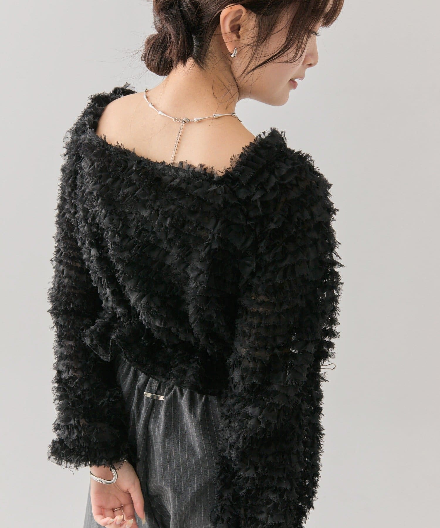 ・表面感のあるフリンジデザインで1枚で華やかな印象のブラウス。