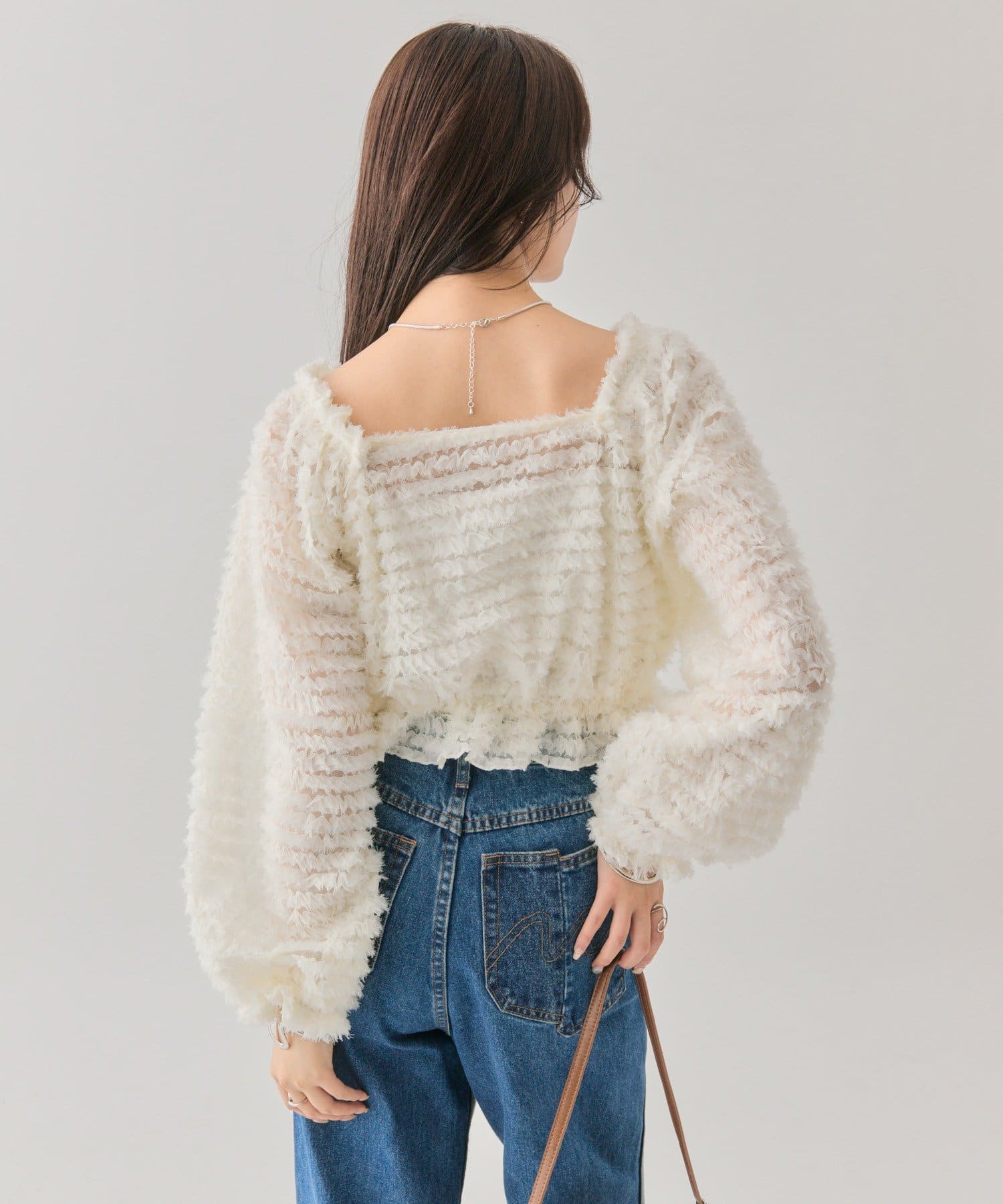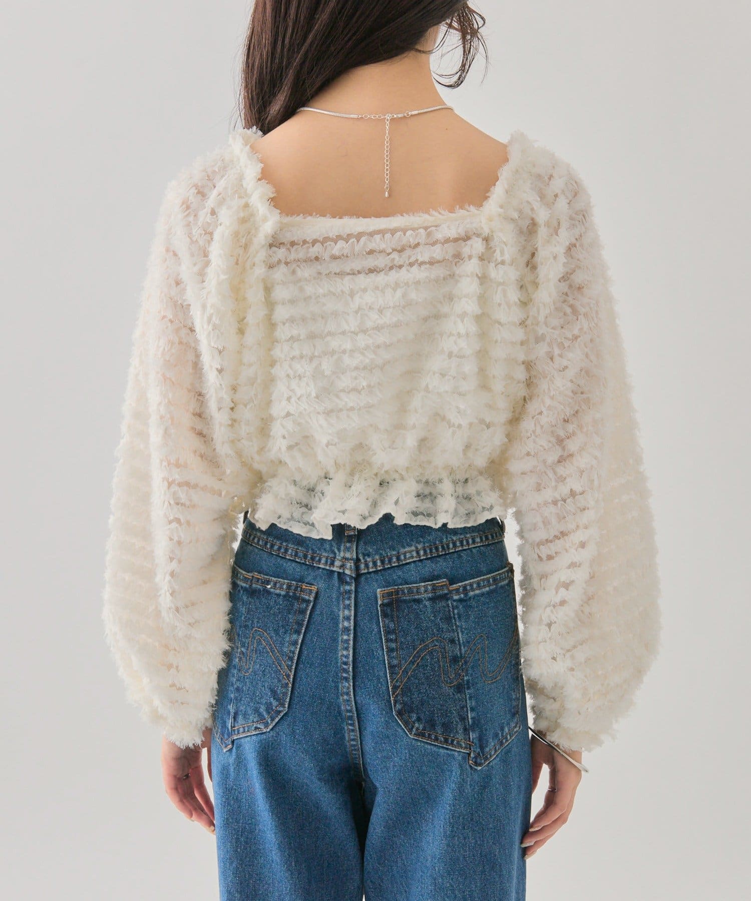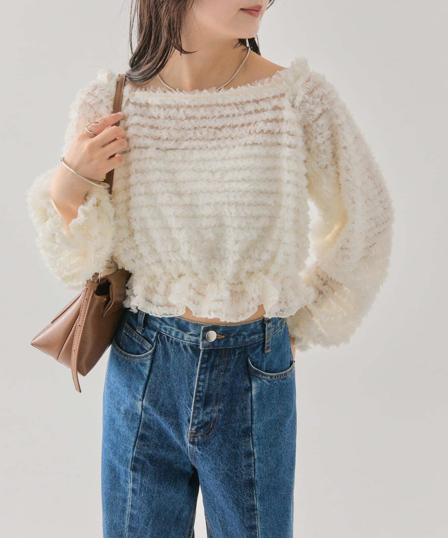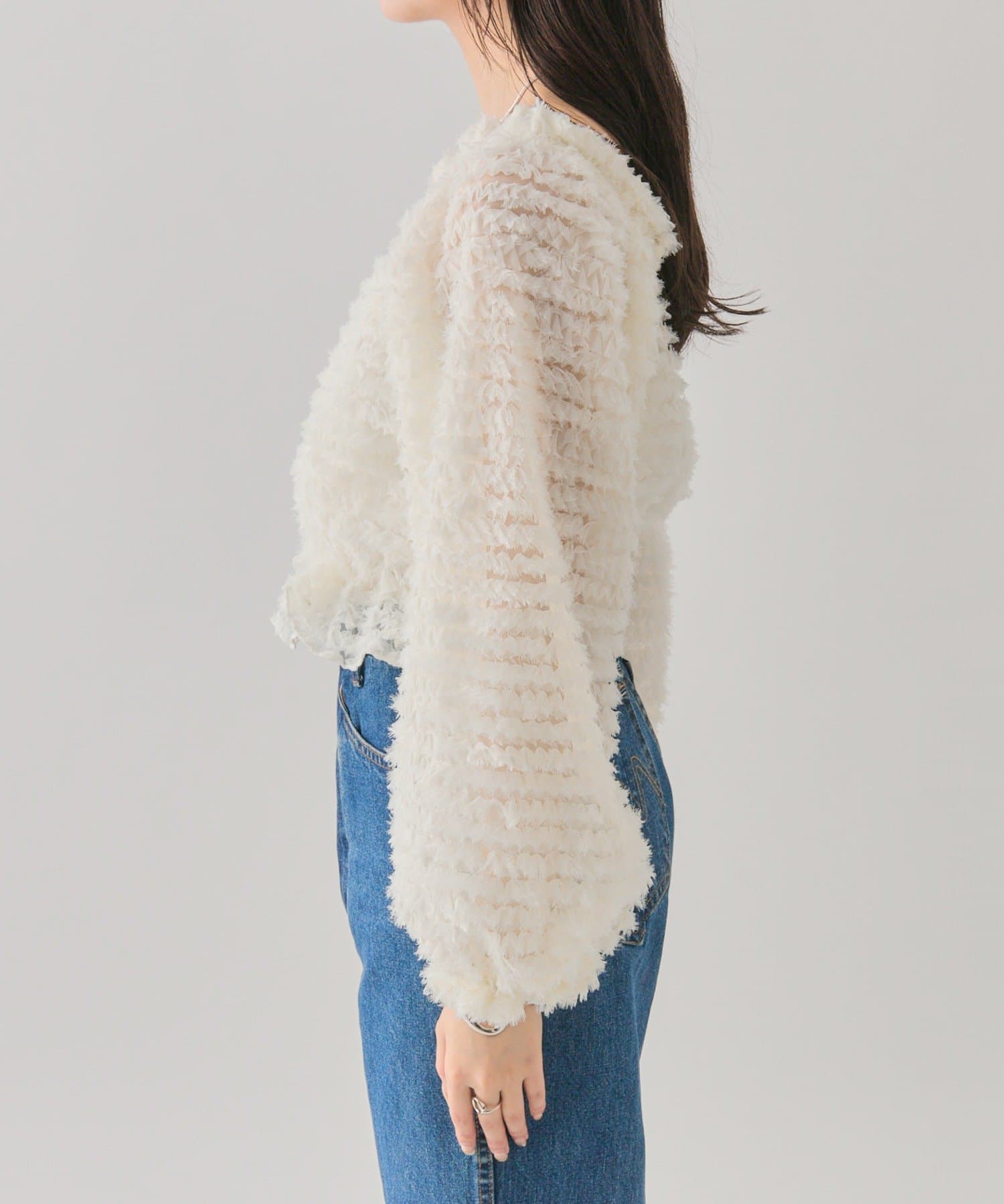 ・表面感のあるフリンジデザインで1枚で華やかな印象のブラウス。