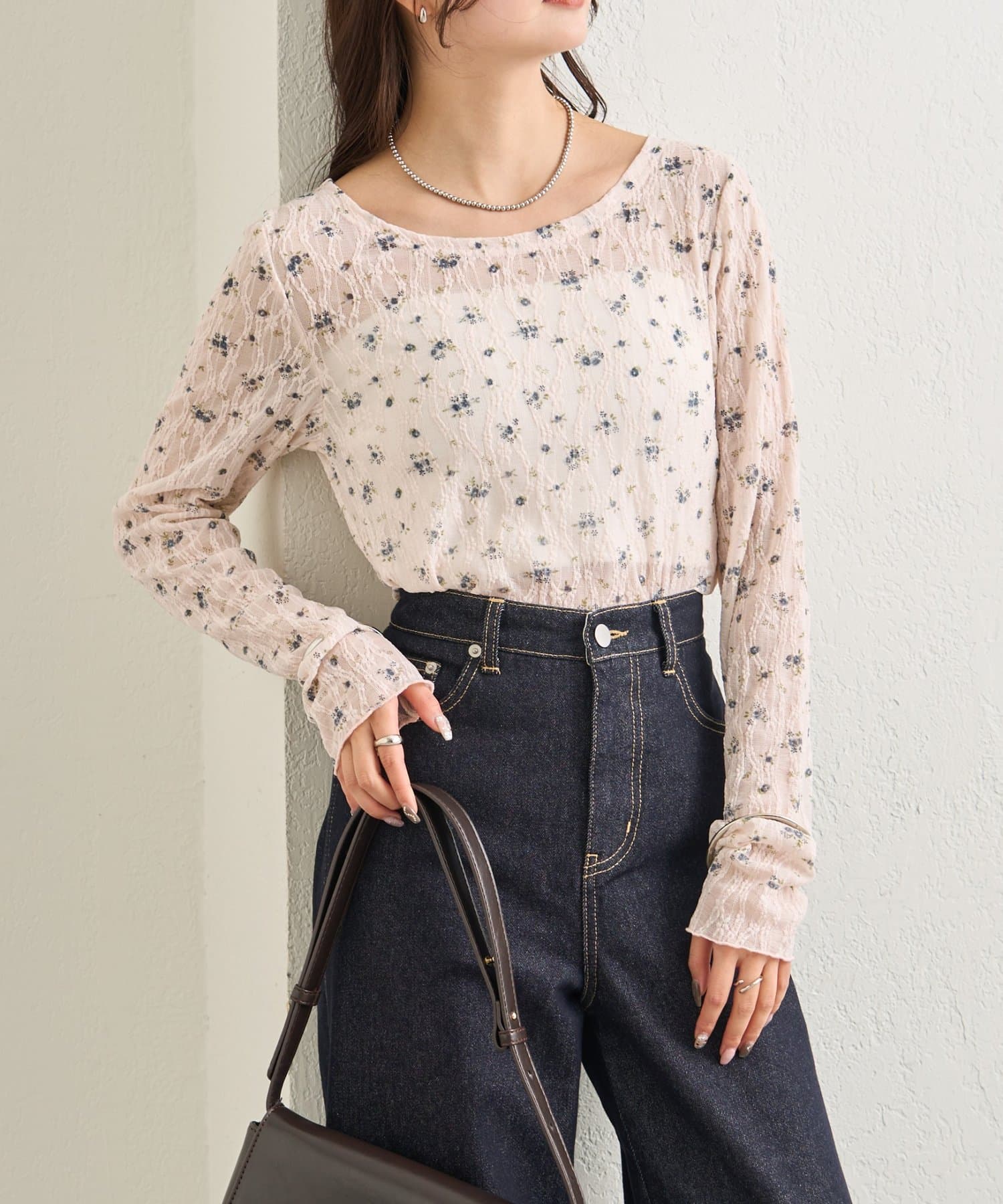 ほどよい透け感が可愛い!レイヤードスタイルにも活躍するレース花柄シアーロンT