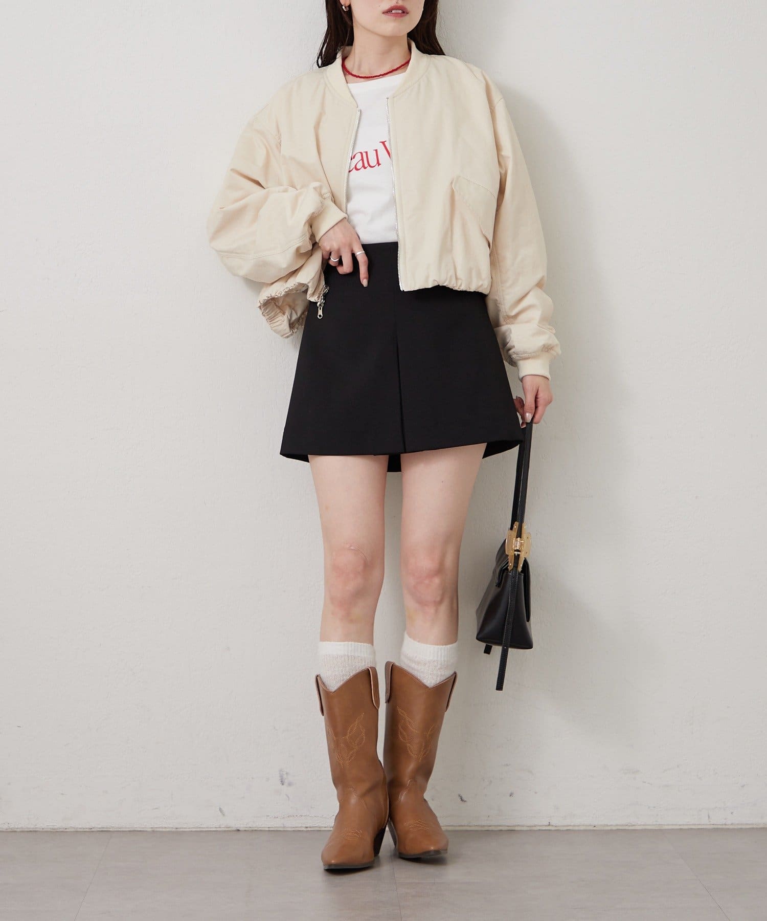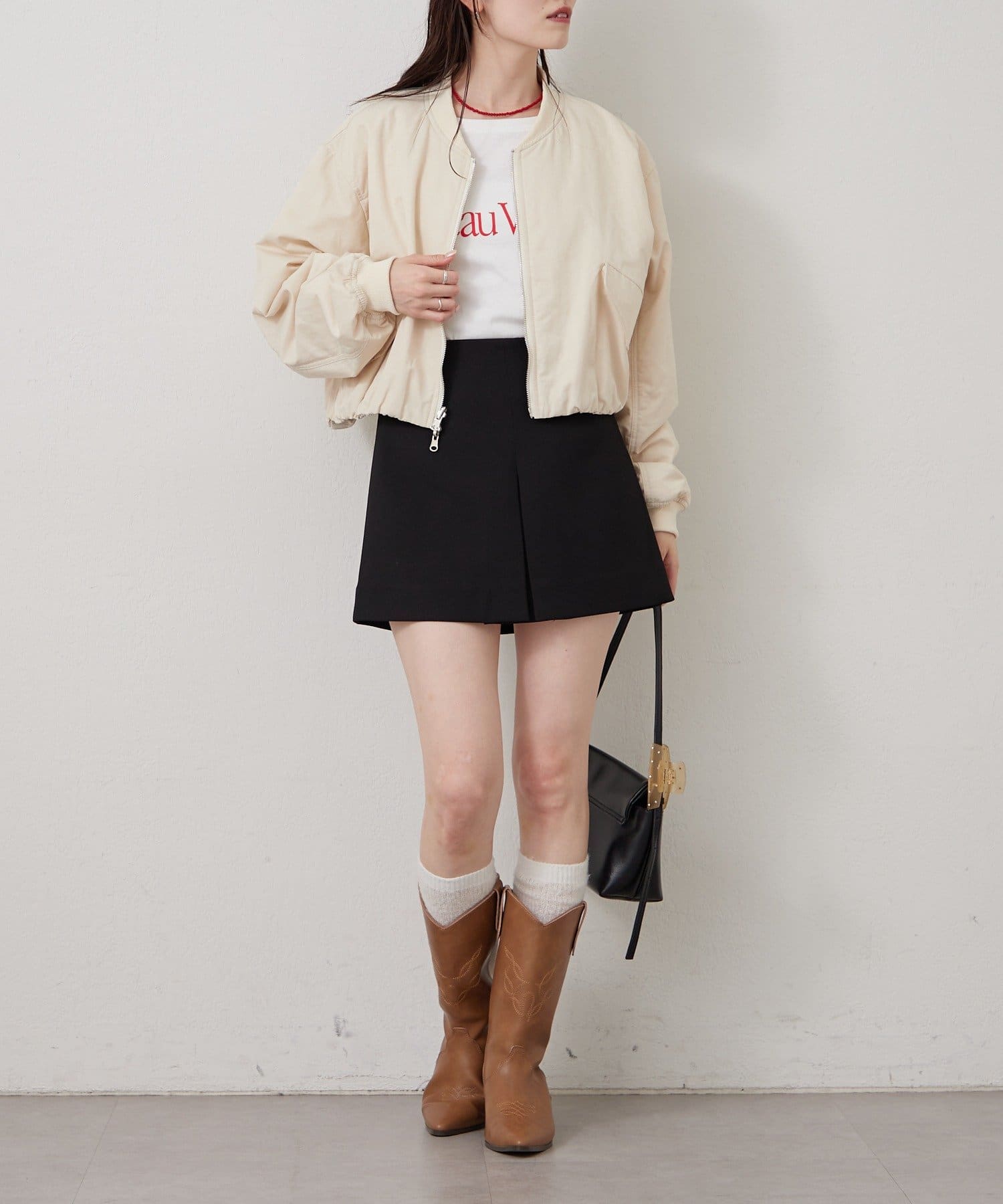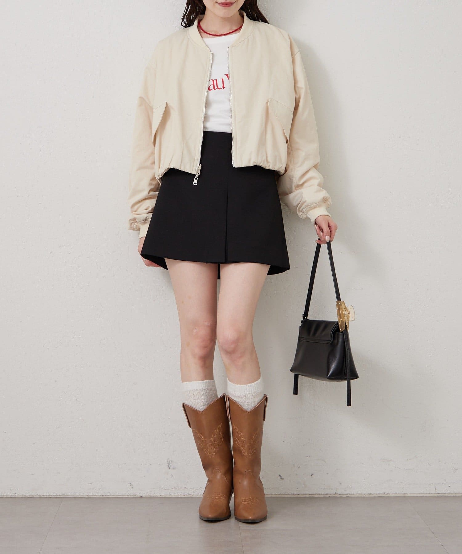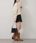 ・ミニボトムにブーツを合わせてフェミニンなスタイルも◎
