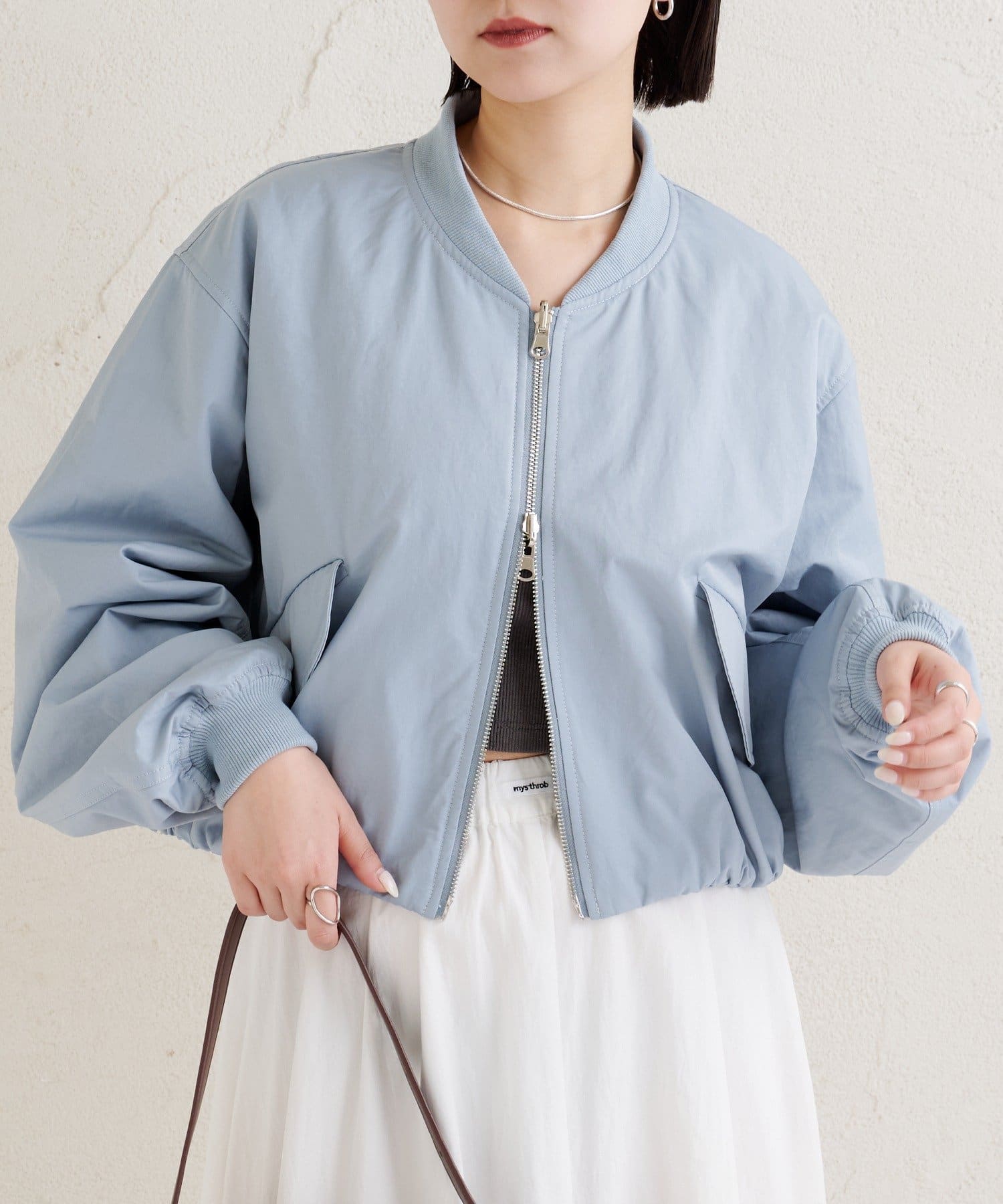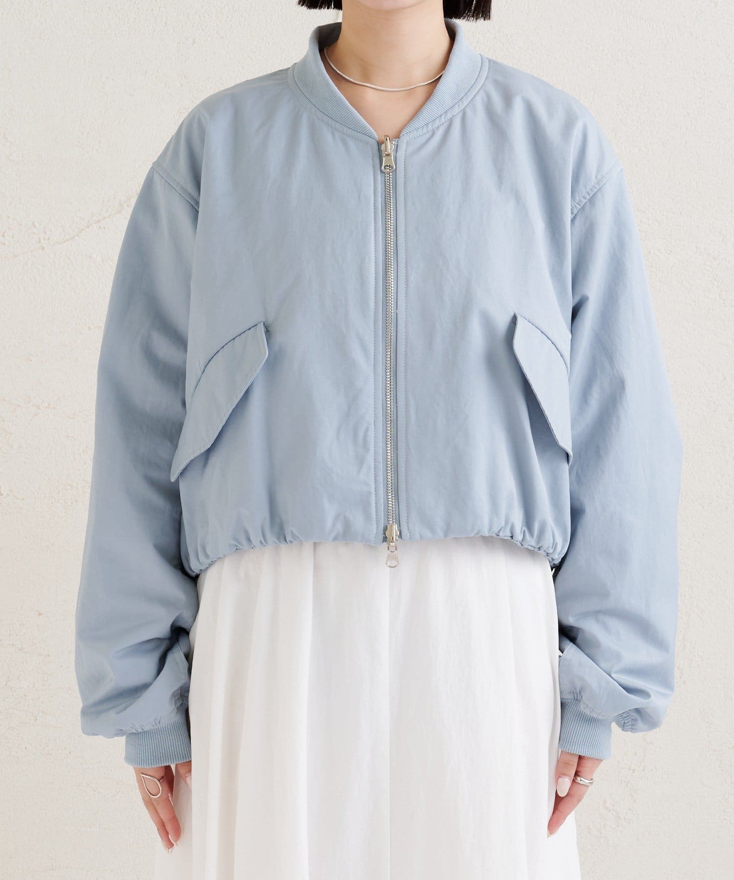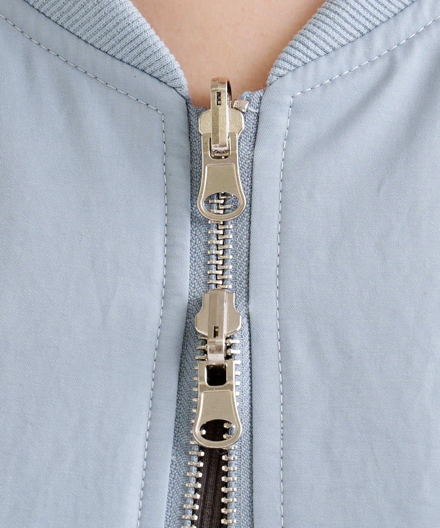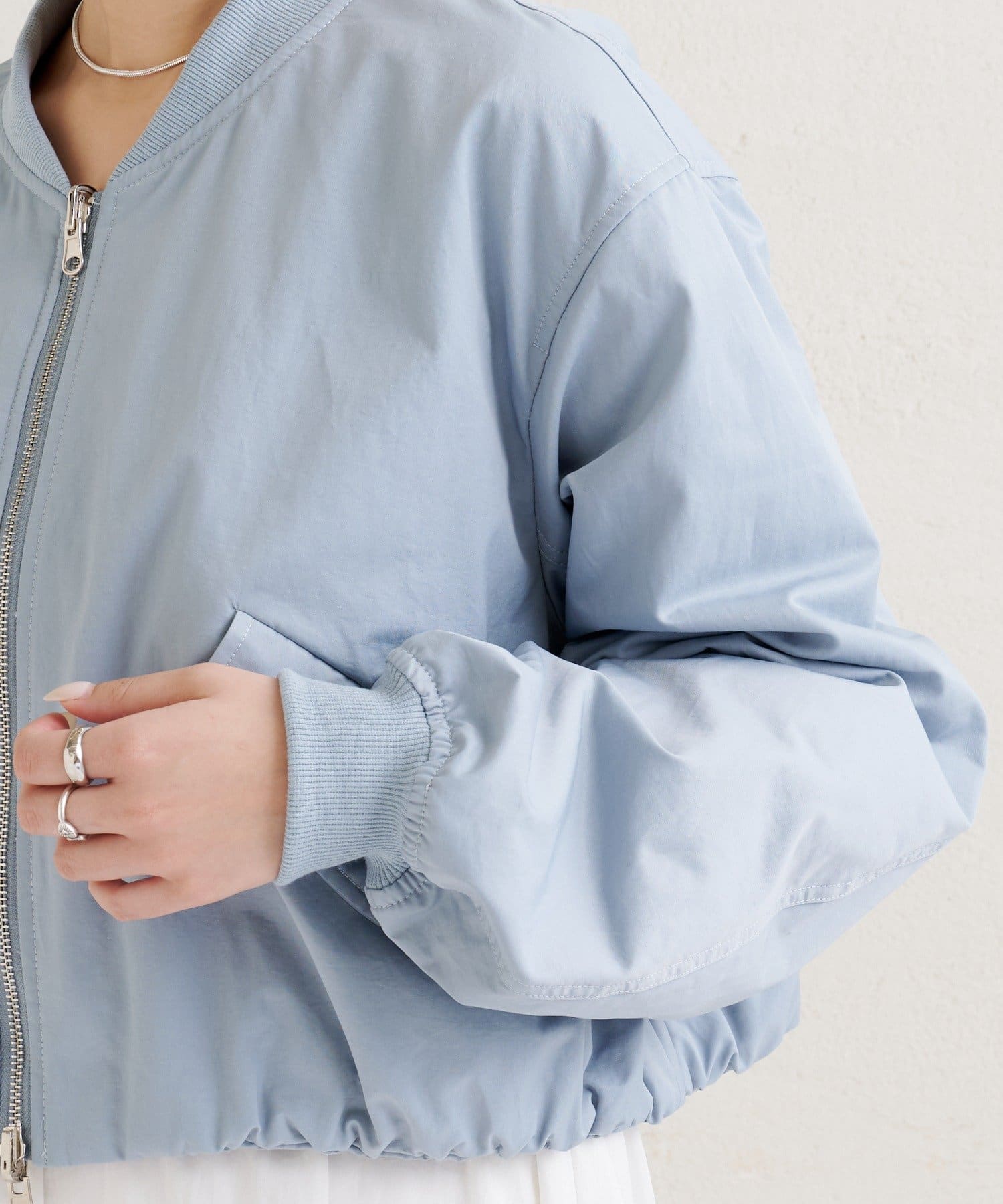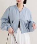 ・サテン素材ならではの光沢感が魅力のブルゾン。