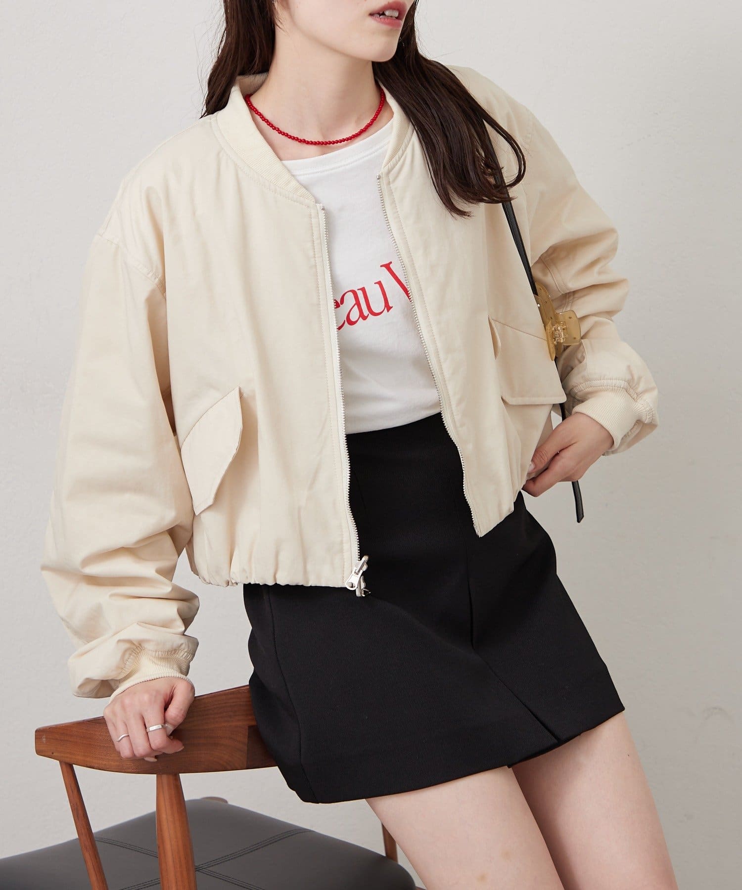 程よいサテンのツヤ感が上品さをプラスしてくれるショートブルゾン