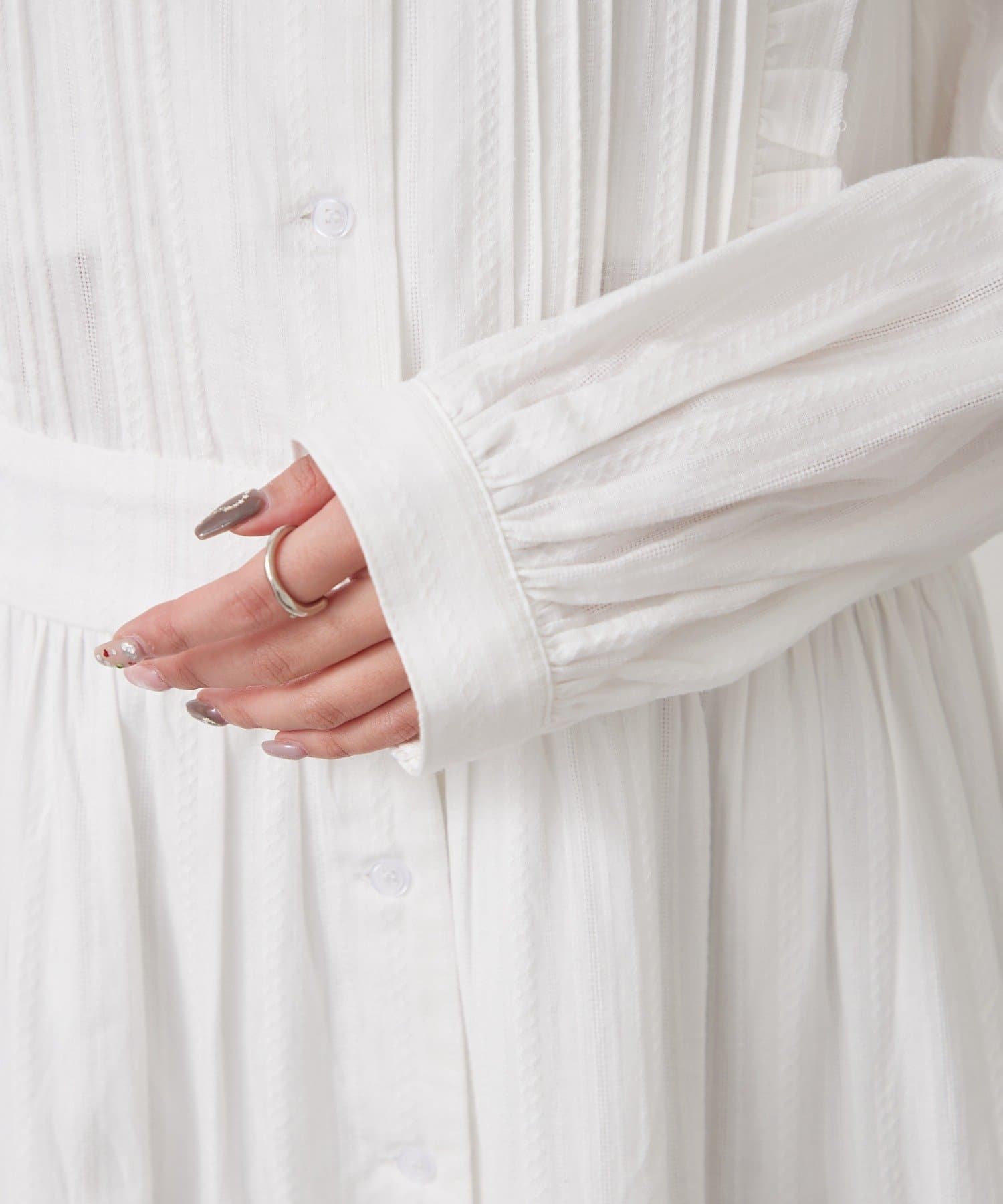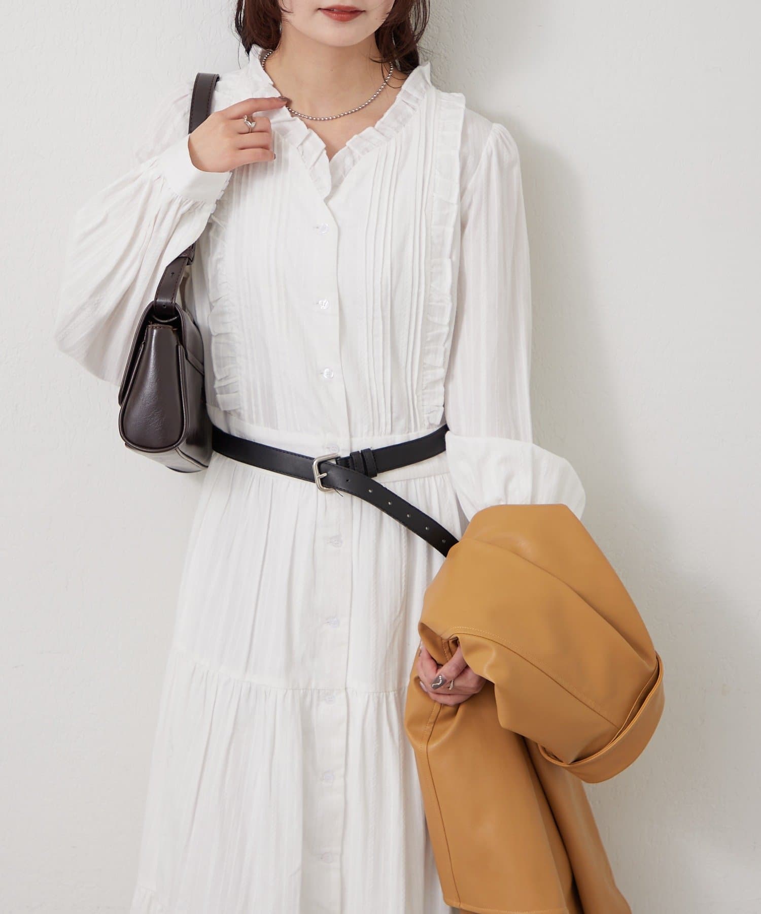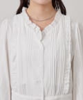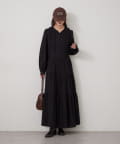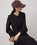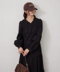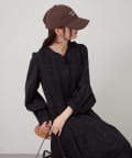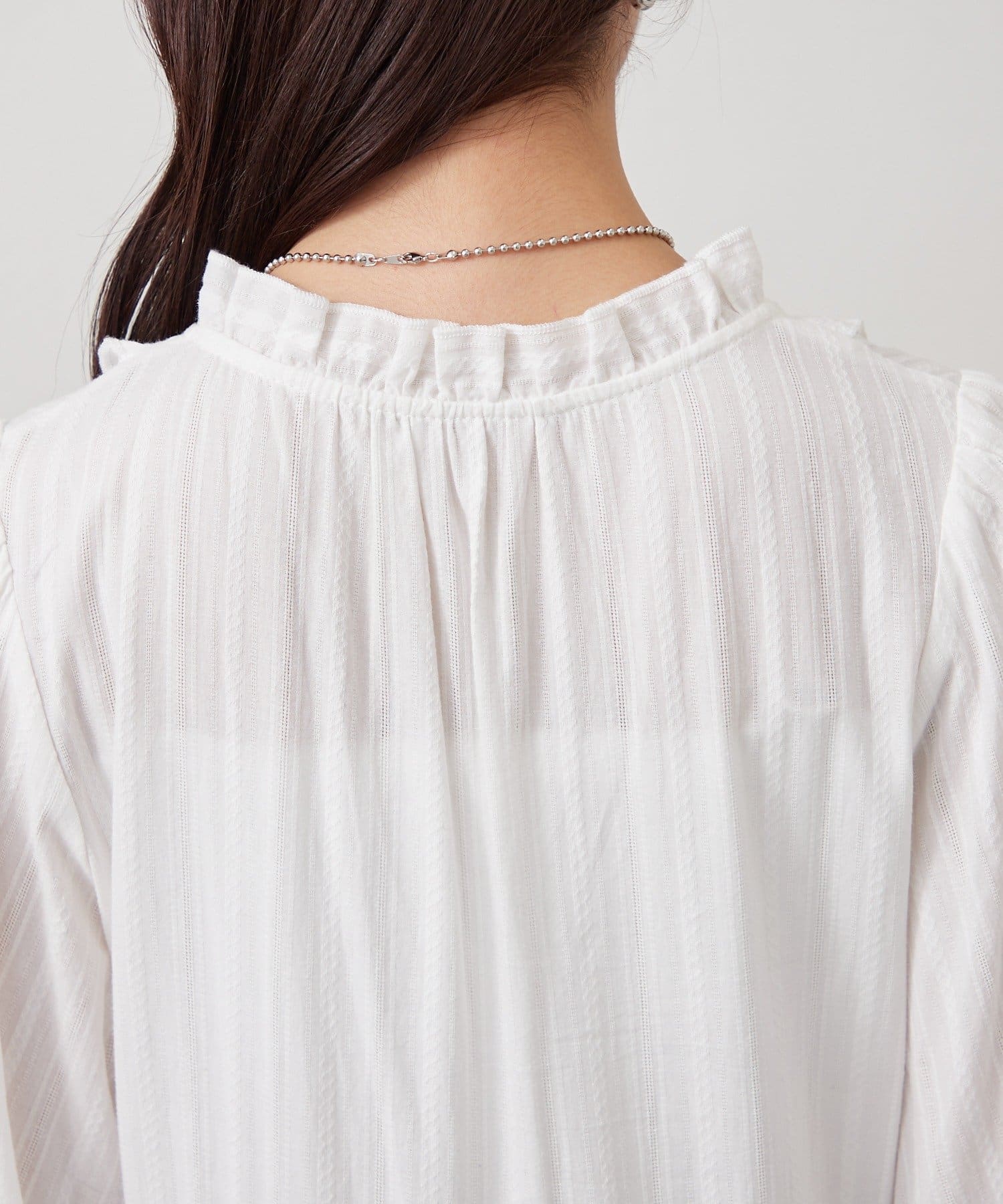 ・首元やす論と部分にあしらわれたフリルが柔らかいニュアンスをプラスし、大人の可愛さを演習。