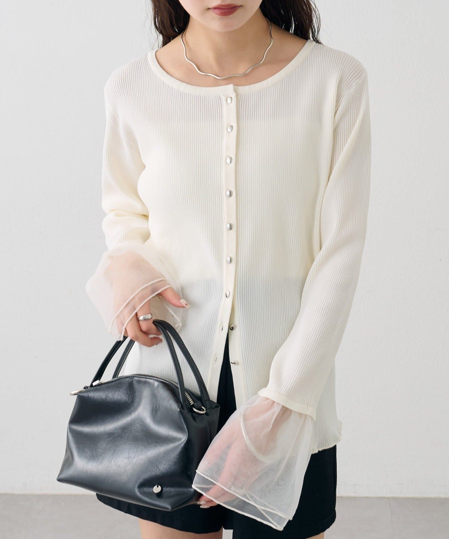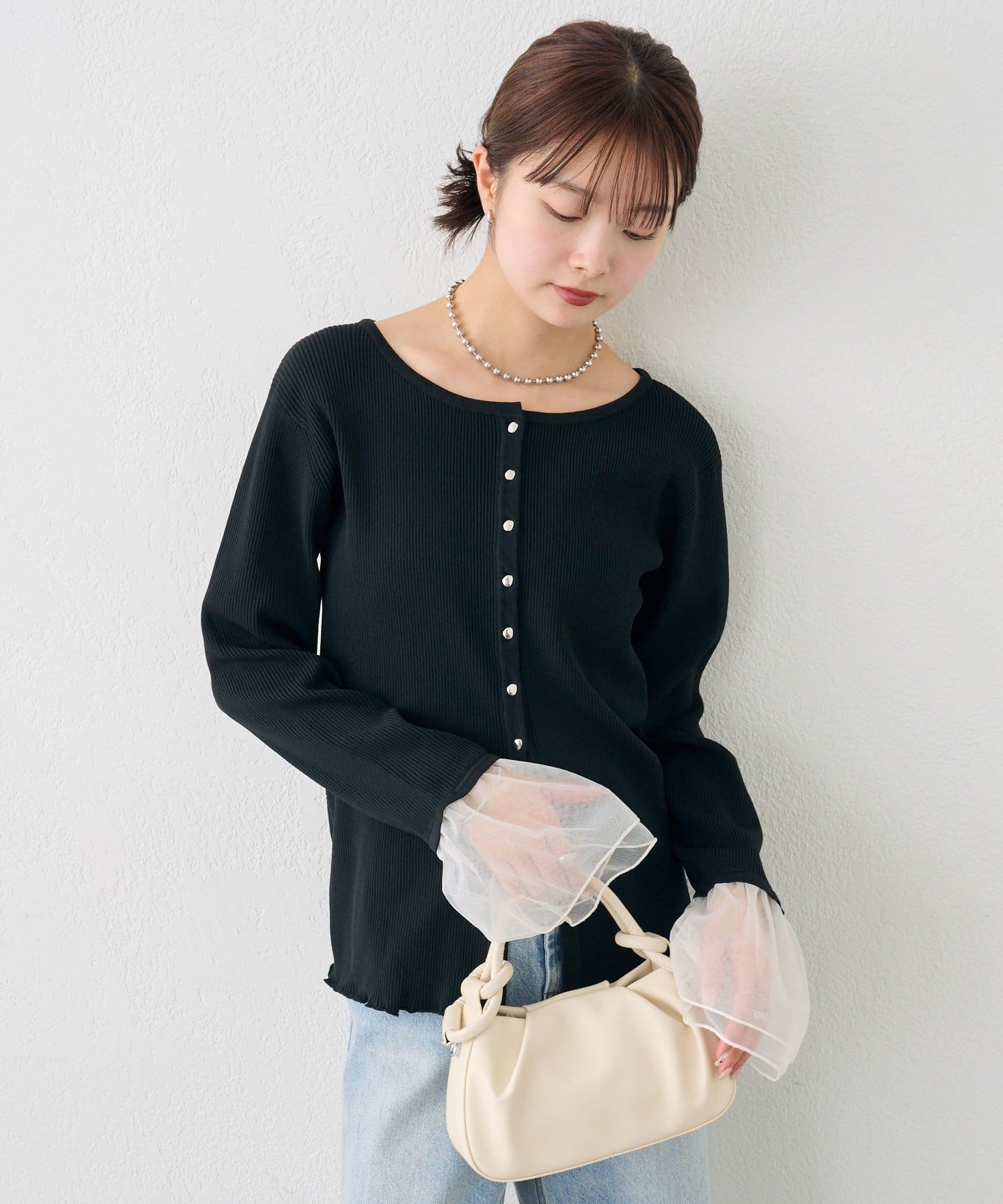 袖のチュールが華やかさをプラスするリブカーディガン